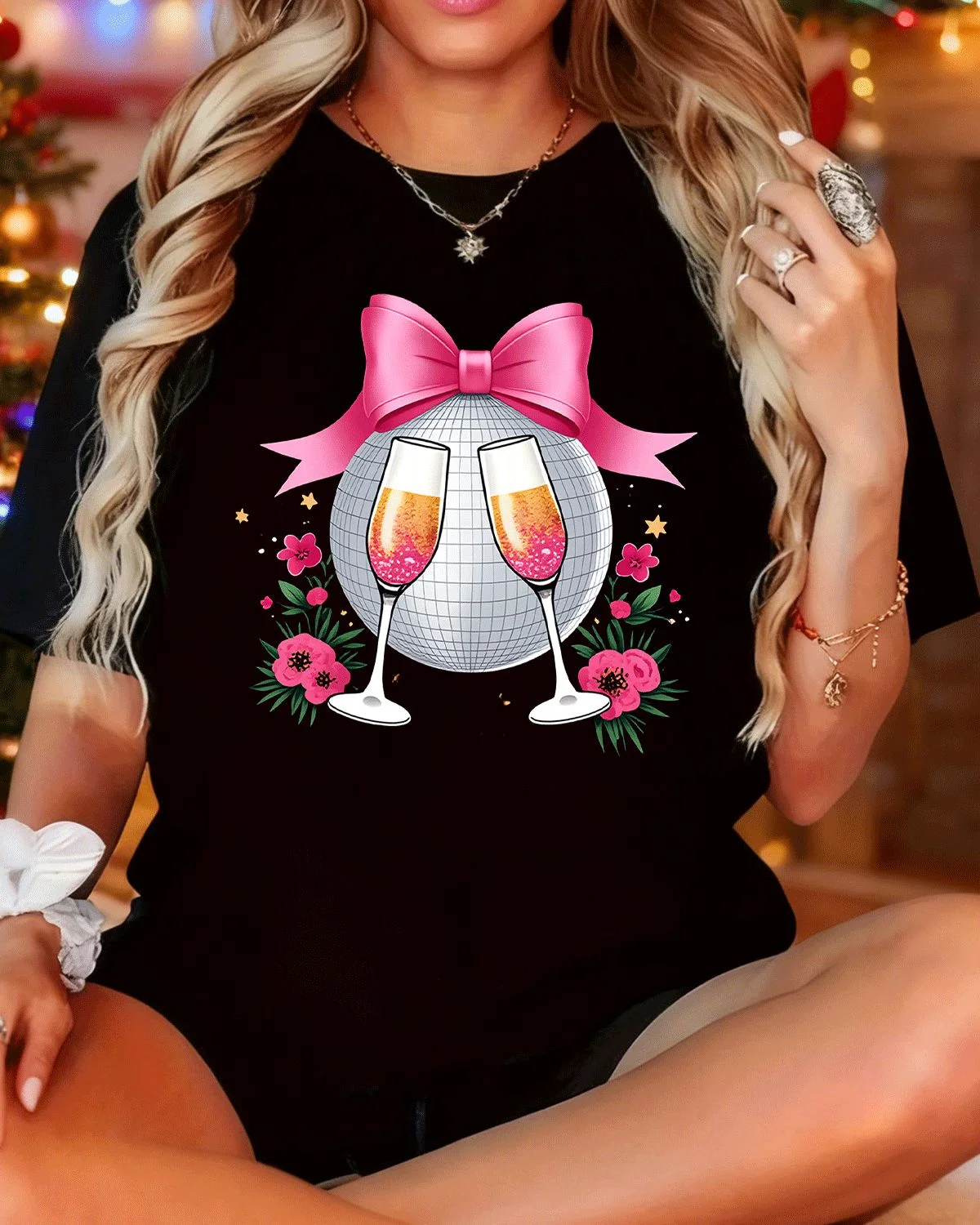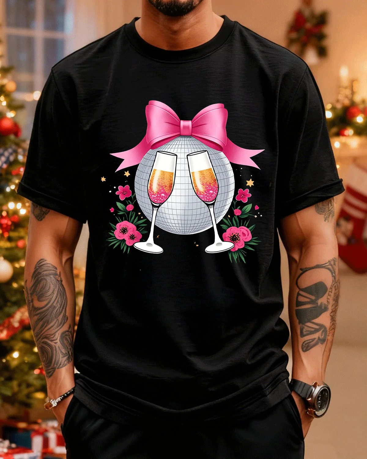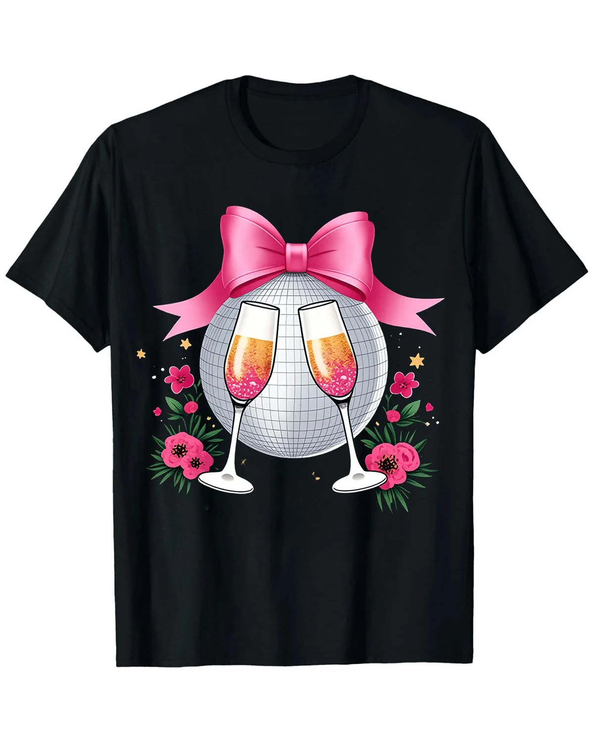 New Year Disco Ball with Champagne Glasses Summer Cotton Graphic T Shirt - Trendy Chic, Short Sleeve, Soft Fabric, Comfortable Fit