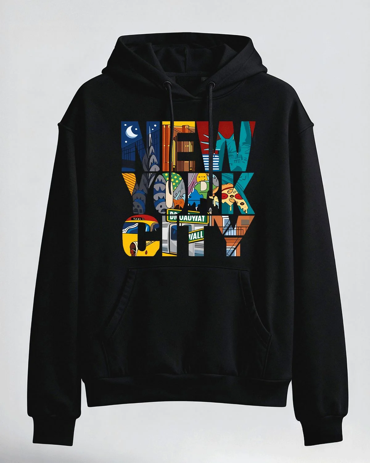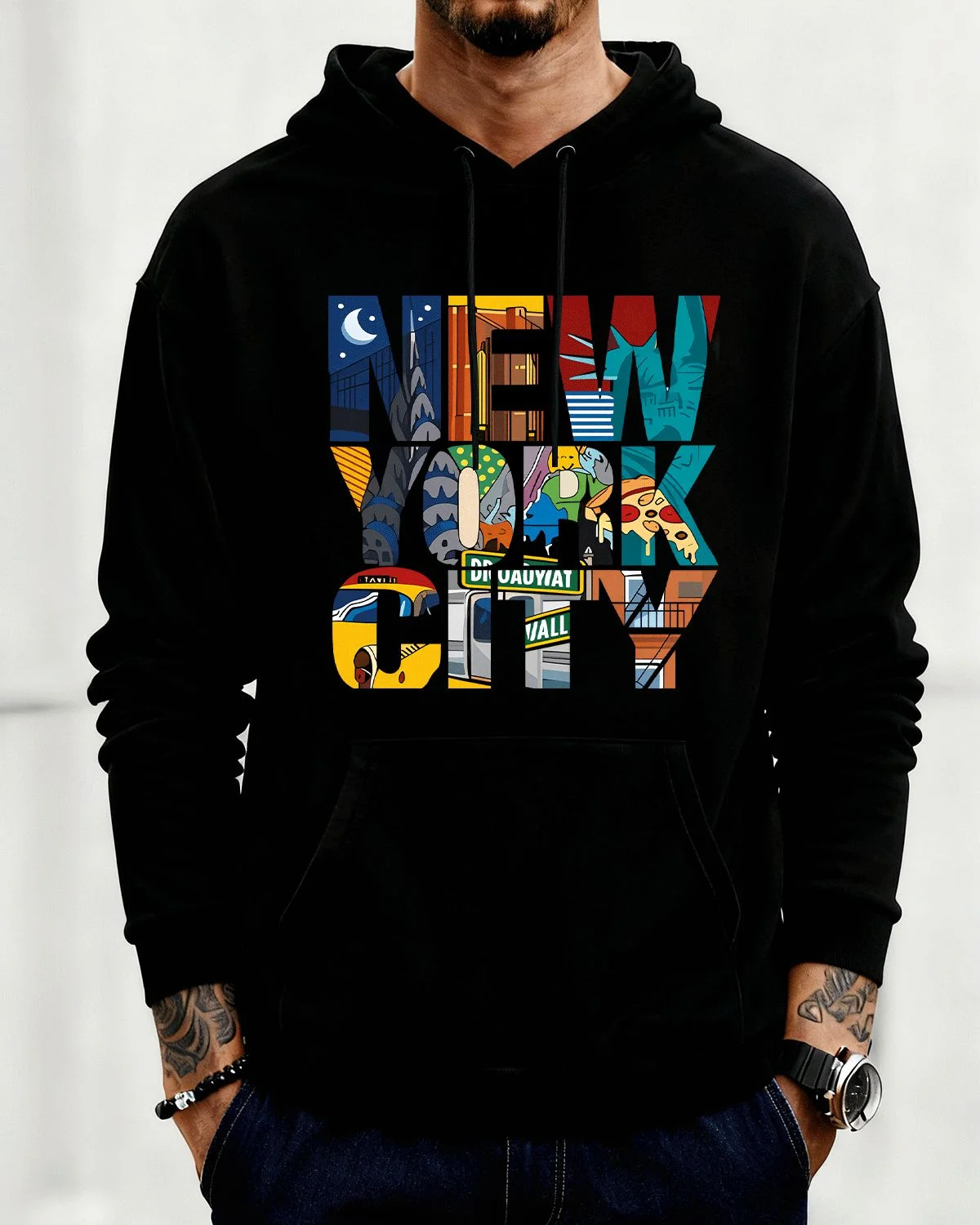 New York City Landmarks and Food Cozy Cotton Graphic Hoodie with Pocket-Urban Artistic,Long Sleeve,Soft Fabric,Comfortable Fit