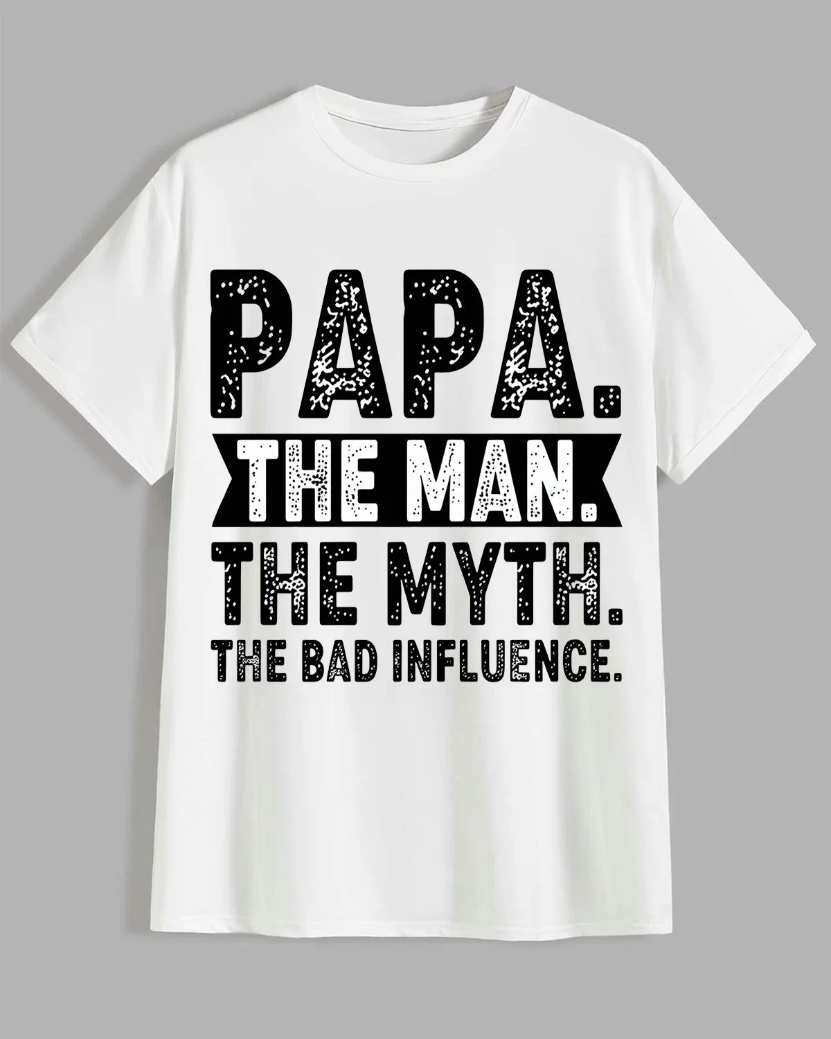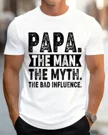 Papa Dad The Man The Myth The Bad Influence Summer Cotton Graphic T Shirt - Funny Retro, Short Sleeve, Soft Fabric, Comfortable Fit