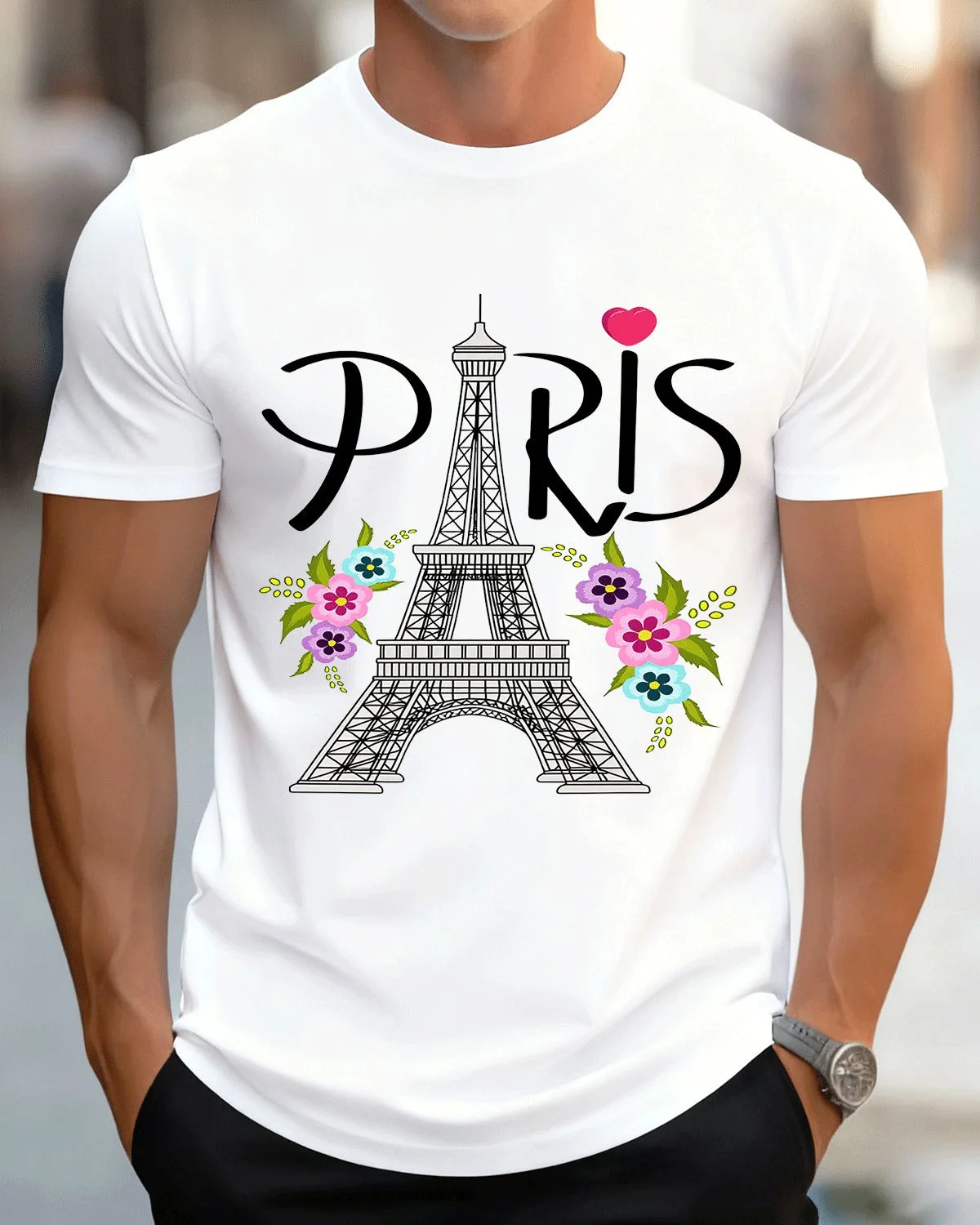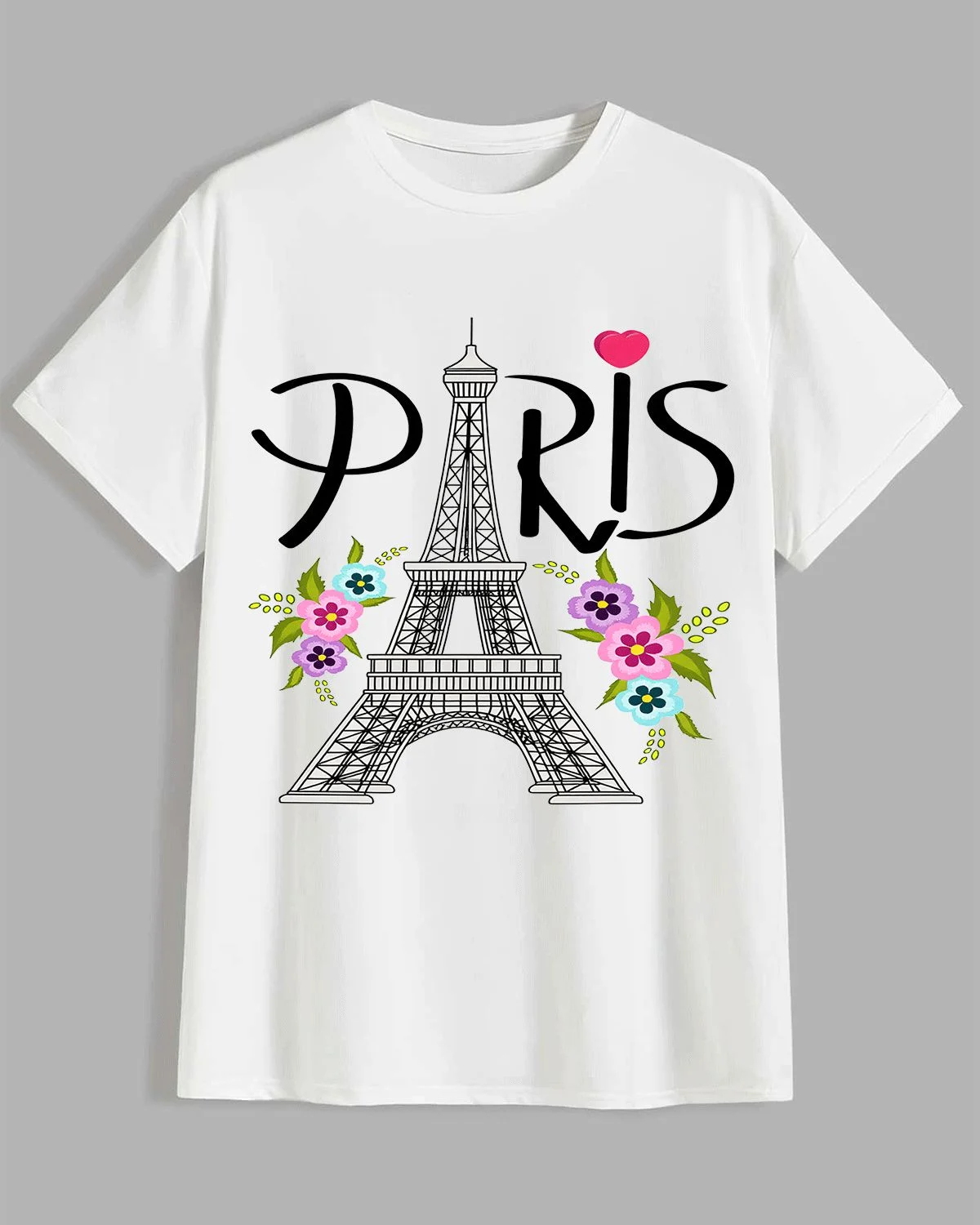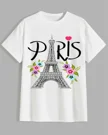 Paris Eiffel Tower with Colorful Flowers Summer Cotton Graphic T Shirt - Casual Chic, Short Sleeve, Soft Fabric, Comfortable Fit