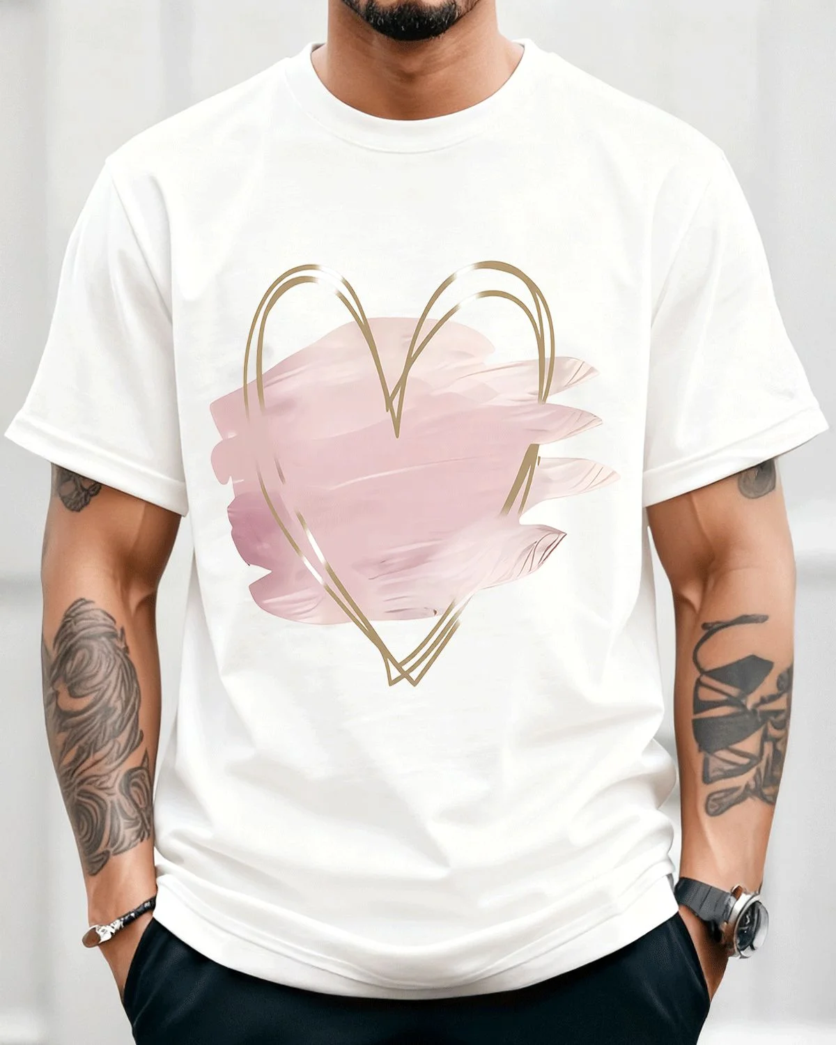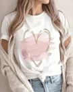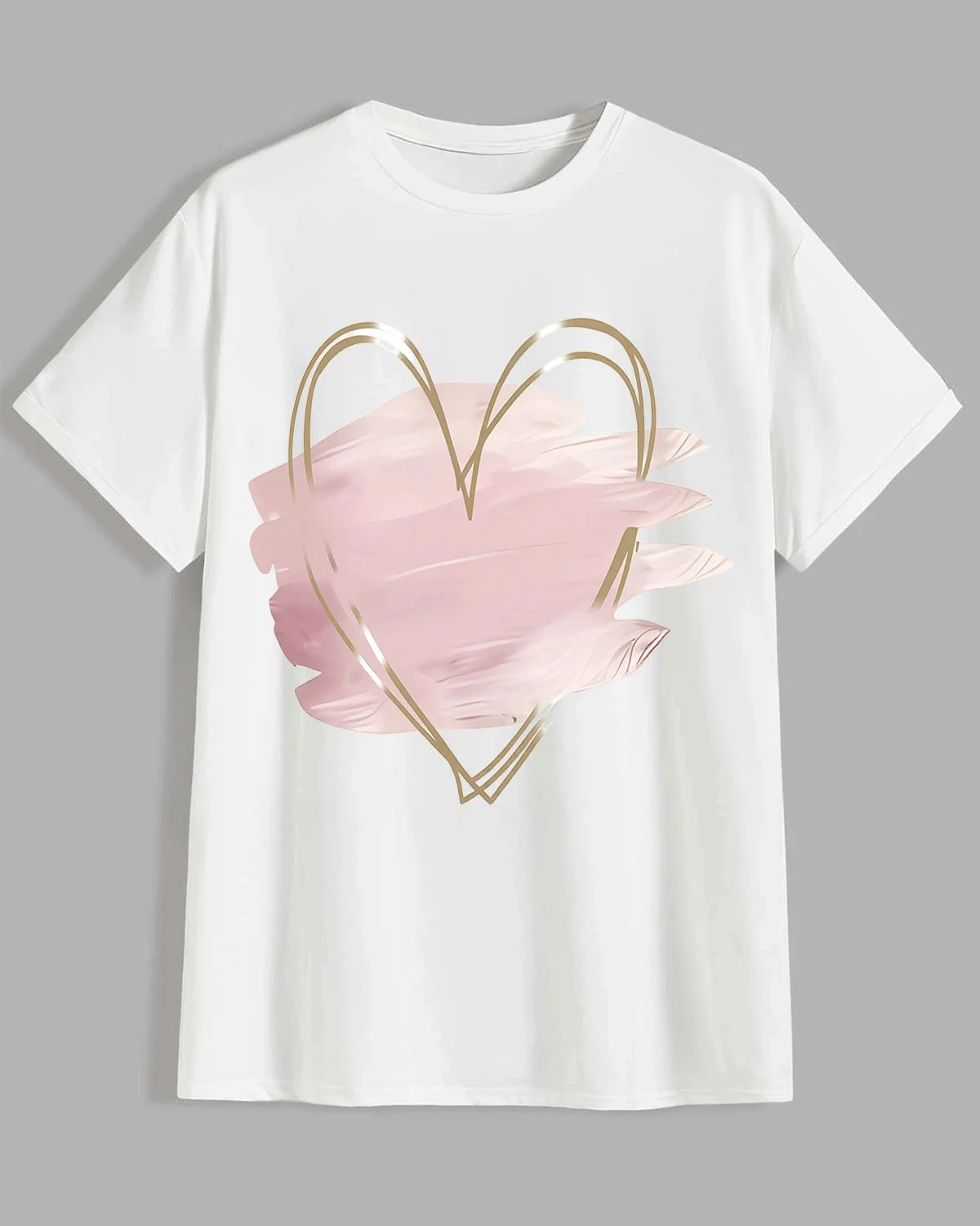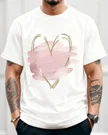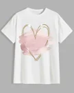 Pink Brushstroke Gold Heart Summer Cotton Graphic T Shirt - Casual Chic, Short Sleeve, Soft Fabric, Comfortable Fit