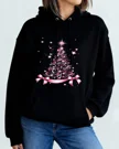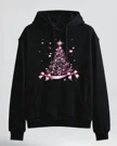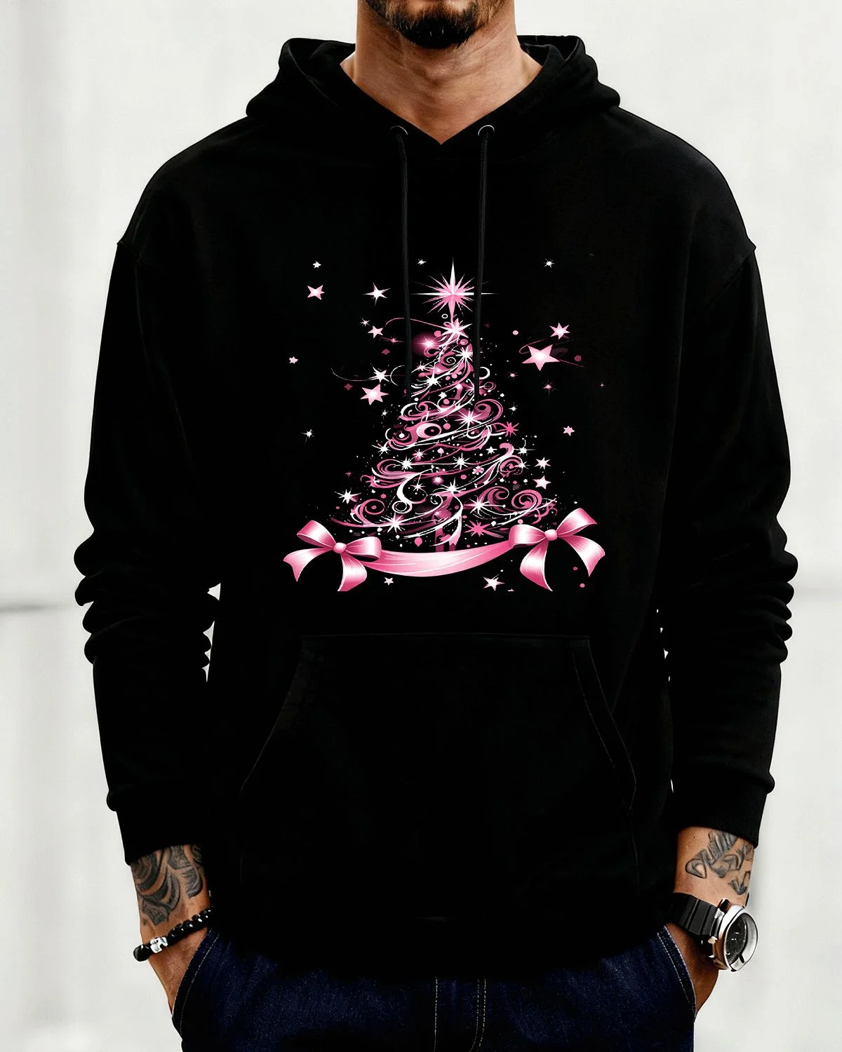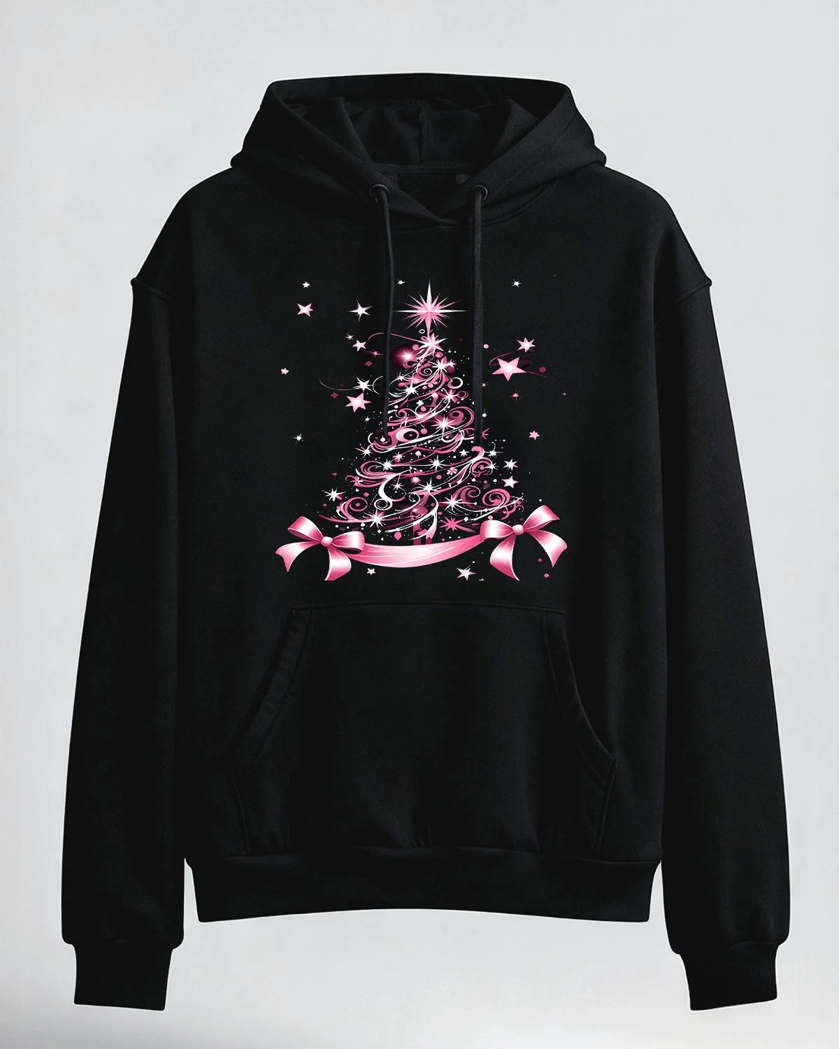 Pink Christmas Tree with Stars and Ribbons Cozy Graphic Hoodie for Men and Women - Chic Artistic, Long Sleeve, Soft Fabric, Comfortable Fit