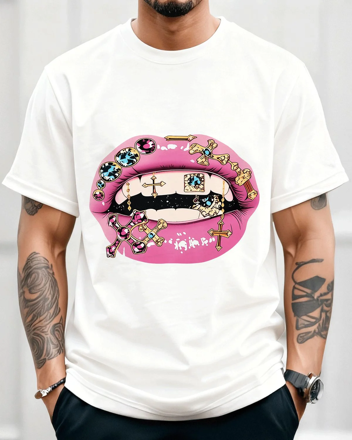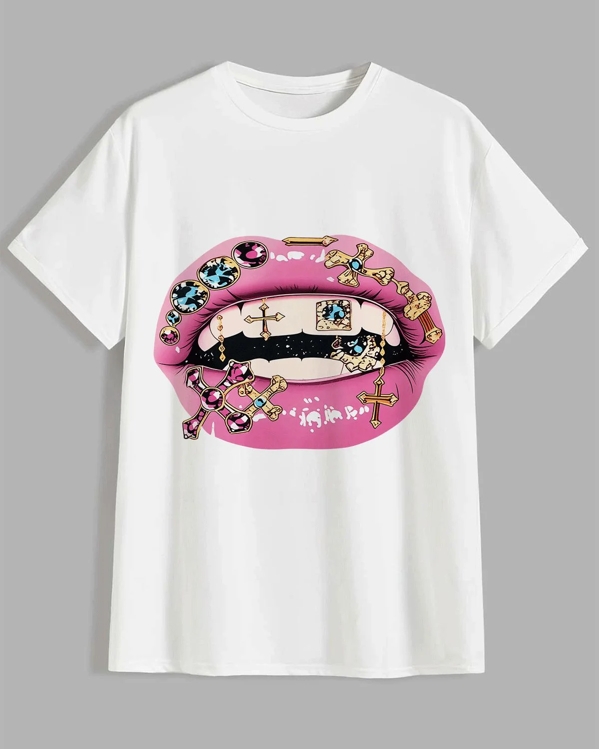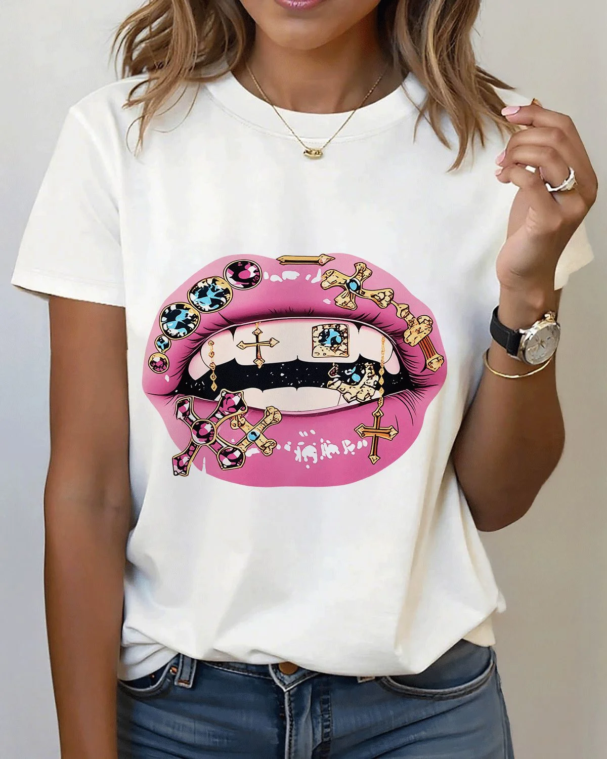 Pink Lips with Jeweled Crosses Summer Cotton Graphic T Shirt - Artistic Retro,Short Sleeve,Soft Fabric,Comfortable Fit