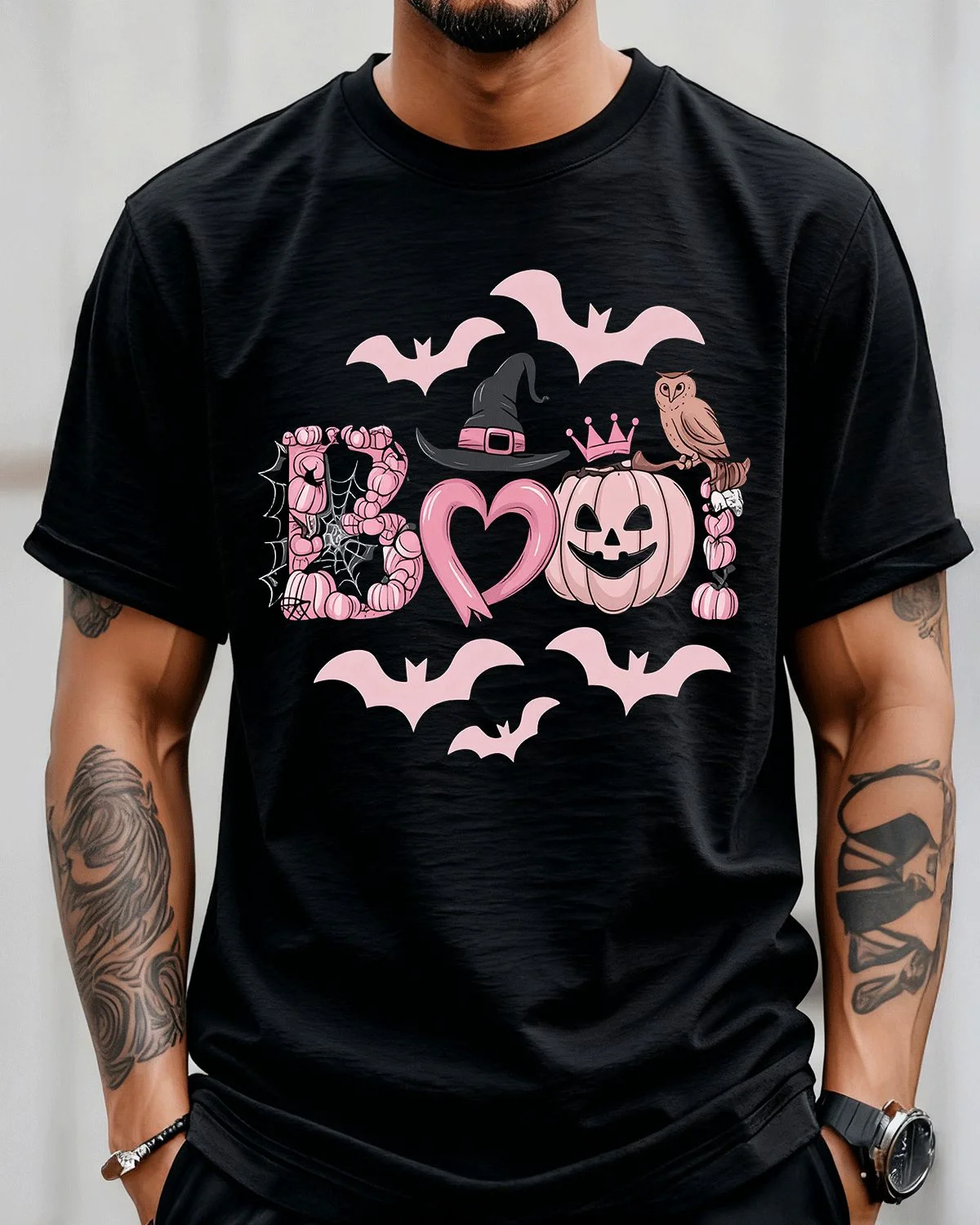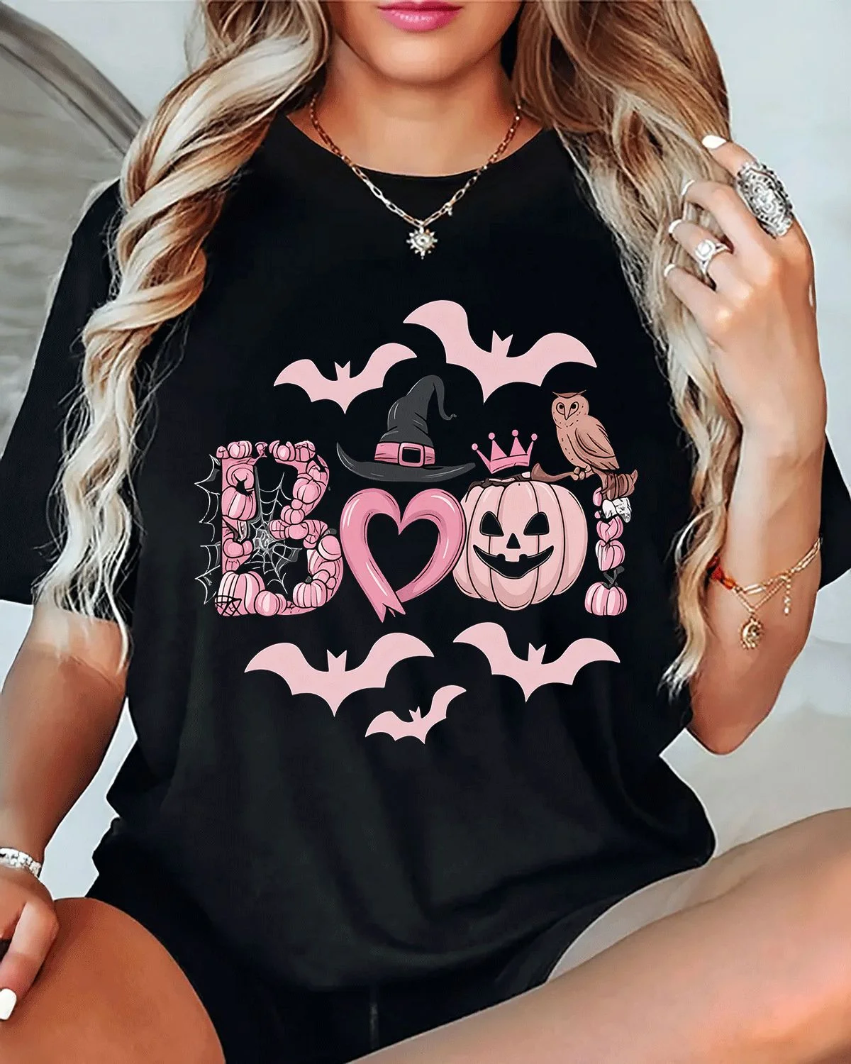Pink Pumpkin Boo Halloween Summer Cotton Graphic T Shirt-Casual Vintage,Short Sleeve,Soft Fabric,Comfortable Fit