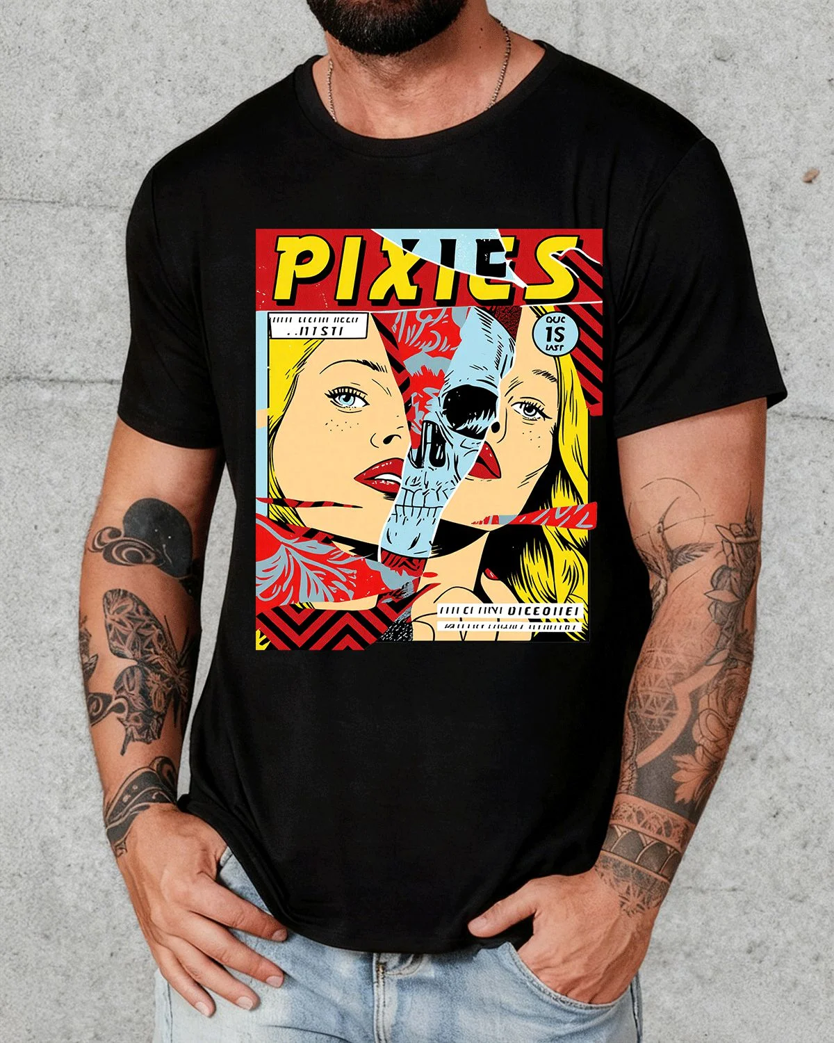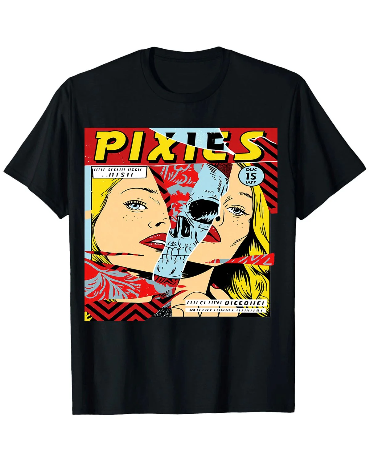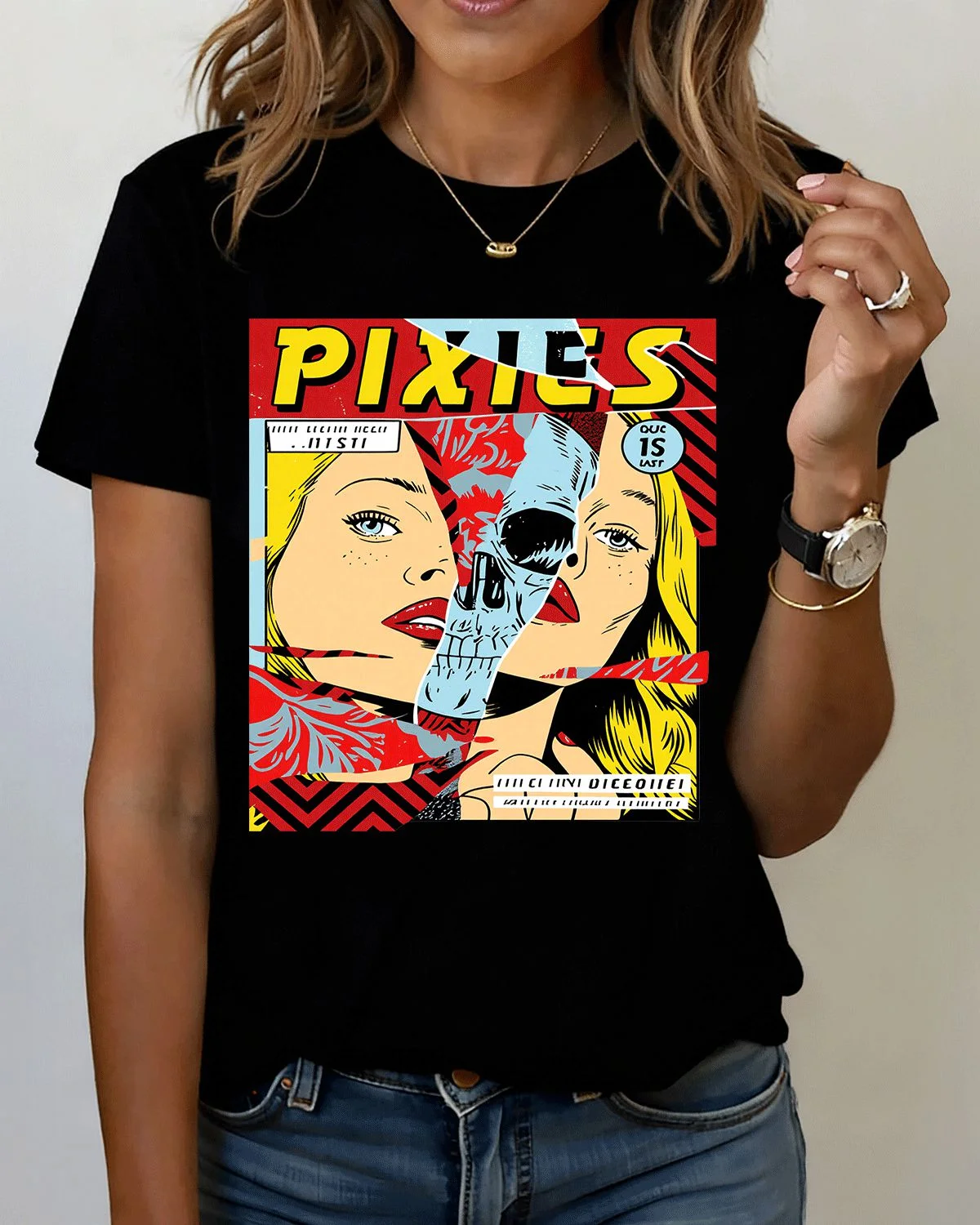 Pixies Pop Art Blonde and Skull Summer Cotton Graphic T Shirt - Retro Artistic, Short Sleeve, Soft Fabric, Comfortable Fit