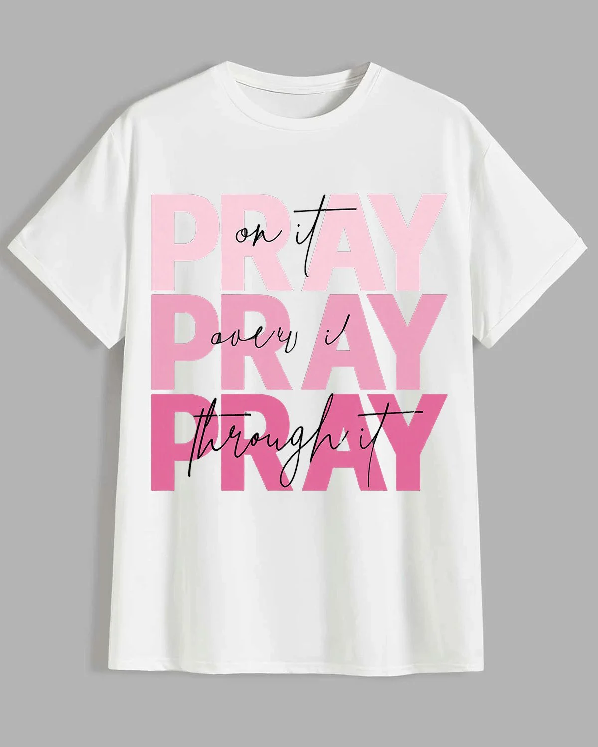 Pray On It Over It Through It Summer Cotton Graphic T Shirt - Casual Vintage, Short Sleeve, Soft Fabric, Comfortable Fit