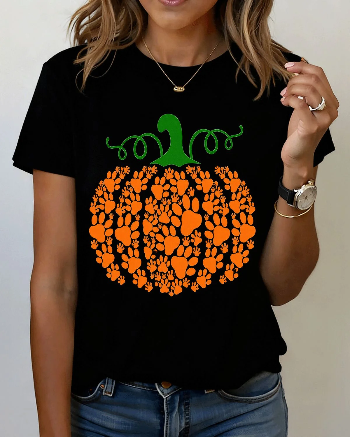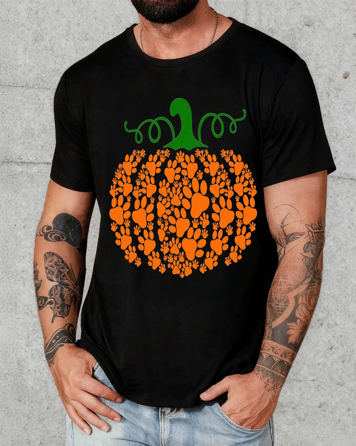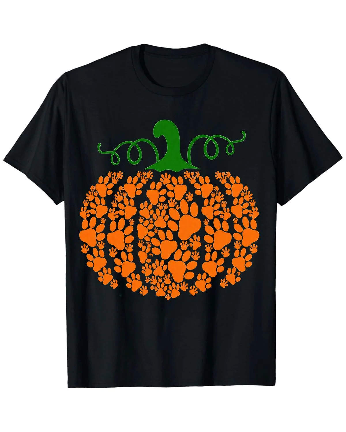 Pumpkin Made of Paw Prints Summer Cotton Graphic T Shirt-Casual Artistic,Short Sleeve,Soft Fabric,Comfortable Fit