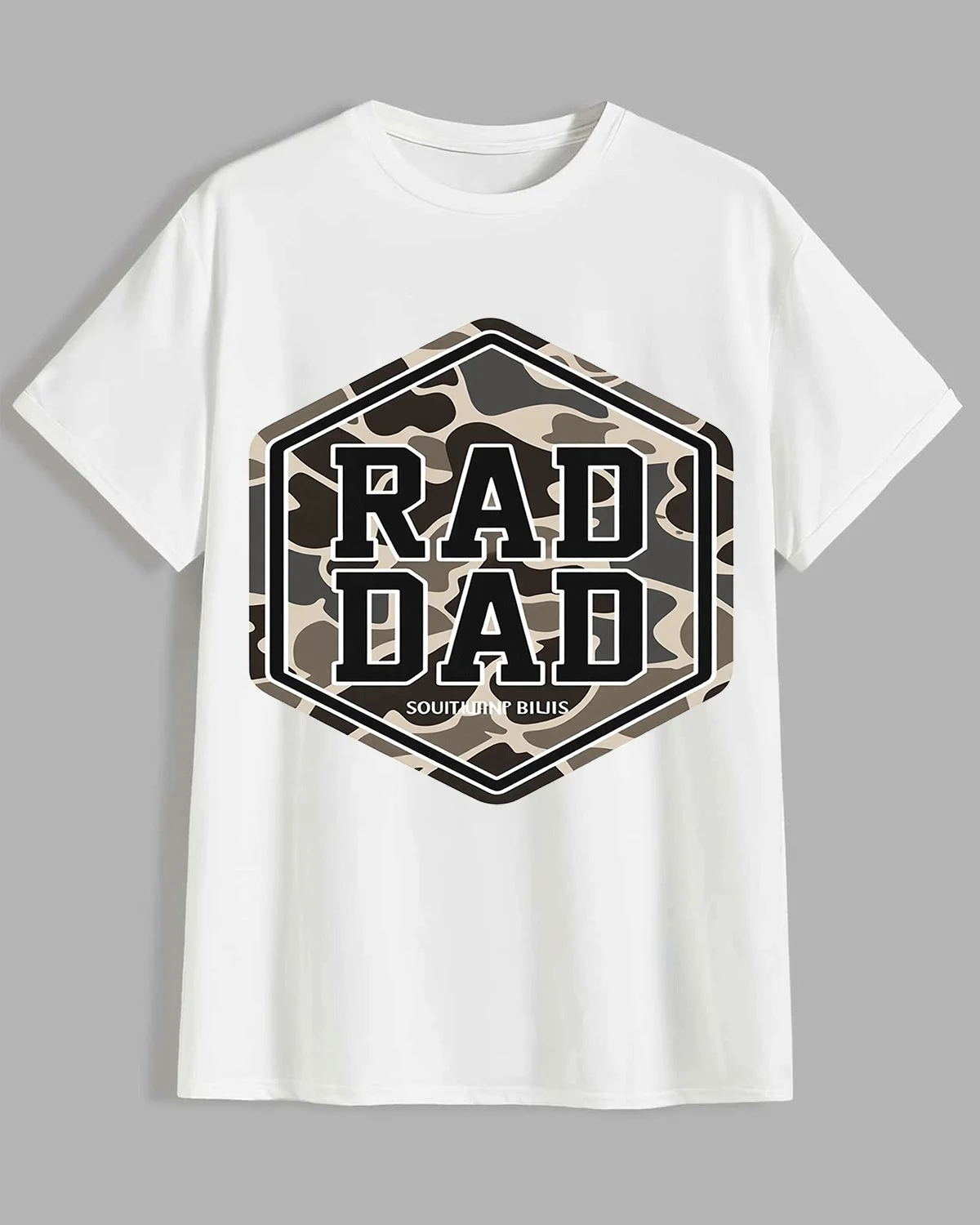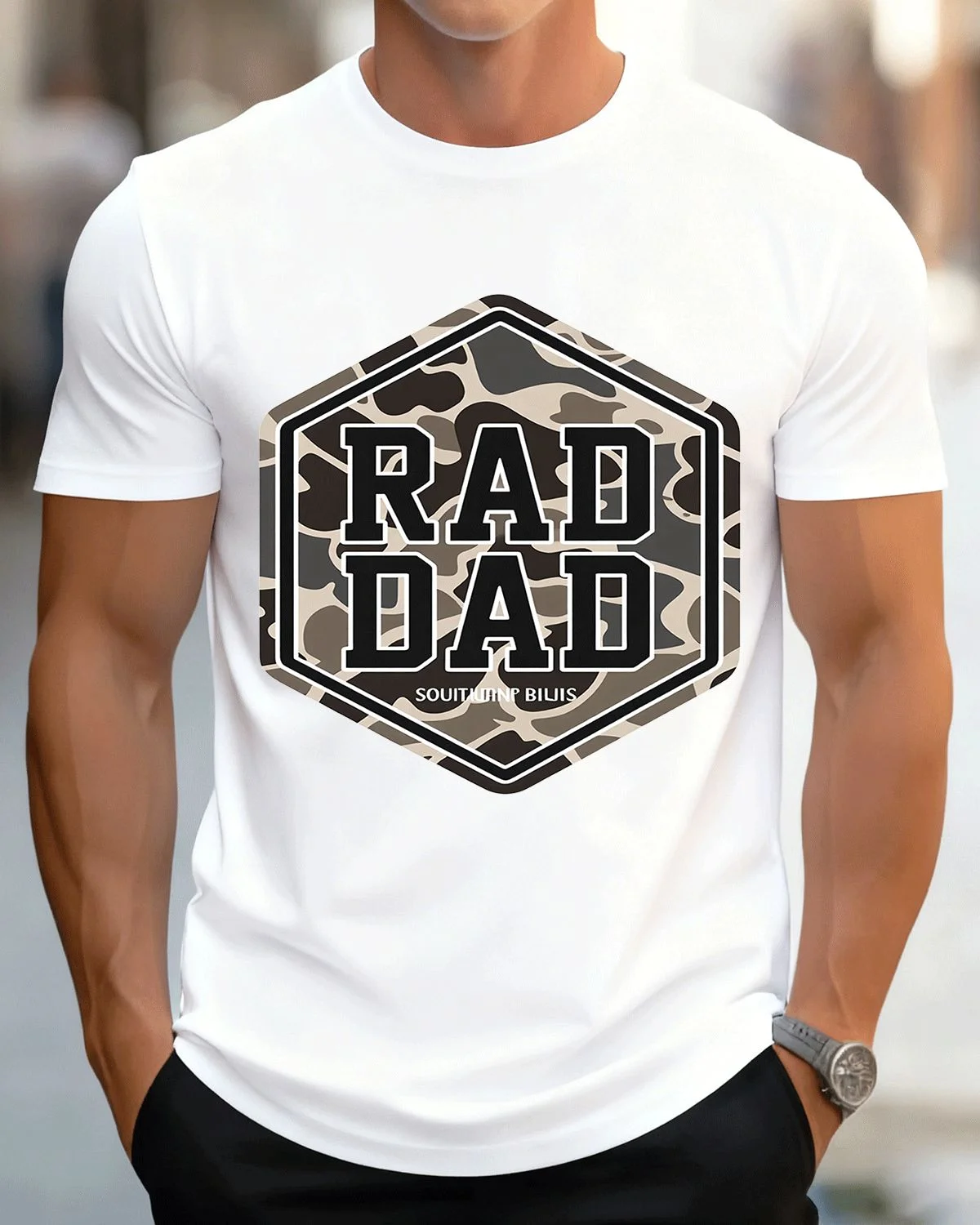 Rad Dad Camo Badge Summer Cotton Graphic T Shirt - Casual Cool, Short Sleeve, Soft Fabric, Comfortable Fit