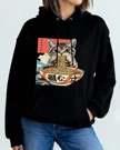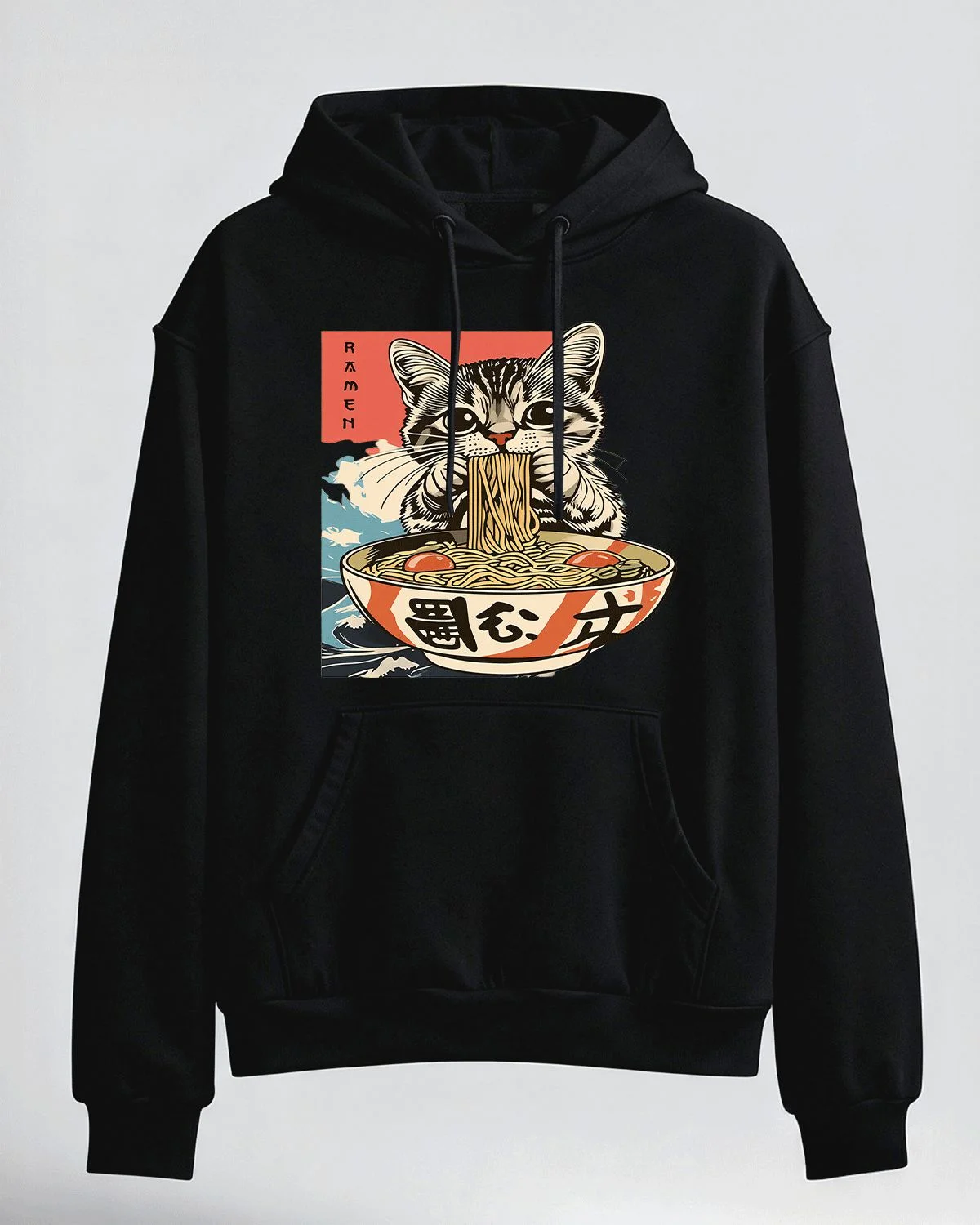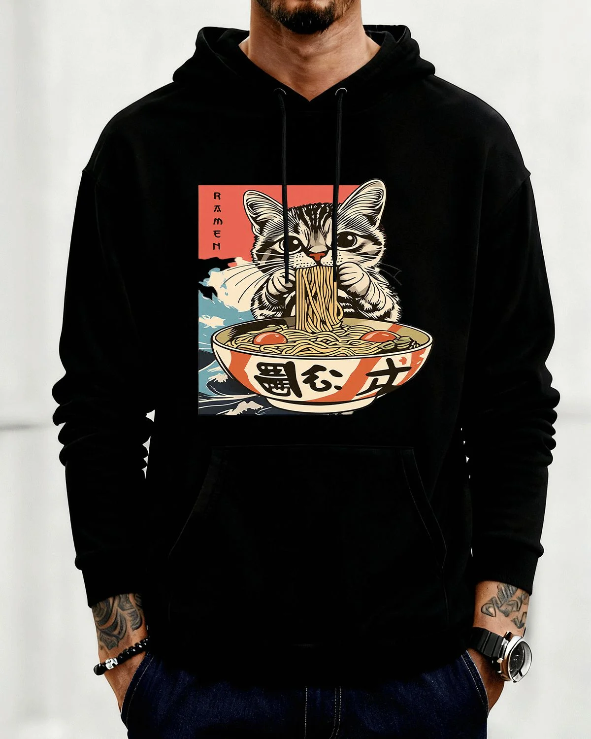 Ramen Cat Eating Noodles Cozy Graphic Hoodie for Men and Women - Vintage Artistic, Long Sleeve, Soft Fabric, Comfortable Fit