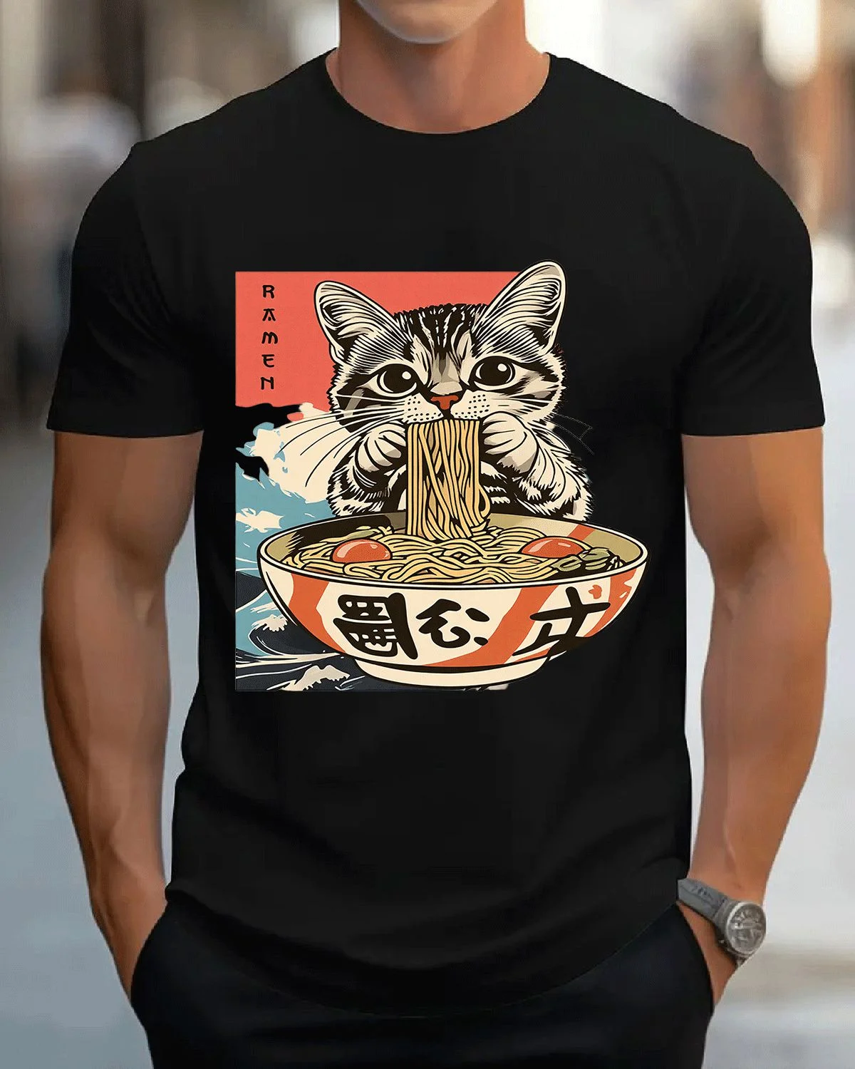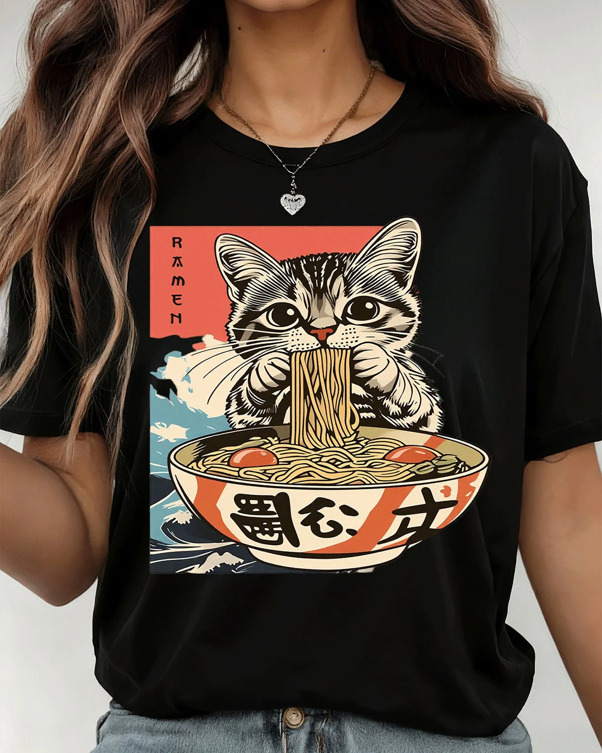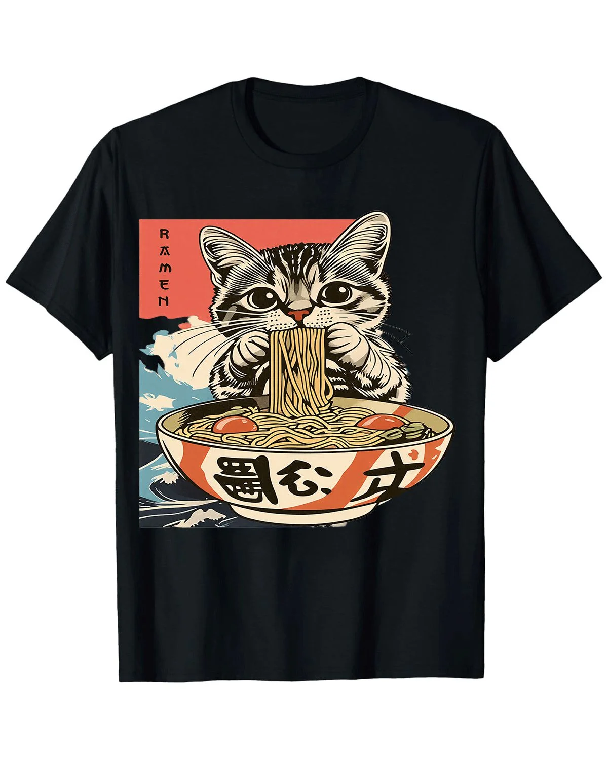 Ramen Cat Eating Noodles Summer Cotton Graphic T Shirt - Vintage Artistic, Short Sleeve, Soft Fabric, Comfortable Fit