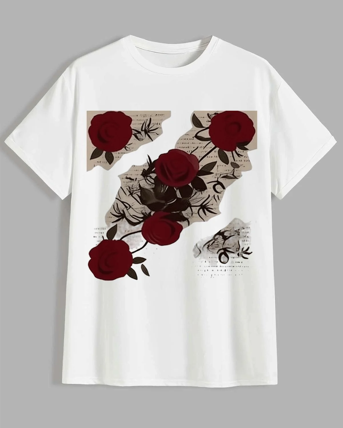 Red Roses with Vintage Script Summer Cotton Graphic T Shirt - Vintage Artistic,Short Sleeve,Soft Fabric,Comfortable Fit