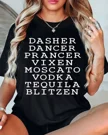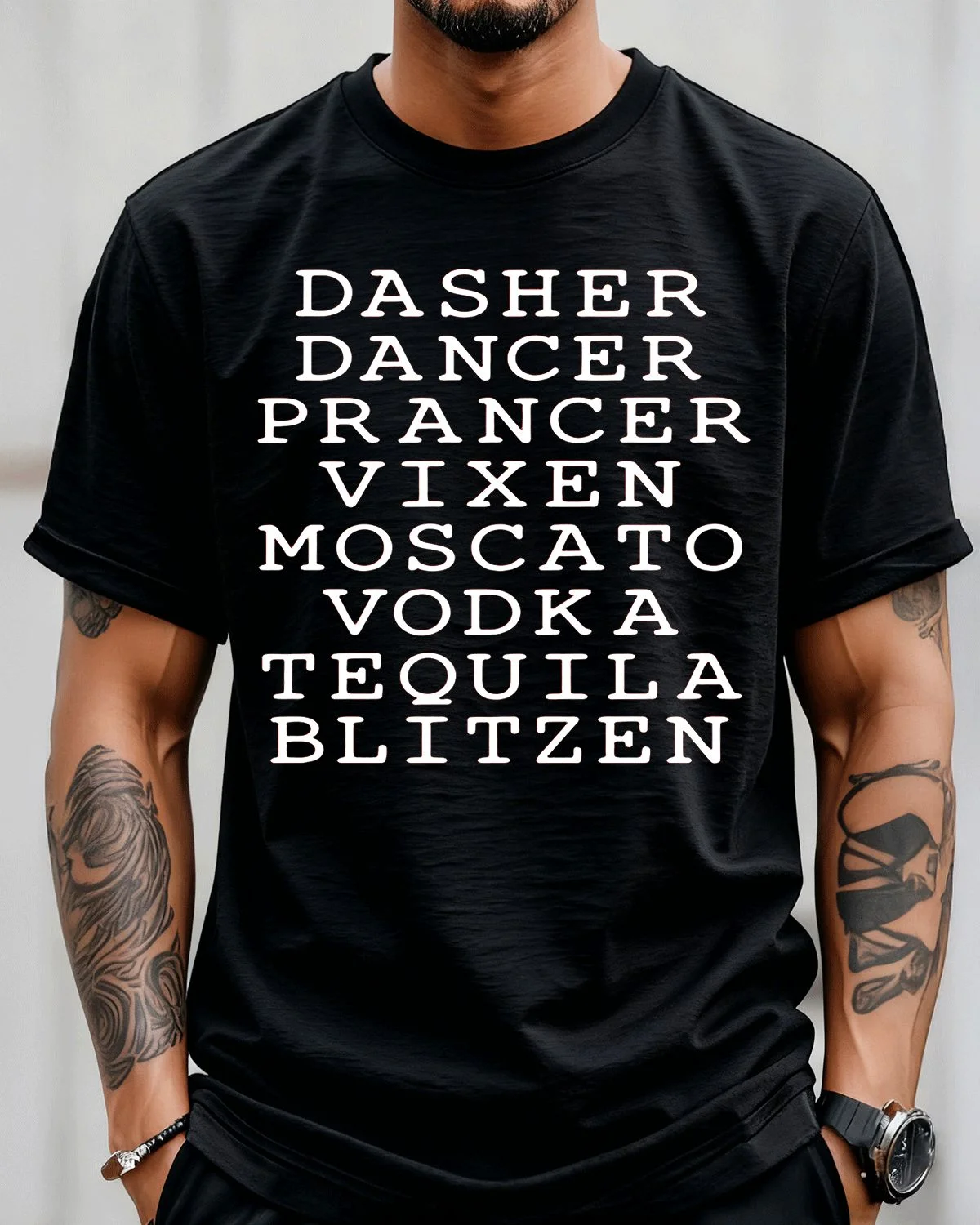 Reindeer Names with Holiday Drinks Summer Cotton Graphic T Shirt - Funny Casual, Short Sleeve, Soft Fabric, Comfortable Fit