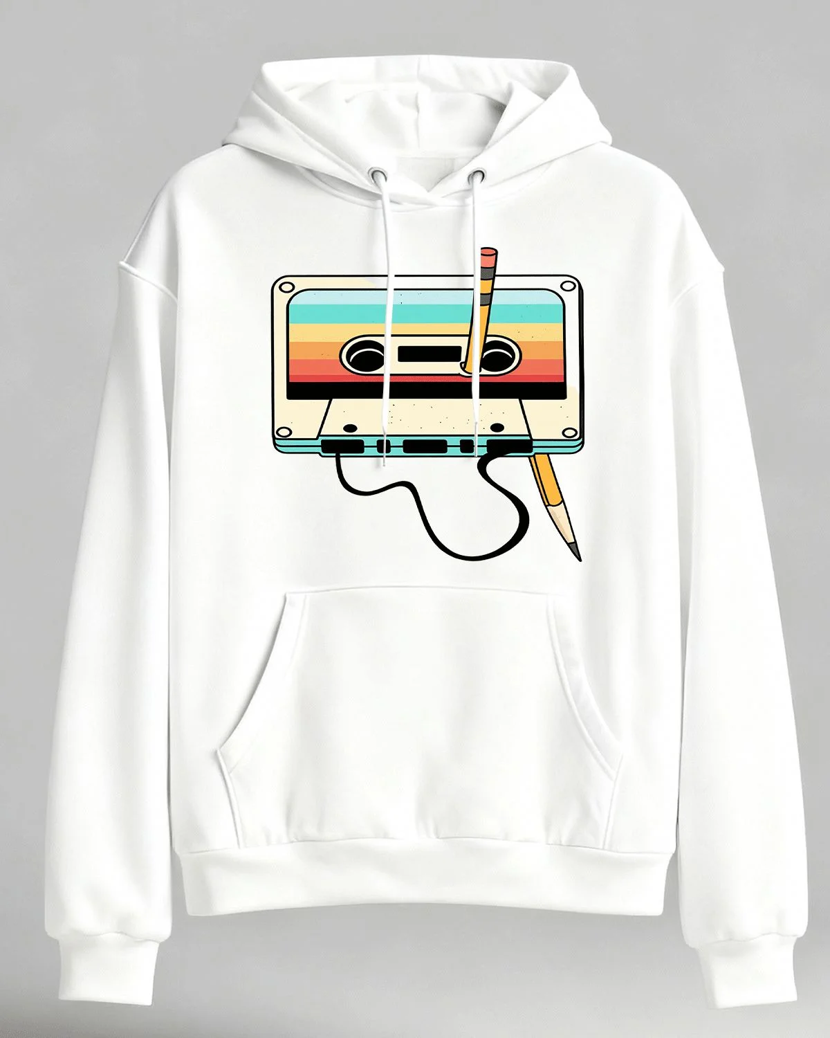 Retro Cassette Tape with Pencil Cozy Graphic Hoodie for Men and Women - Vintage Artistic, Long Sleeve, Soft Fabric, Comfortable Fit