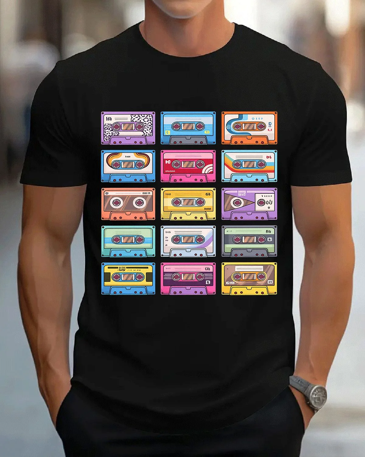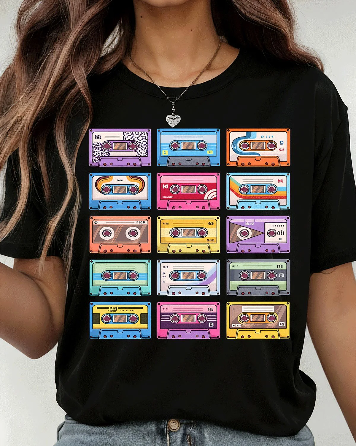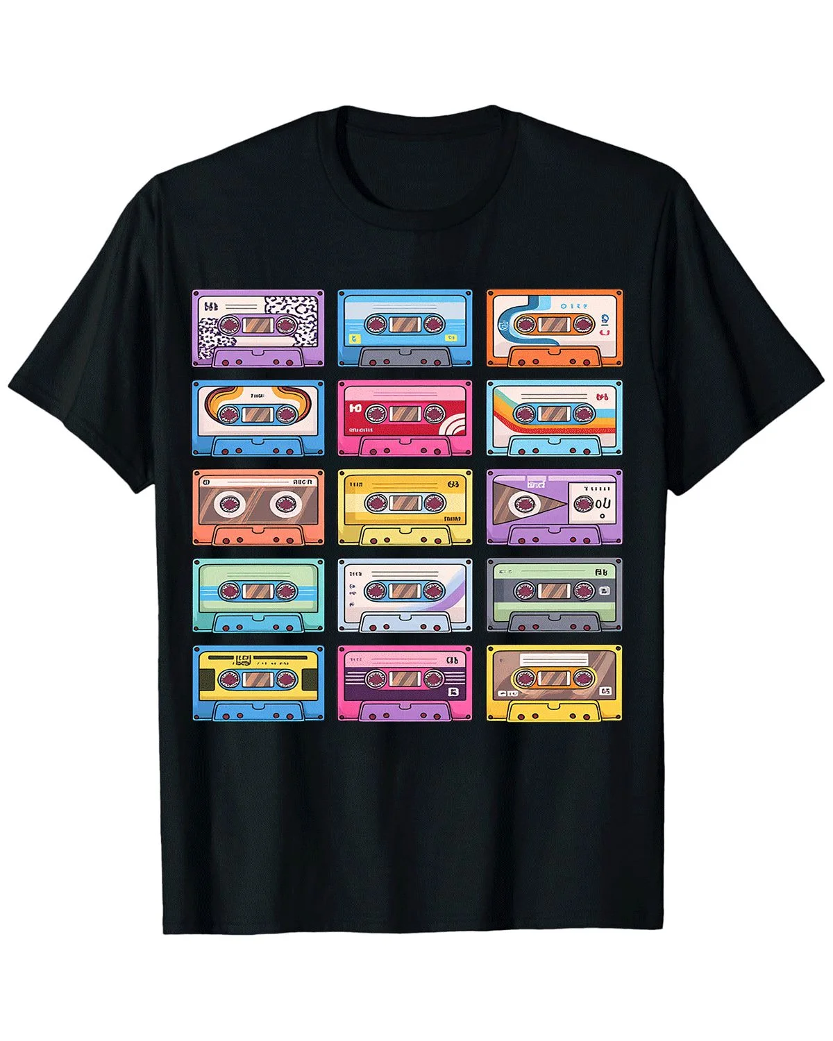 Retro Colorful Cassette Tape Collection Summer Cotton Graphic T Shirt - Vintage Artistic, Short Sleeve, Soft Fabric, Comfortable Fit