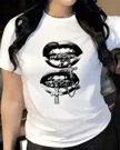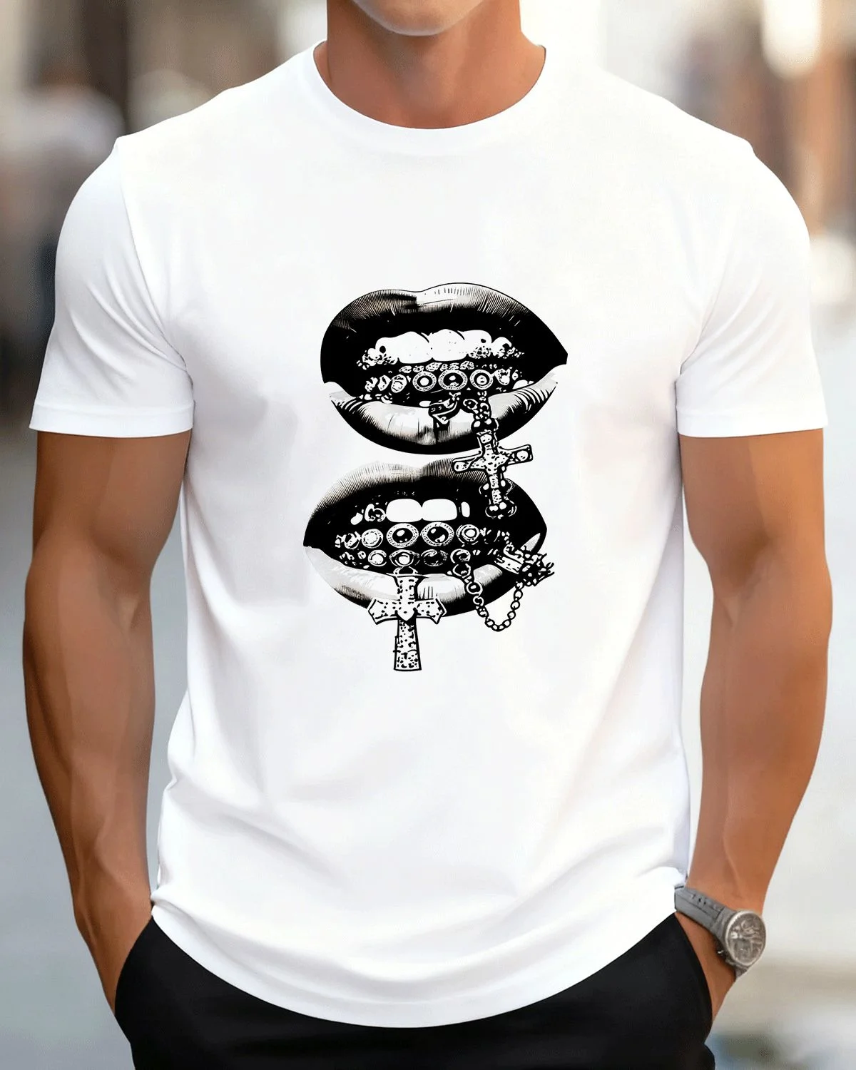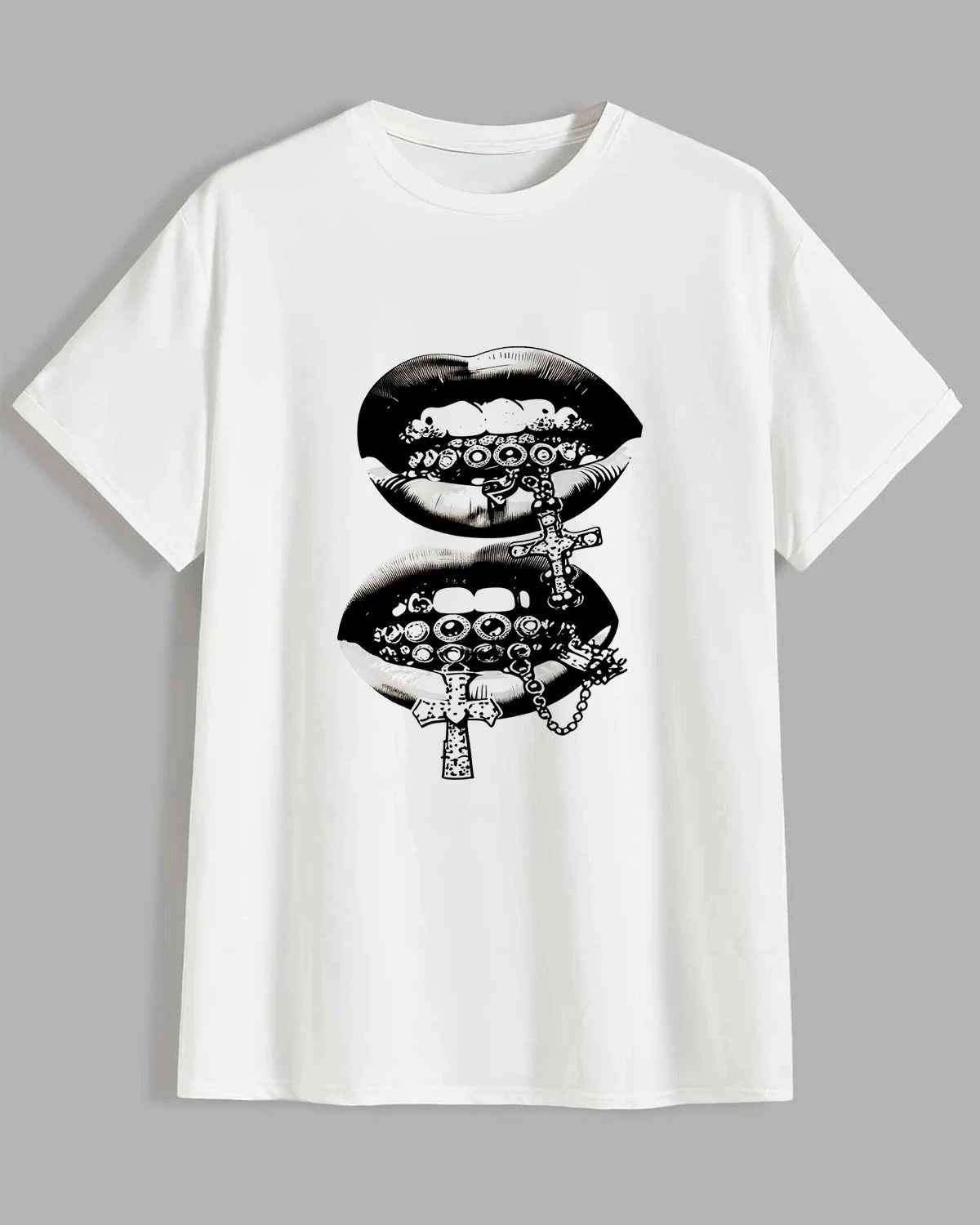 Rosary Beads Lips Art Summer Cotton Graphic T Shirt - Artistic Vintage,Short Sleeve,Soft Fabric,Comfortable Fit