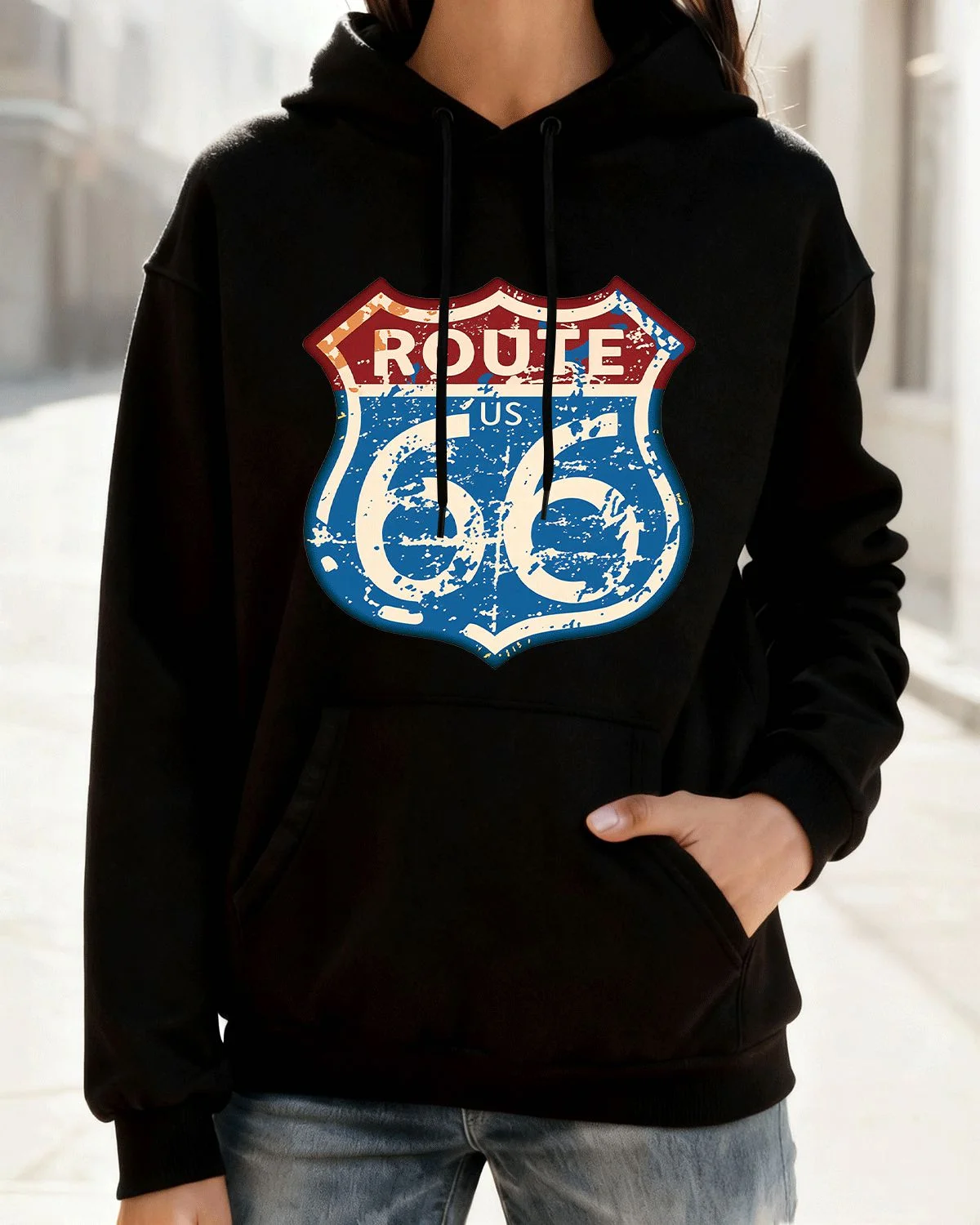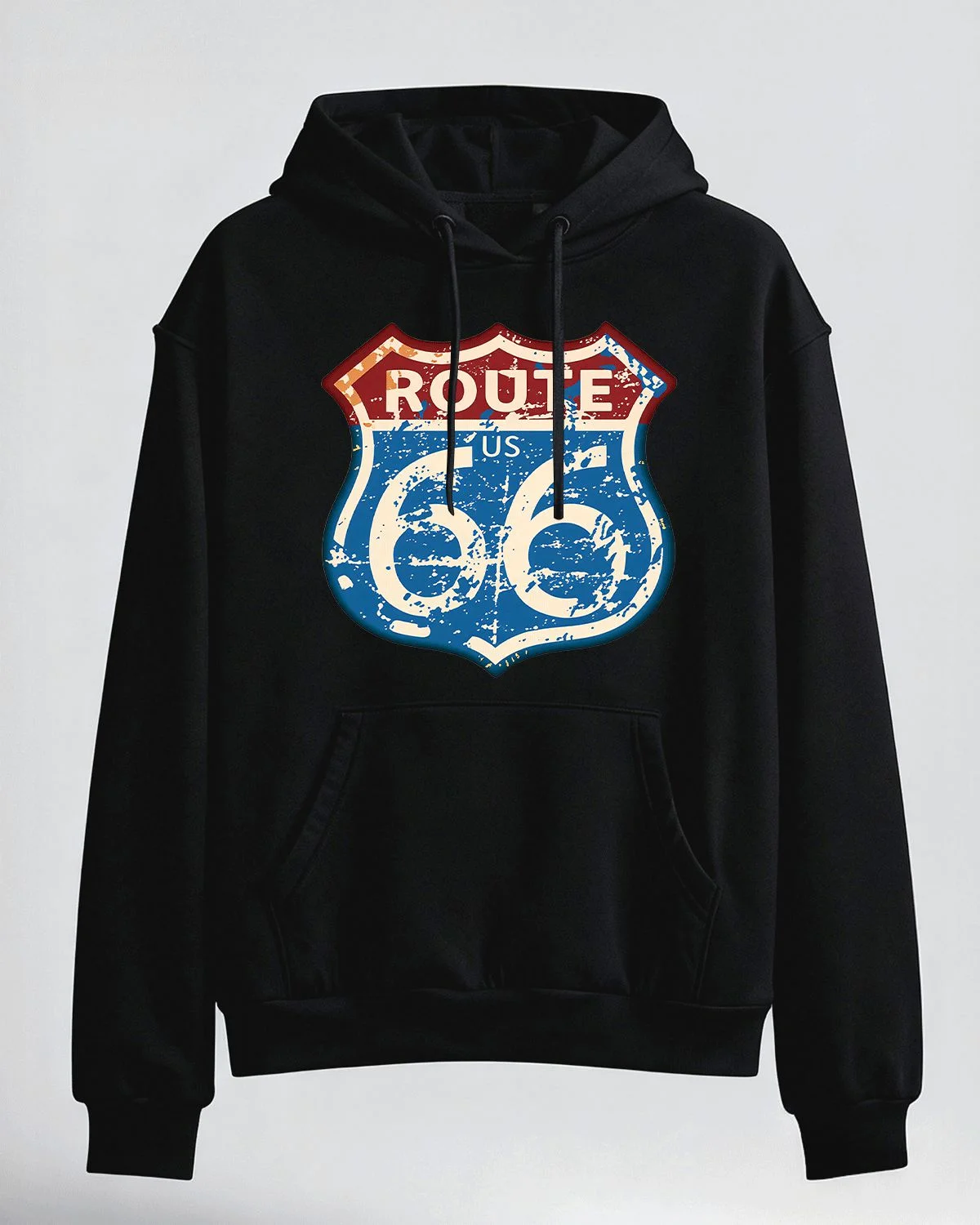 Route 66 US Highway Sign Cozy Graphic Hoodie for Men and Women - Vintage Retro, Long Sleeve, Soft Fabric, Comfortable Fit