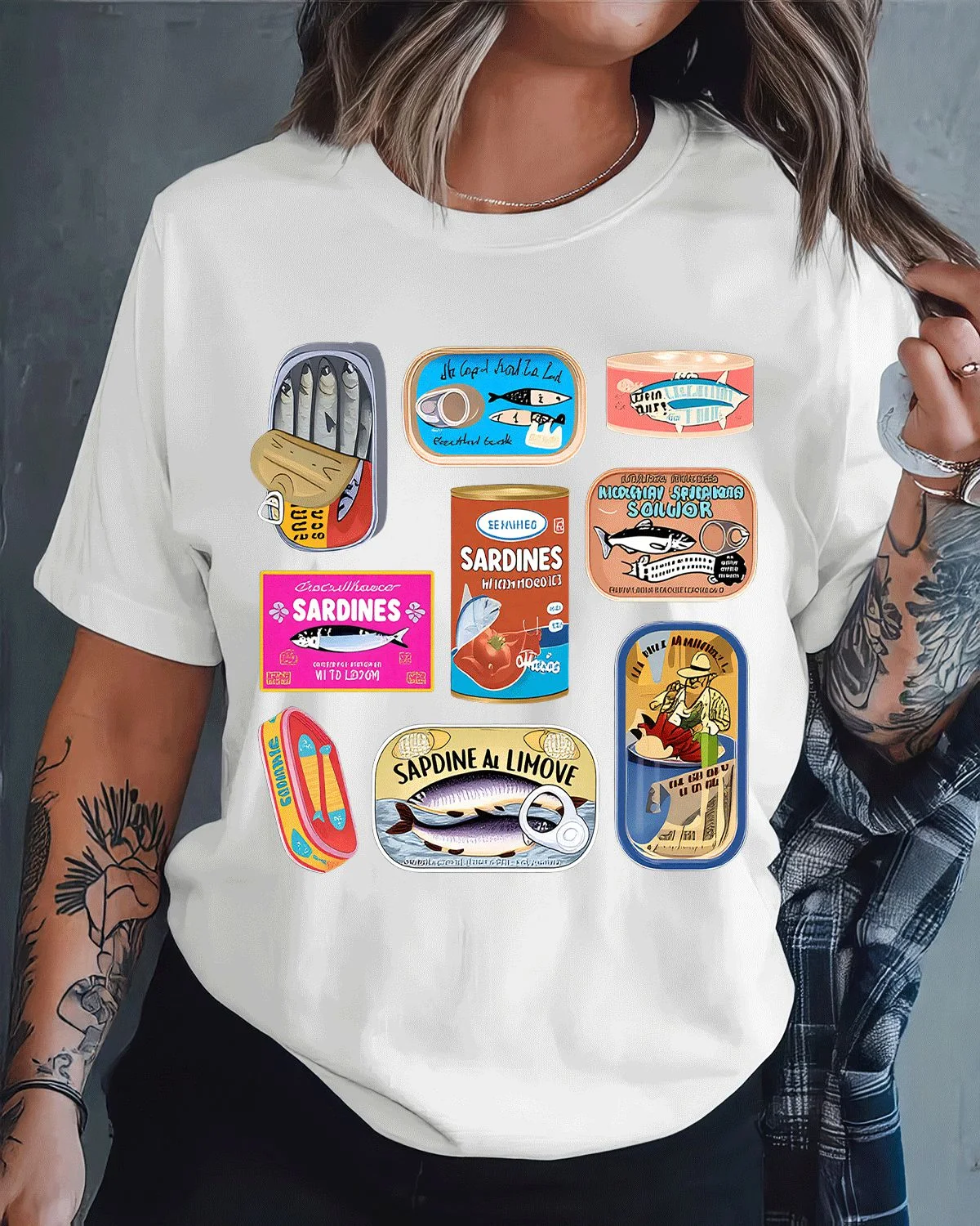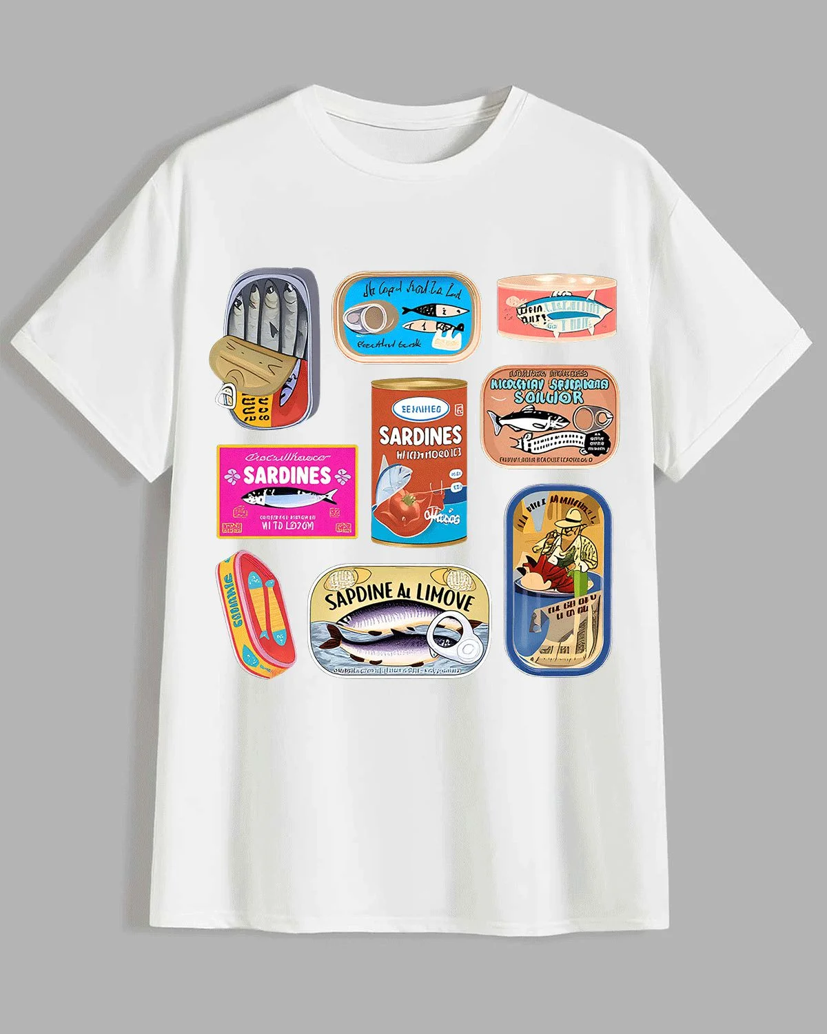 Sardines Variety Can Art Summer Cotton Graphic T Shirt - Vintage Artistic, Short Sleeve, Soft Fabric, Comfortable Fit