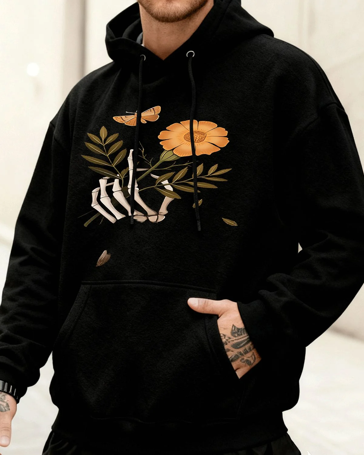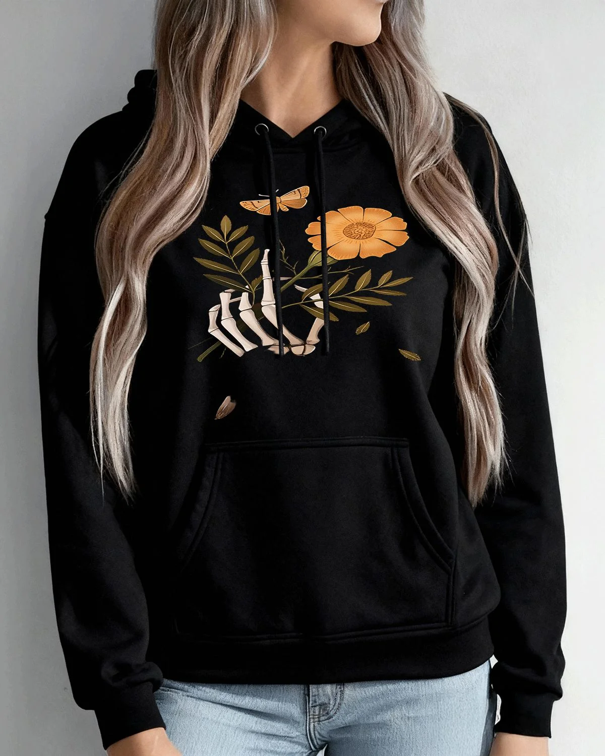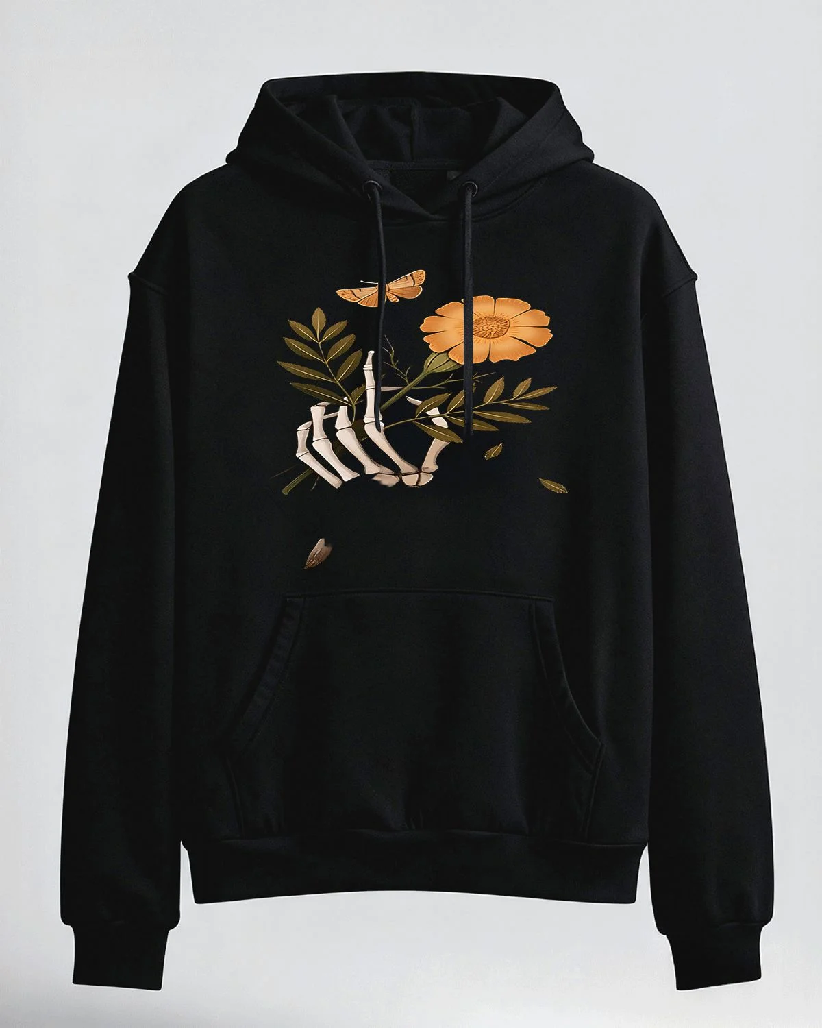Skeleton Hand with Flower and Butterfly Cozy Graphic Hoodie for Men and Women - Vintage Artistic, Long Sleeve, Soft Fabric, Comfortable Fit