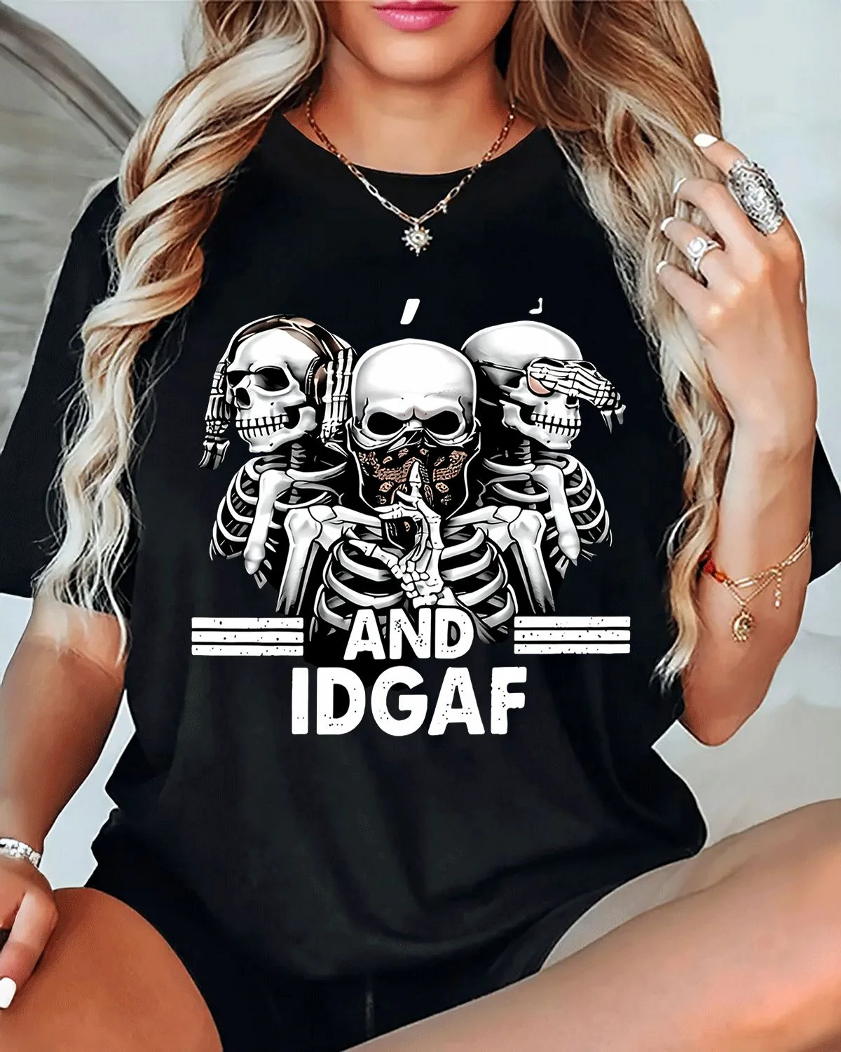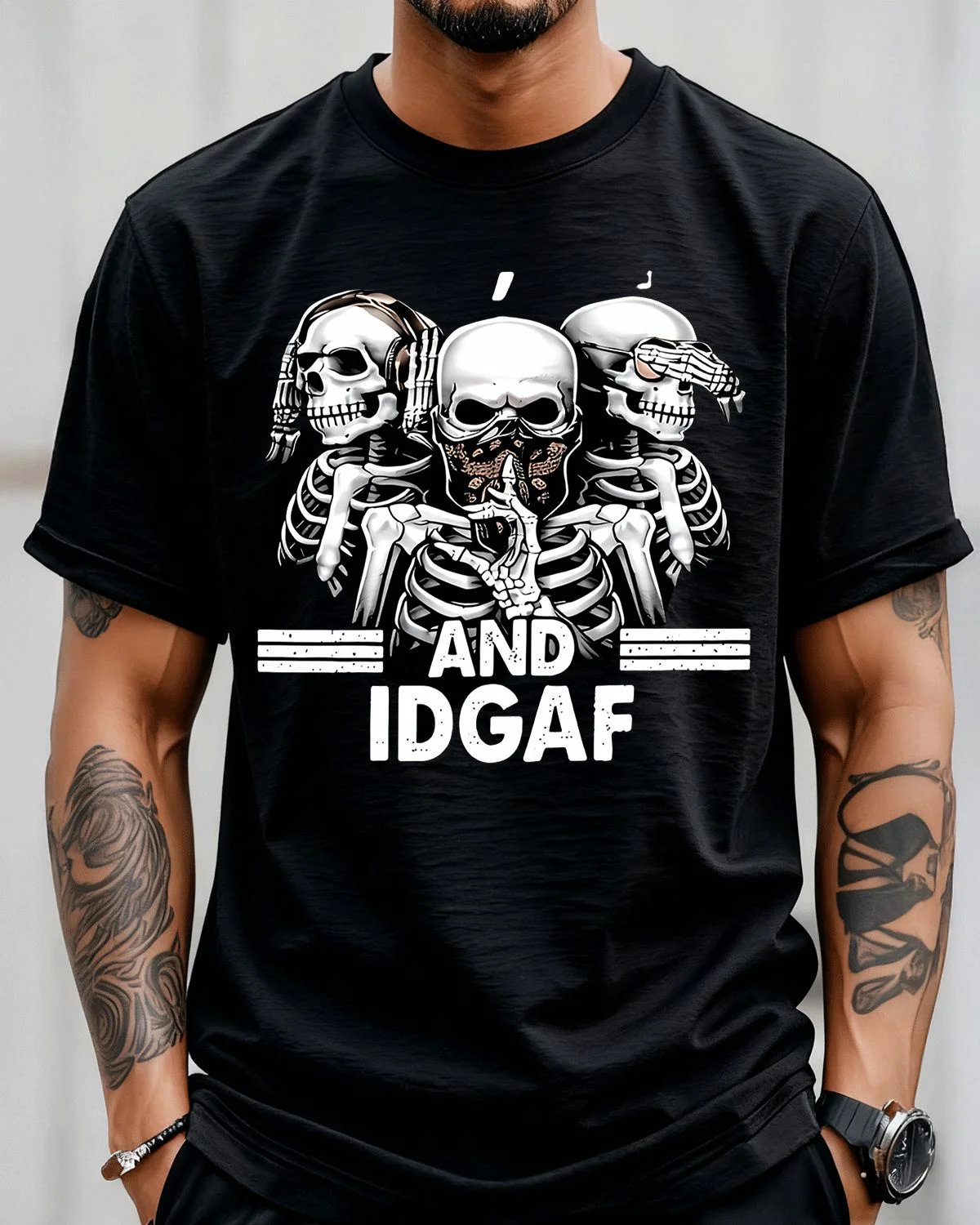 Skeleton Hear See Speak No Evil And IDGAF Summer Cotton Graphic T Shirt - Casual Cool, Short Sleeve, Soft Fabric, Comfortable Fit