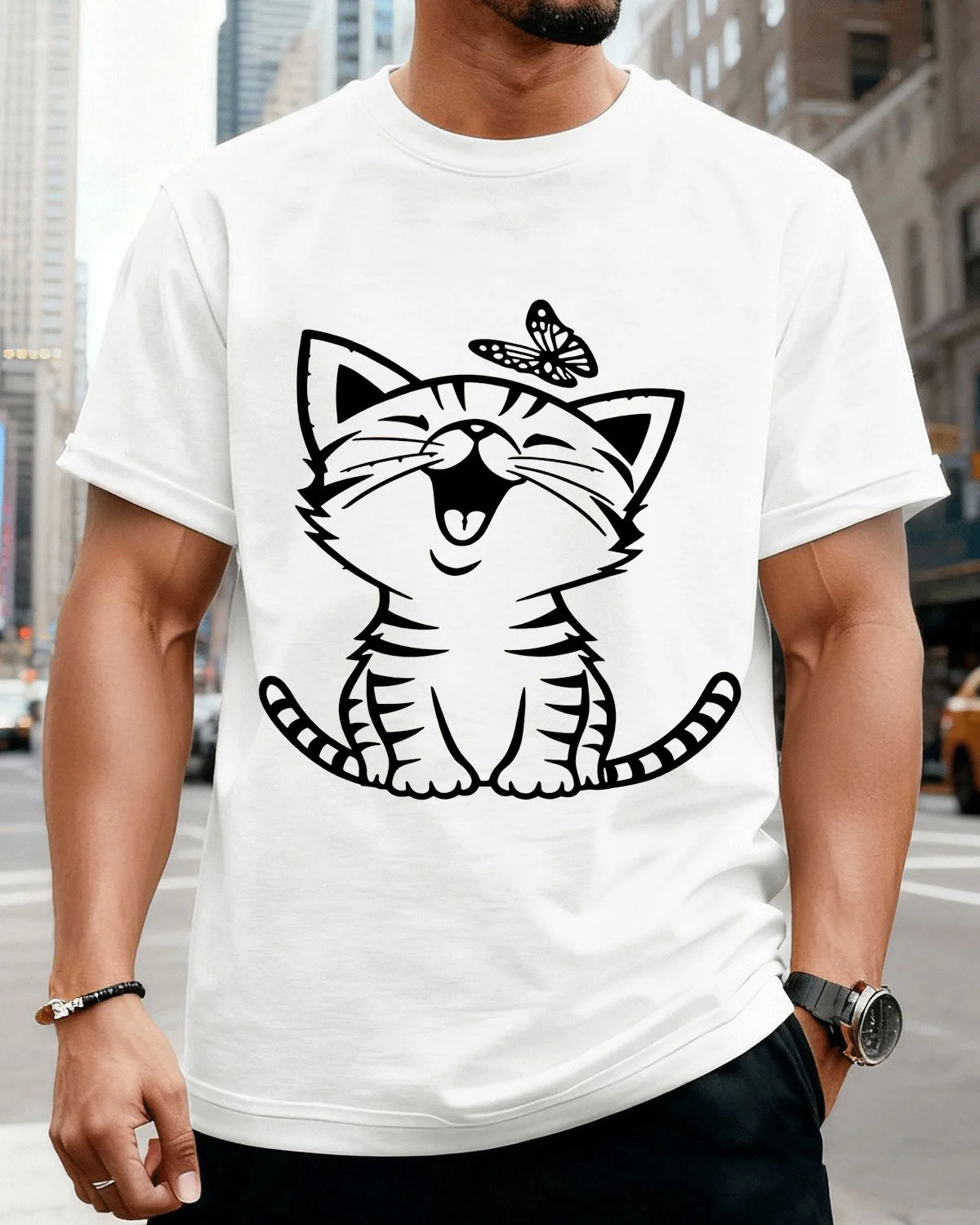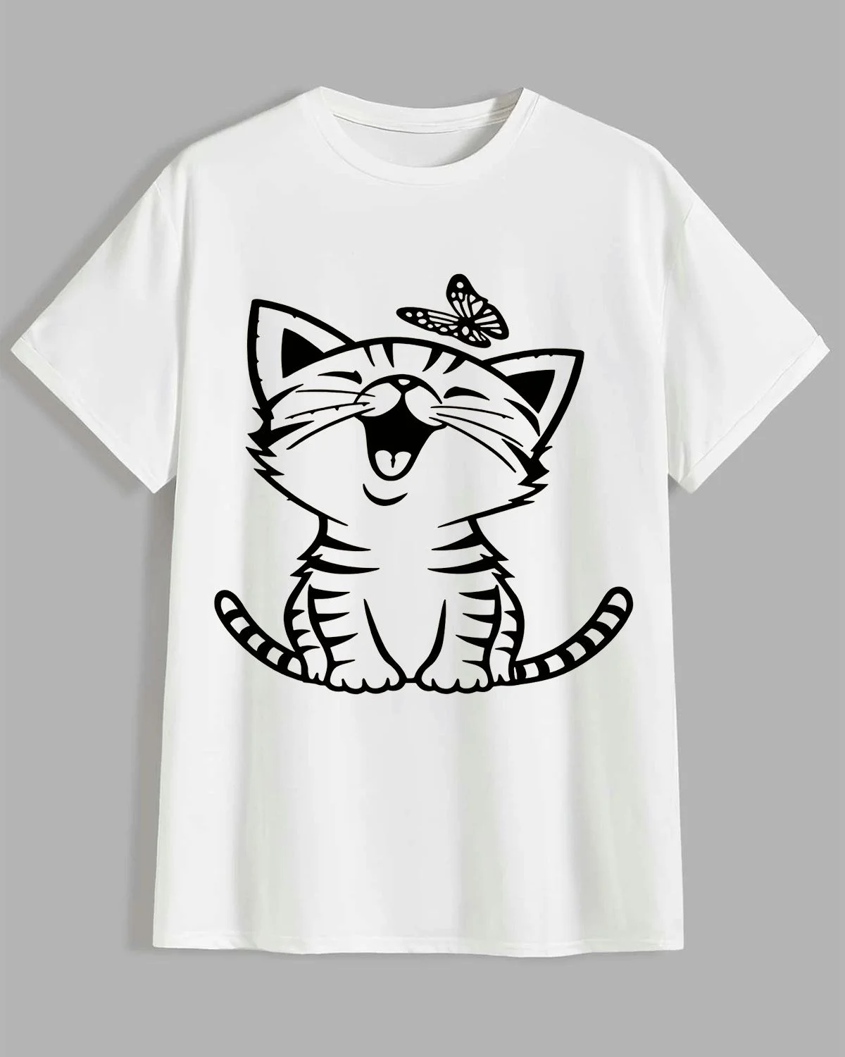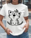 Smiling Cat with Butterfly Summer Cotton Graphic T Shirt - Casual Cute, Short Sleeve, Soft Fabric, Comfortable Fit