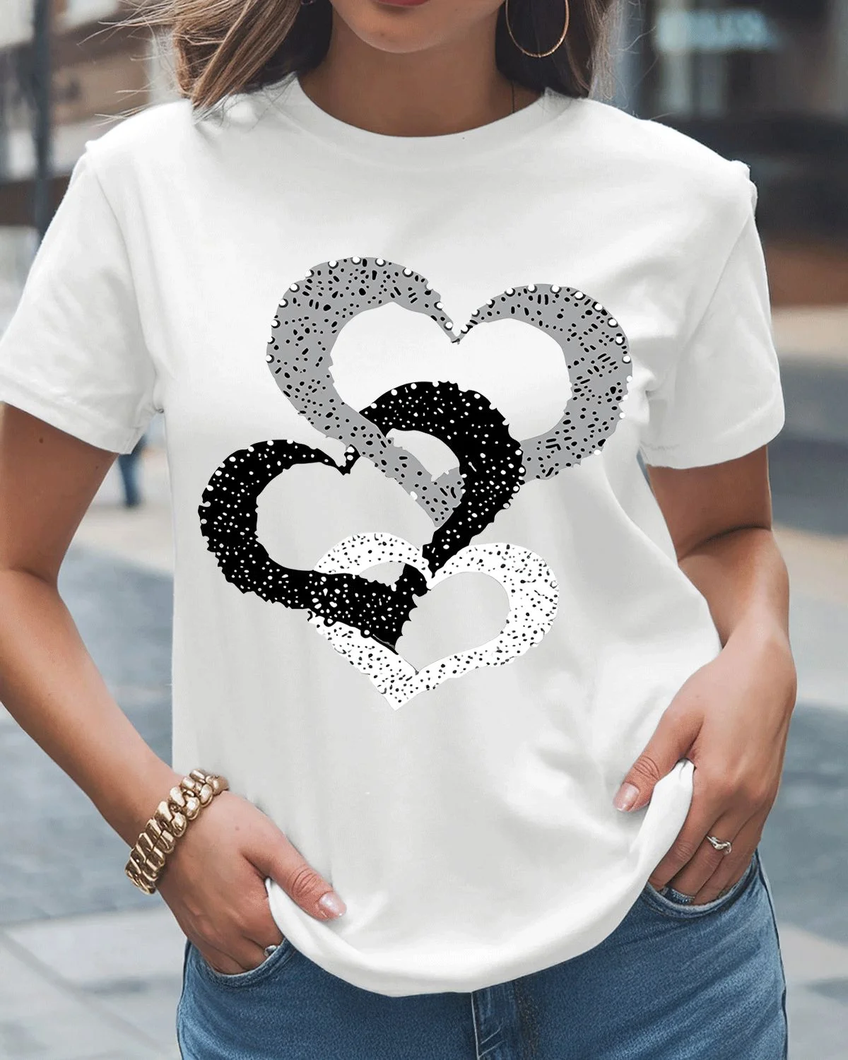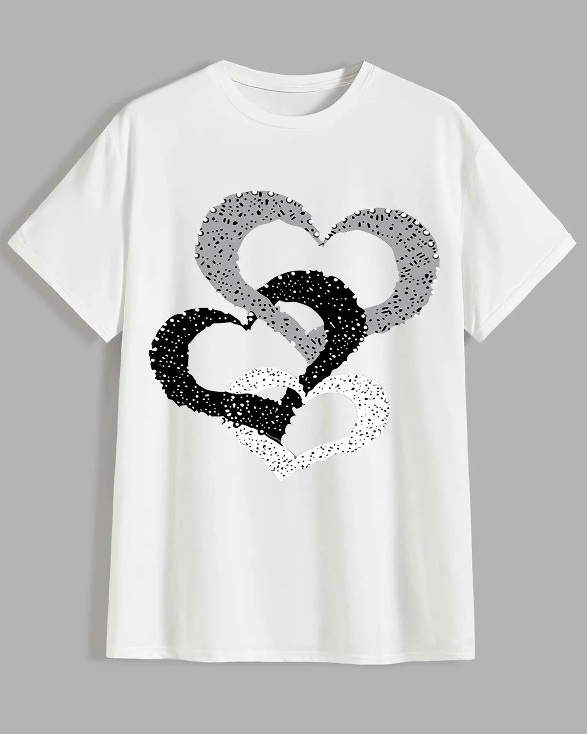 Stacked Distressed Hearts Summer Cotton Graphic T Shirt - Casual Artistic, Short Sleeve, Soft Fabric, Comfortable Fit