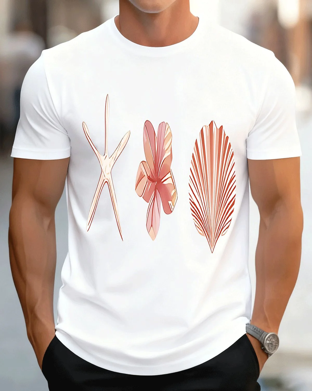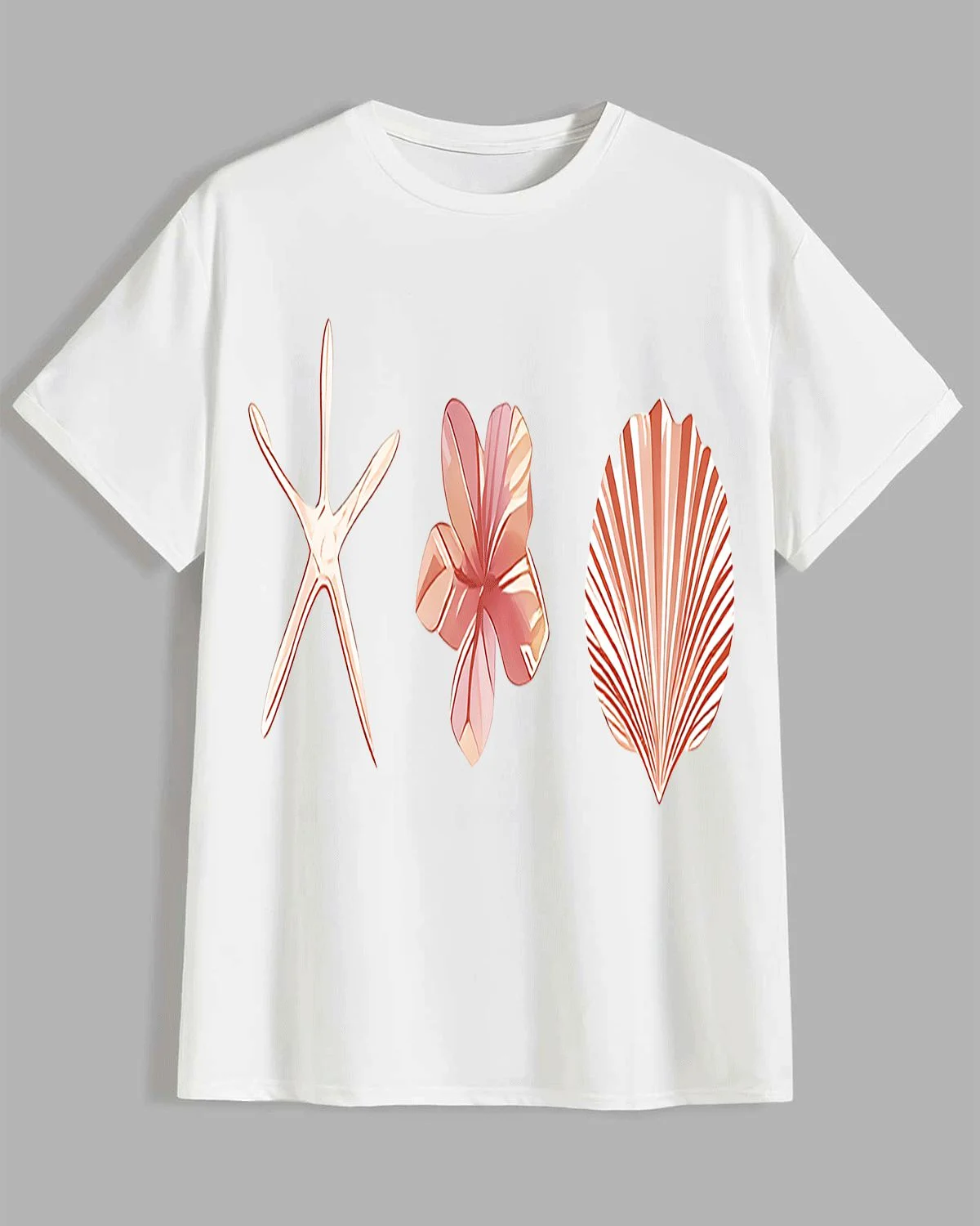 Starfish Flower Seashell Summer Cotton Graphic T Shirt - Casual Beach, Short Sleeve, Soft Fabric, Comfortable Fit