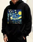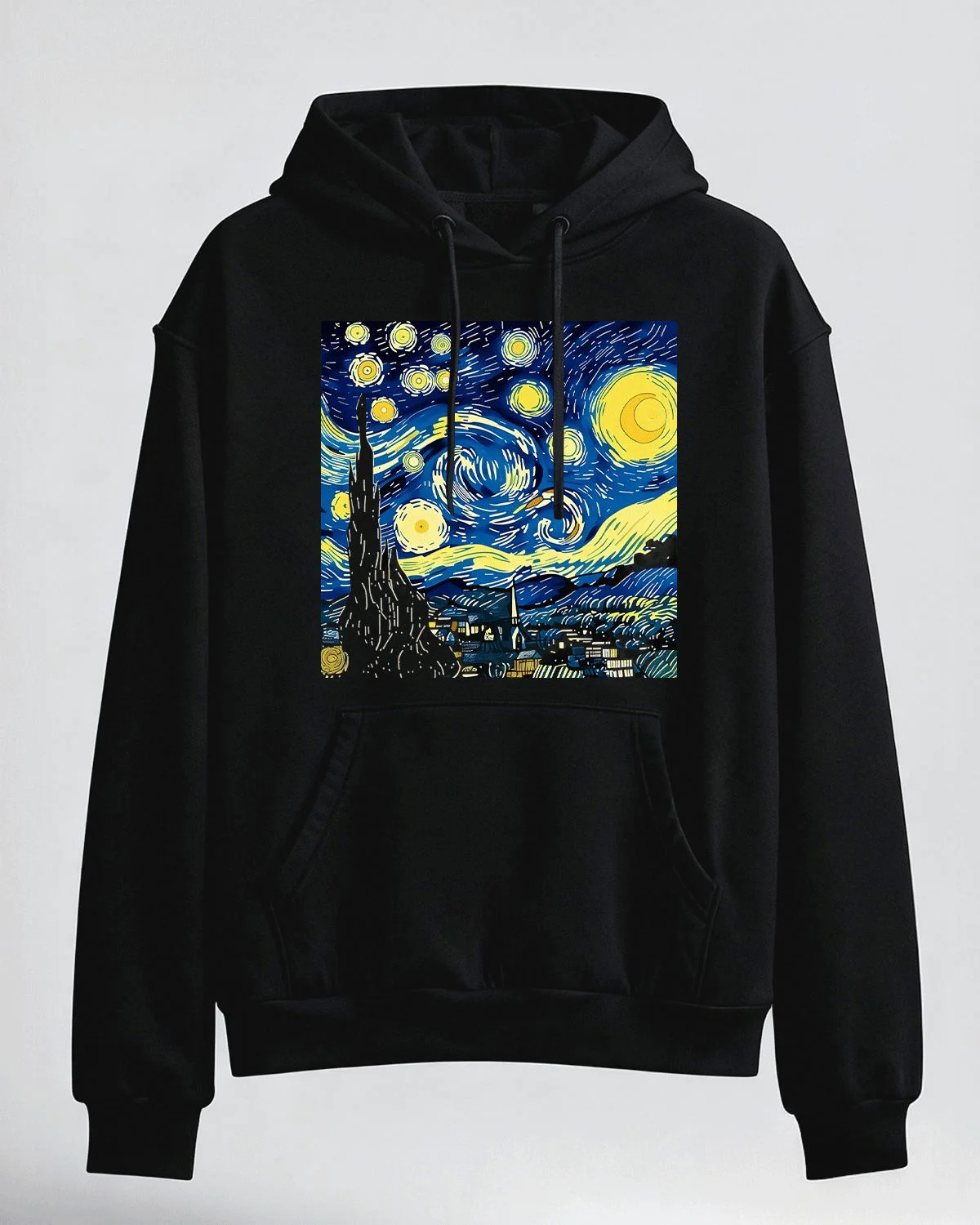 Starry Night Art Print Cozy Cotton Graphic Hoodie with Pocket-Vintage Artistic,Long Sleeve,Soft Fabric,Comfortable Fit