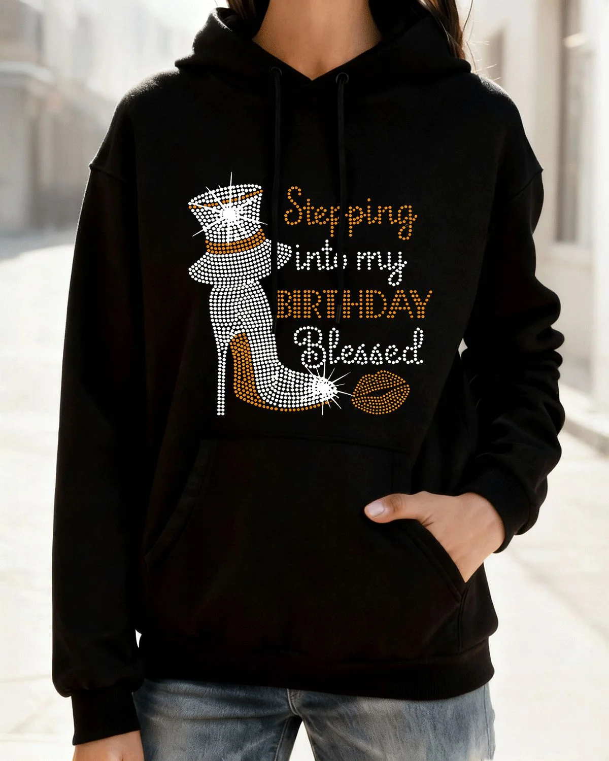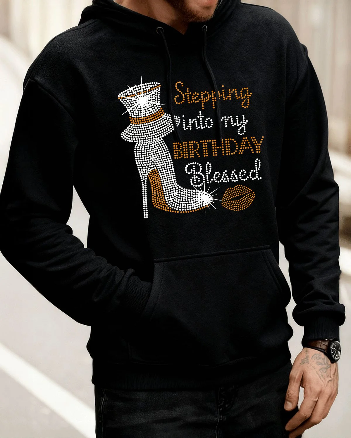 Stepping Into My Birthday Blessed High Heel Cozy Graphic Hoodie for Men and Women - Chic Artistic, Long Sleeve, Soft Fabric, Comfortable Fit
