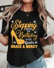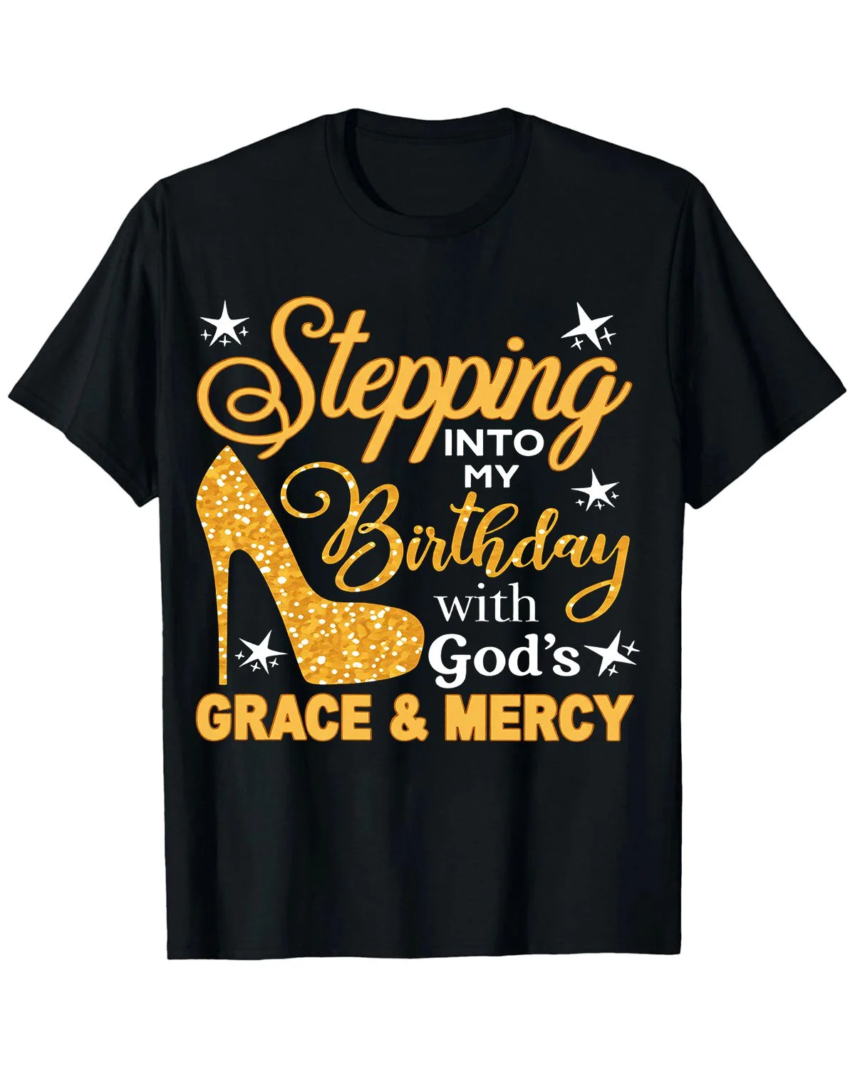Stepping Into My Birthday Mom Grace and Mercy Summer Cotton Graphic T Shirt - Chic Artistic, Short Sleeve, Soft Fabric, Comfortable Fit