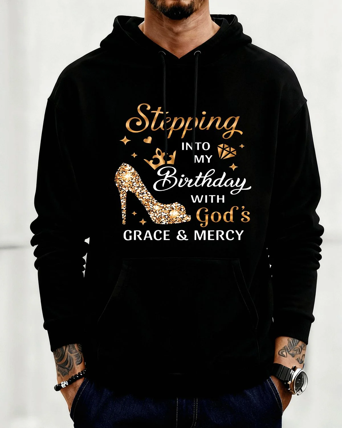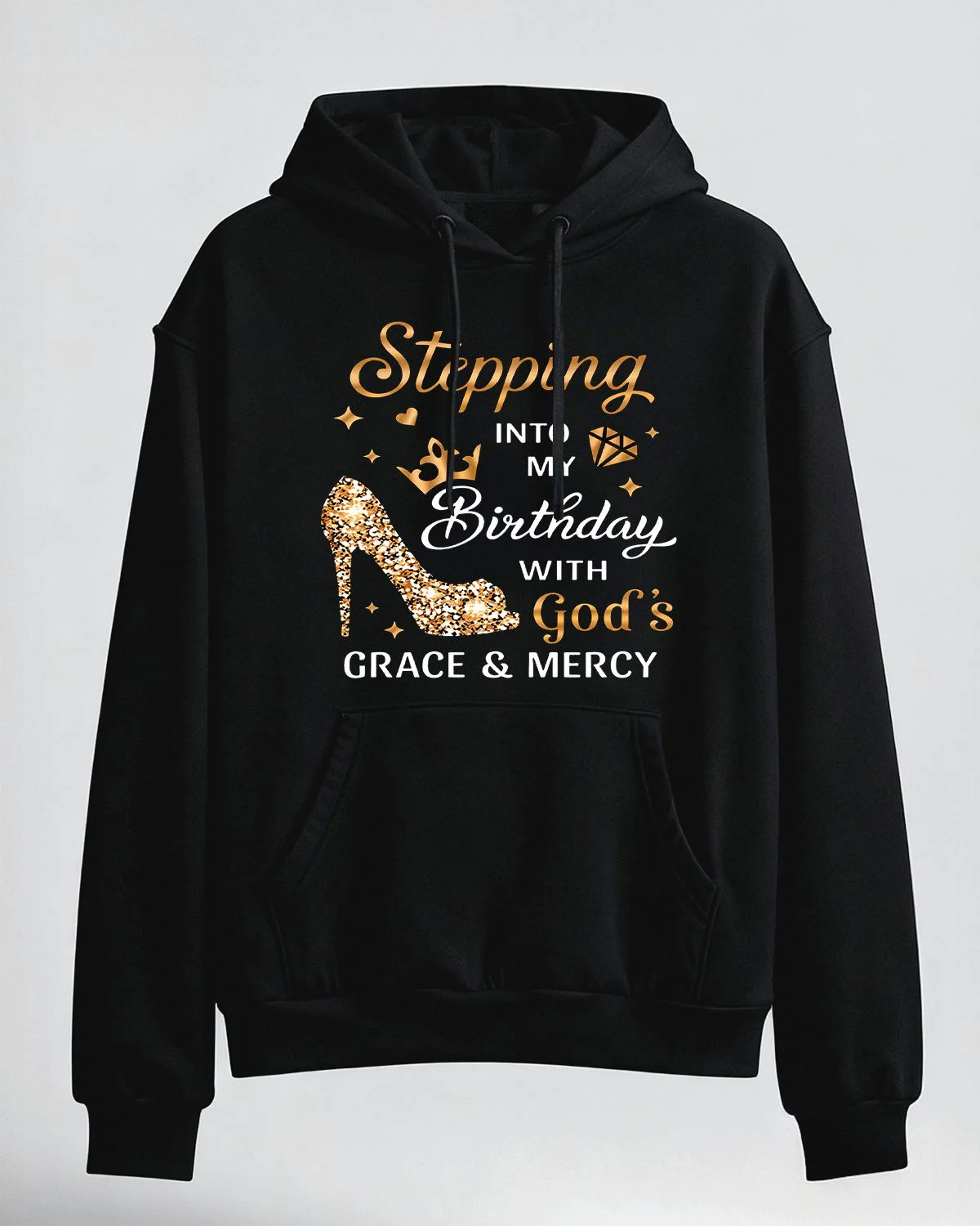 Stepping Into My Birthday With God's Grace and Mercy Cozy Graphic Hoodie for Men and Women - Chic Artistic, Long Sleeve, Soft Fabric, Comfortable Fit