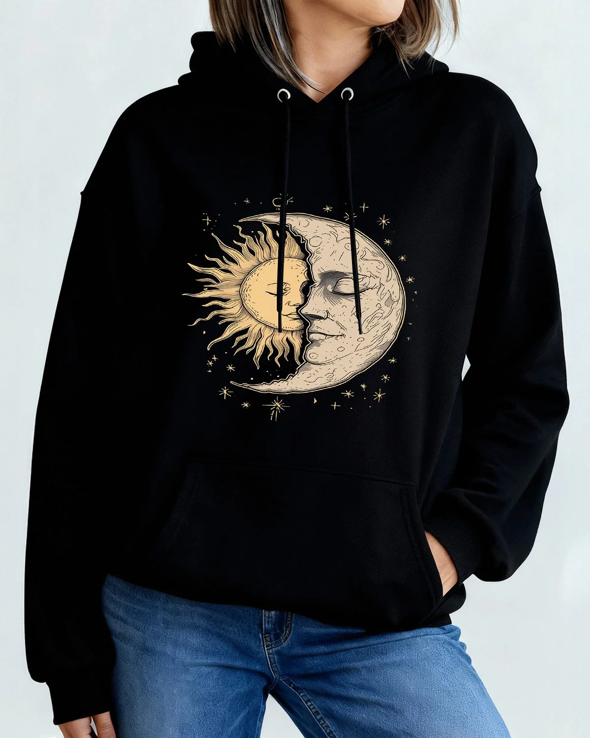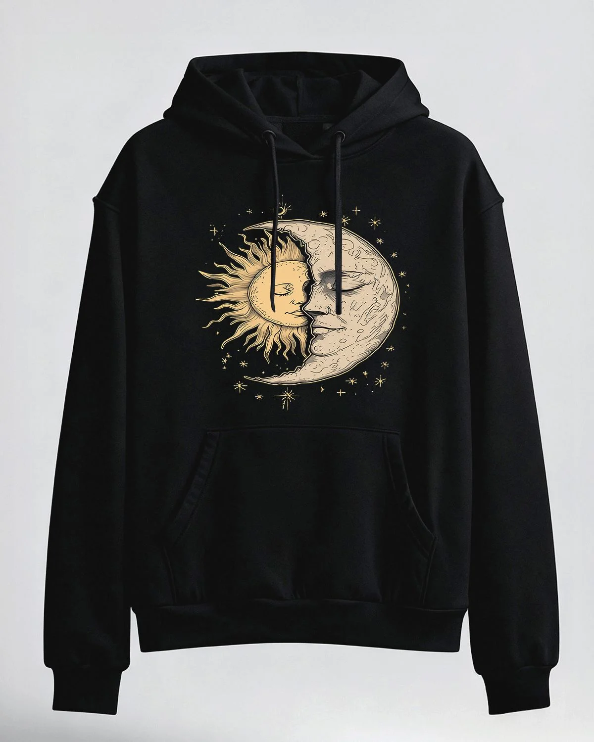 Sun and Moon Cosmic Art Cozy Graphic Hoodie for Men and Women - Vintage Artistic, Long Sleeve, Soft Fabric, Comfortable Fit
