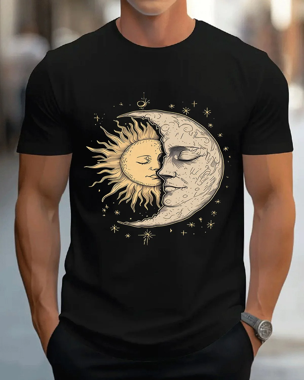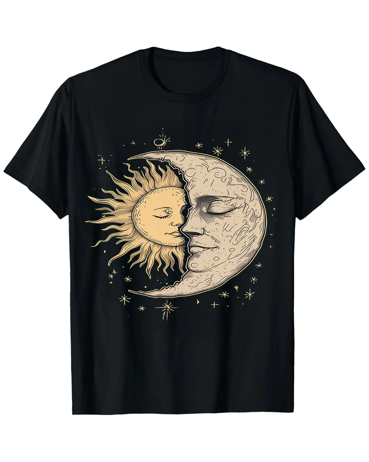 Sun and Moon Cosmic Art Summer Cotton Graphic T Shirt - Vintage Artistic, Short Sleeve, Soft Fabric, Comfortable Fit