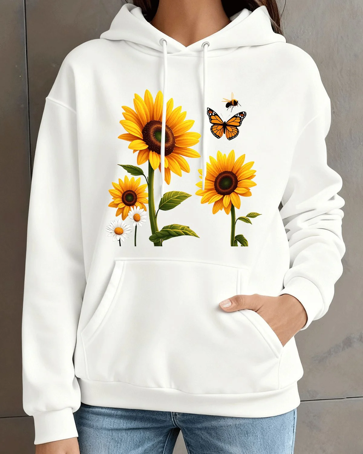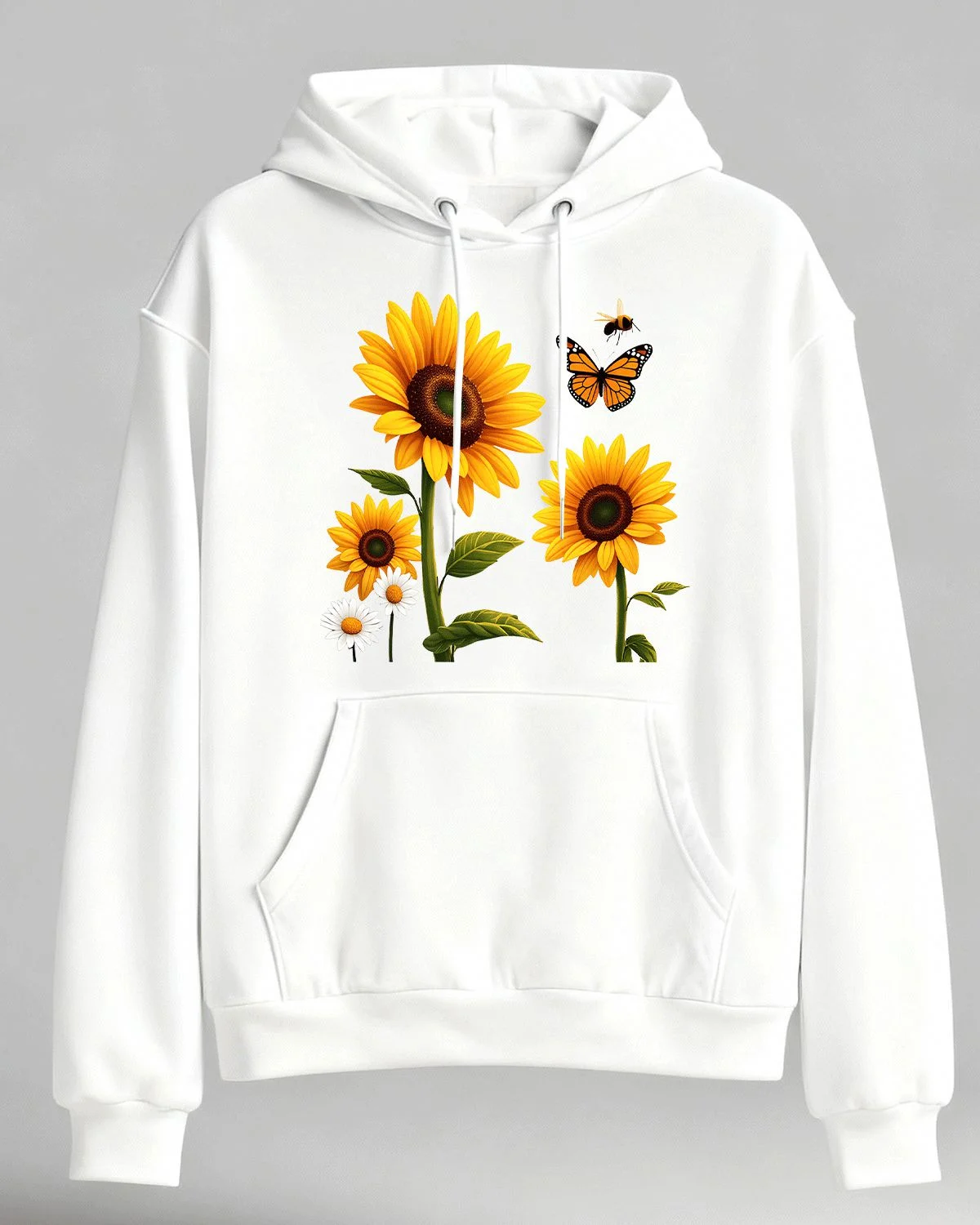 Sunflowers Butterflies and Bees Summer Cozy Graphic Hoodie - Casual Artistic, Long Sleeve, Soft Fabric, Comfortable Fit