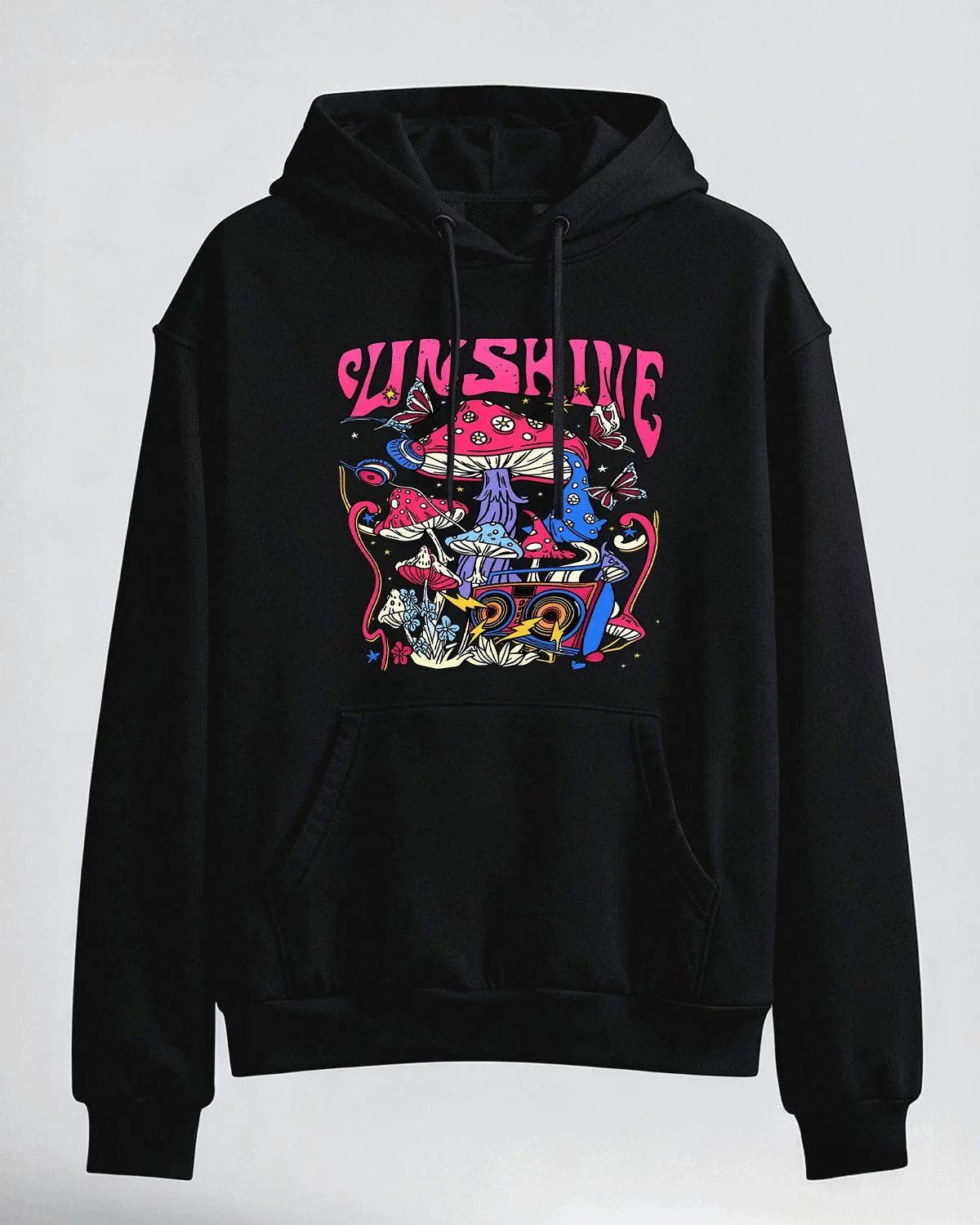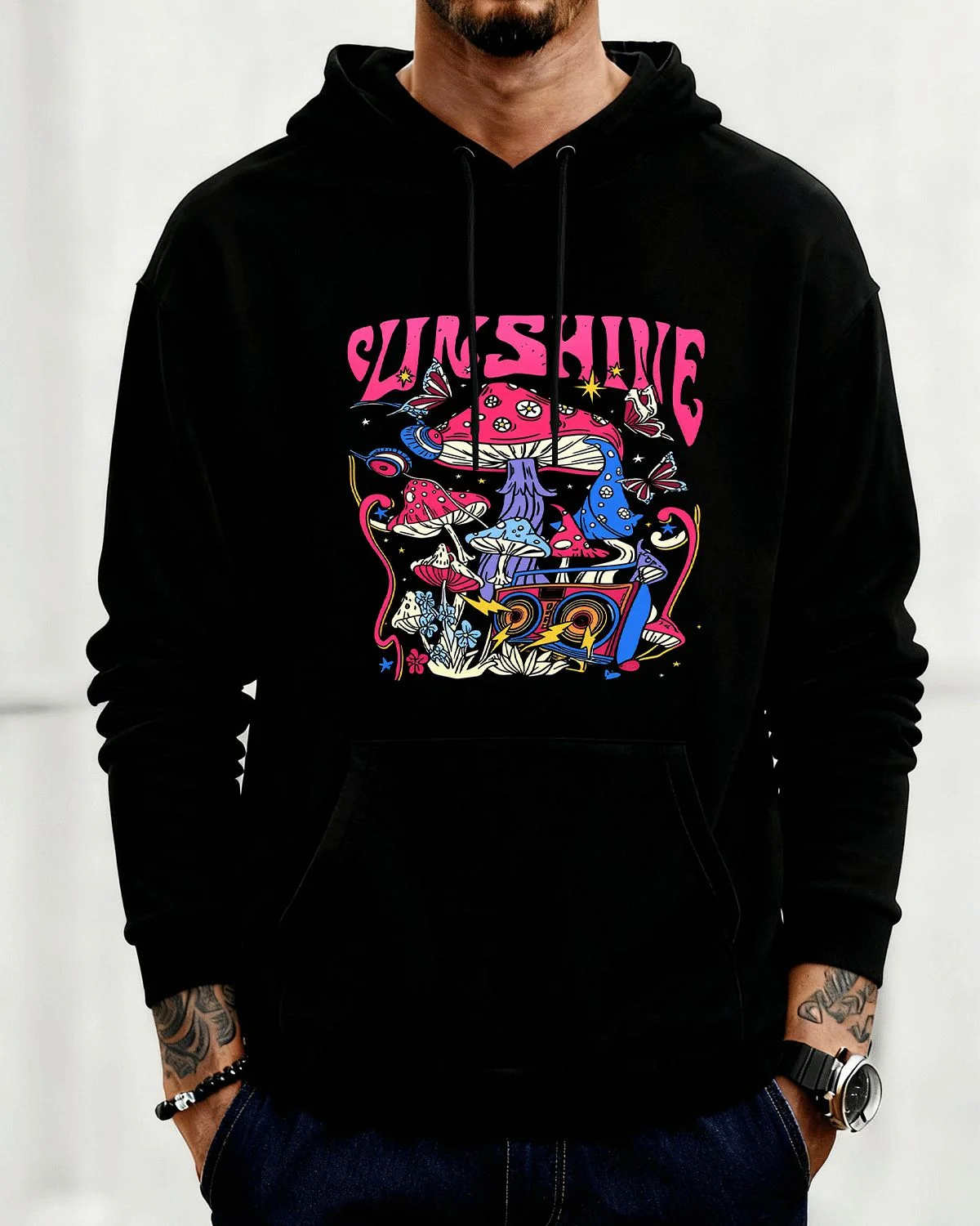 Sunshine Mushrooms and Butterflies Cozy Cotton Graphic Hoodie with Pocket-Vintage Artistic,Long Sleeve,Soft Fabric,Comfortable Fit