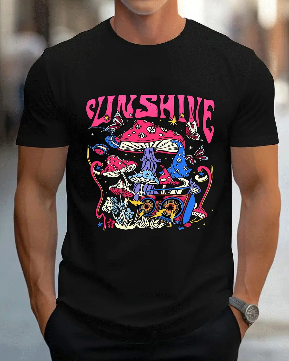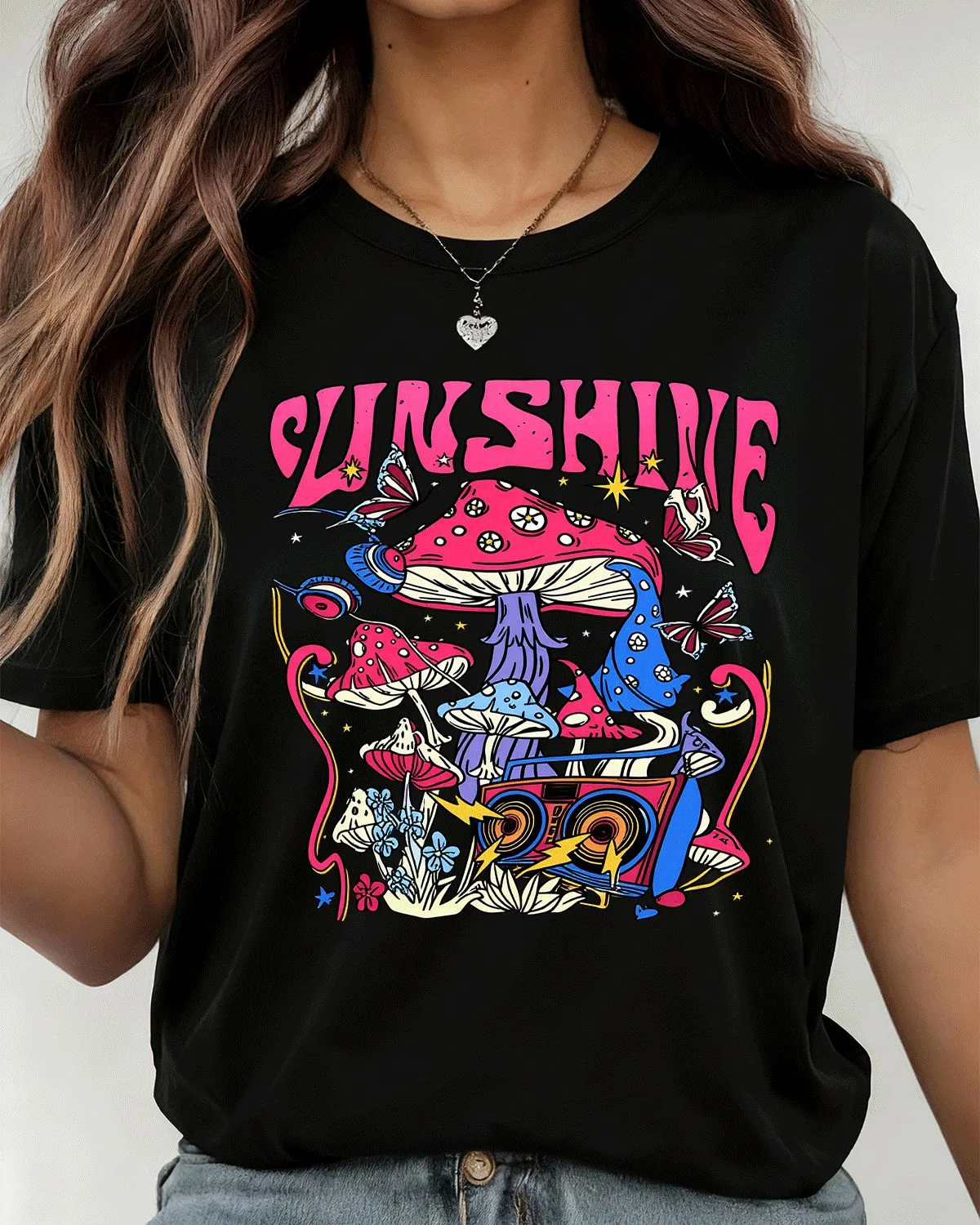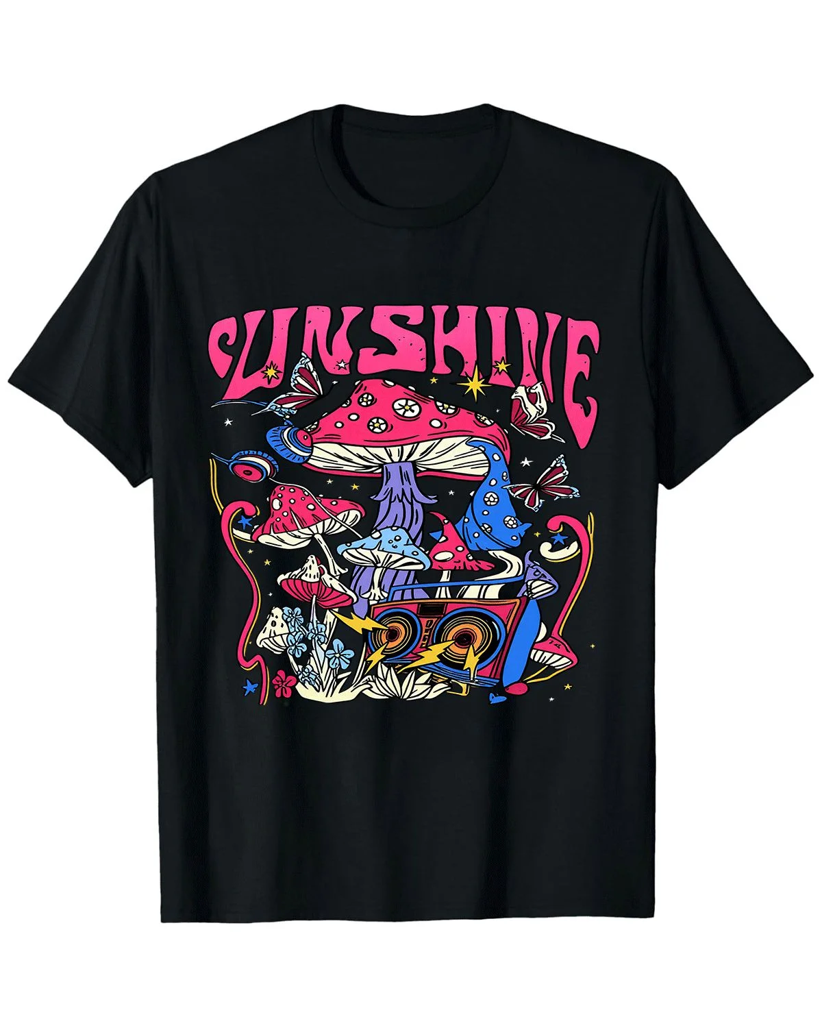Sunshine Mushrooms and Butterflies Summer Cotton Graphic T Shirt - Vintage Artistic,Short Sleeve,Soft Fabric,Comfortable Fit