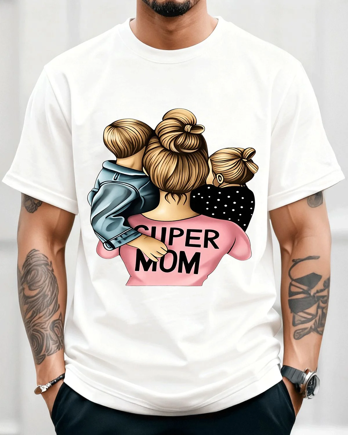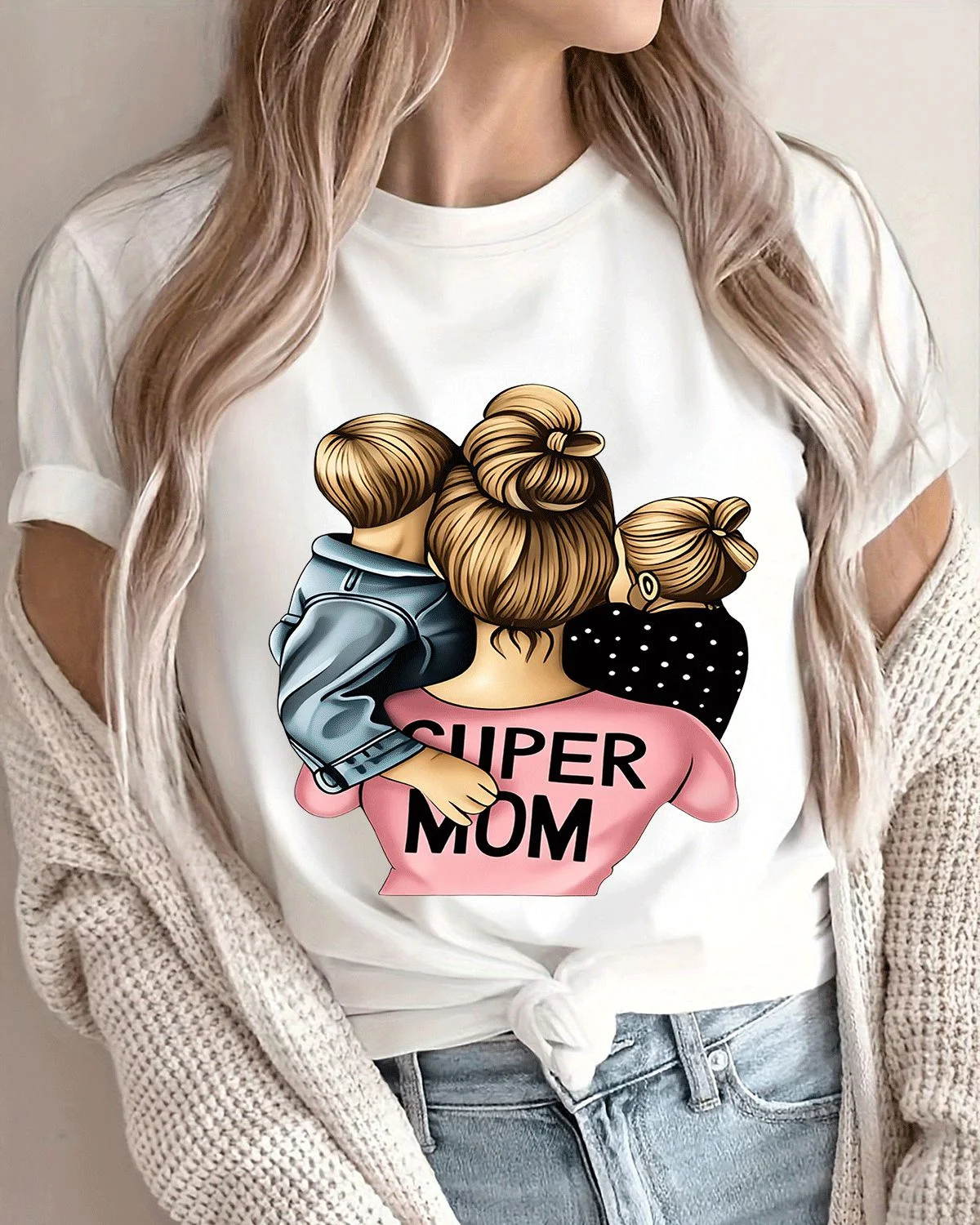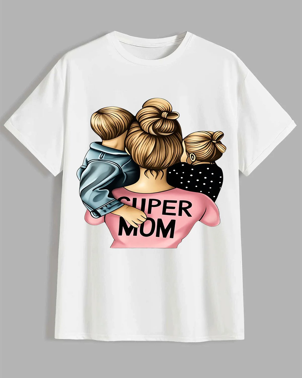 Super Mom With Kids Summer Cotton Graphic T Shirt - Casual Chic, Short Sleeve, Soft Fabric, Comfortable Fit