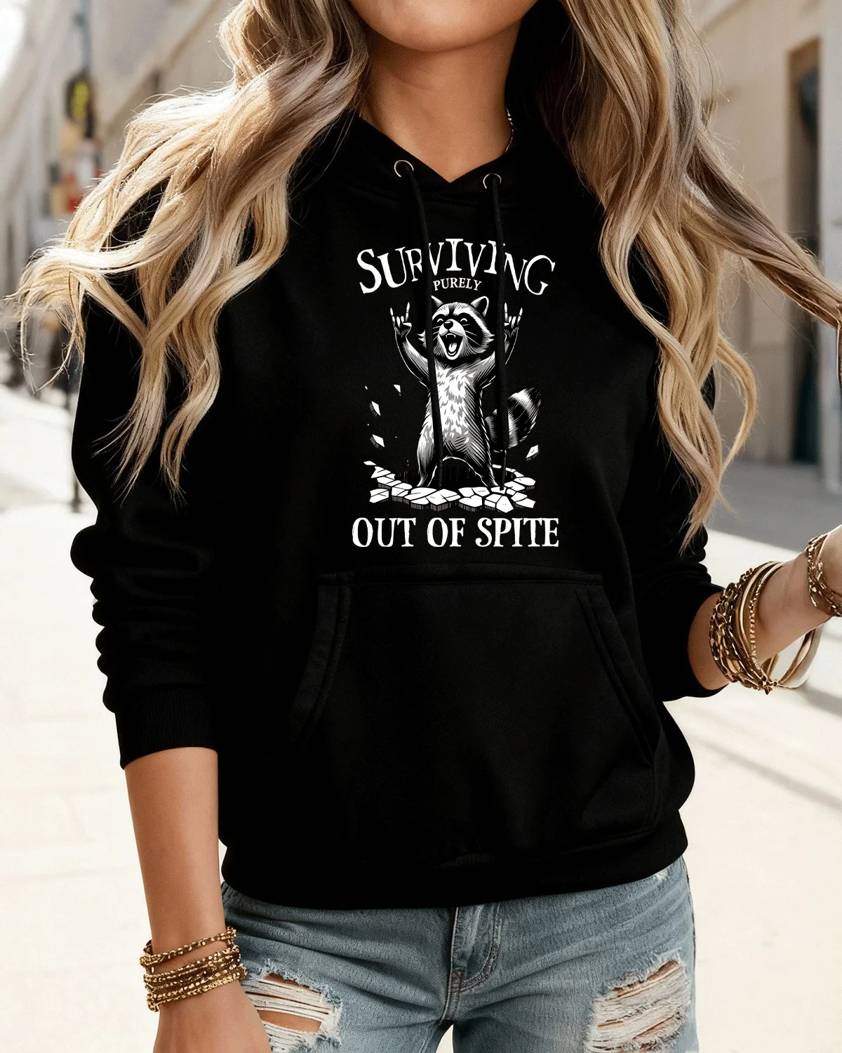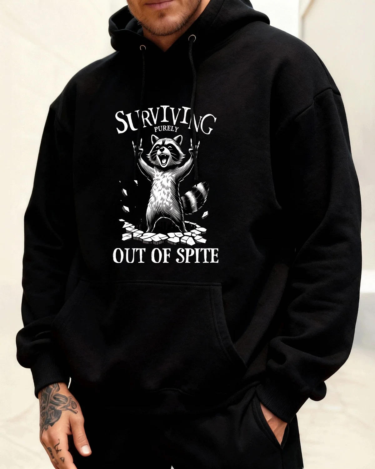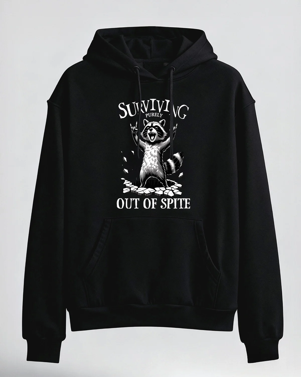 Surviving Purely Out of Spite Raccoon Cozy Cotton Graphic Hoodie-Casual Funny,Long Sleeves,Soft Fabric,Comfortable Fit