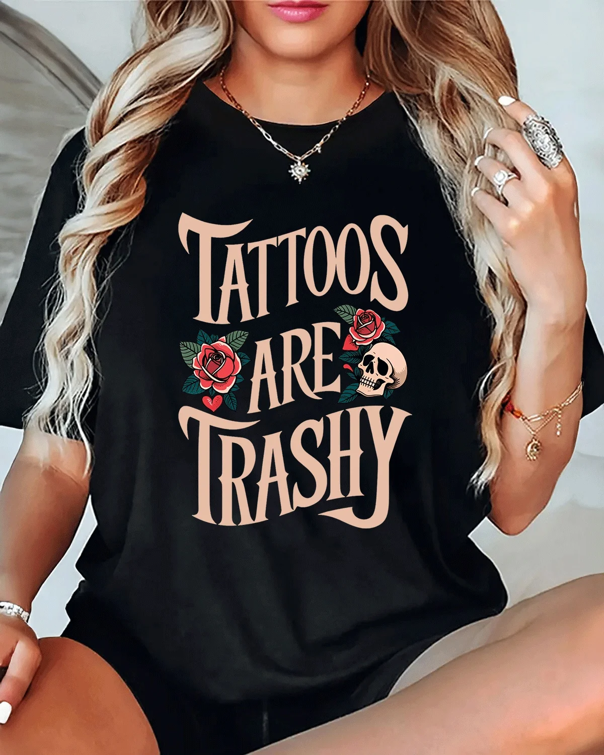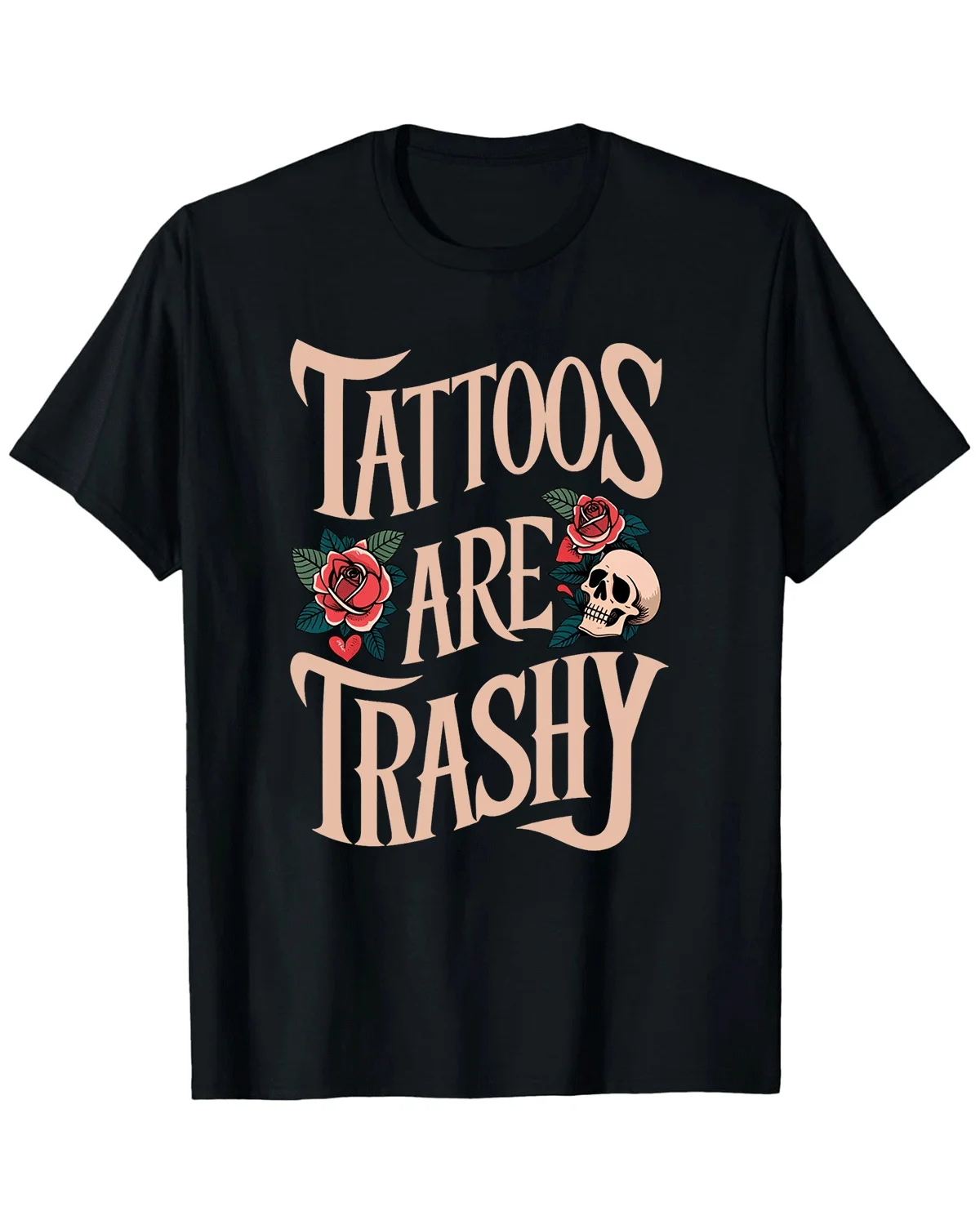 Tattoos Are Trashy Roses and Skull Summer Cotton Graphic T Shirt-Vintage Retro,Short Sleeve,Soft Fabric,Comfortable Fit