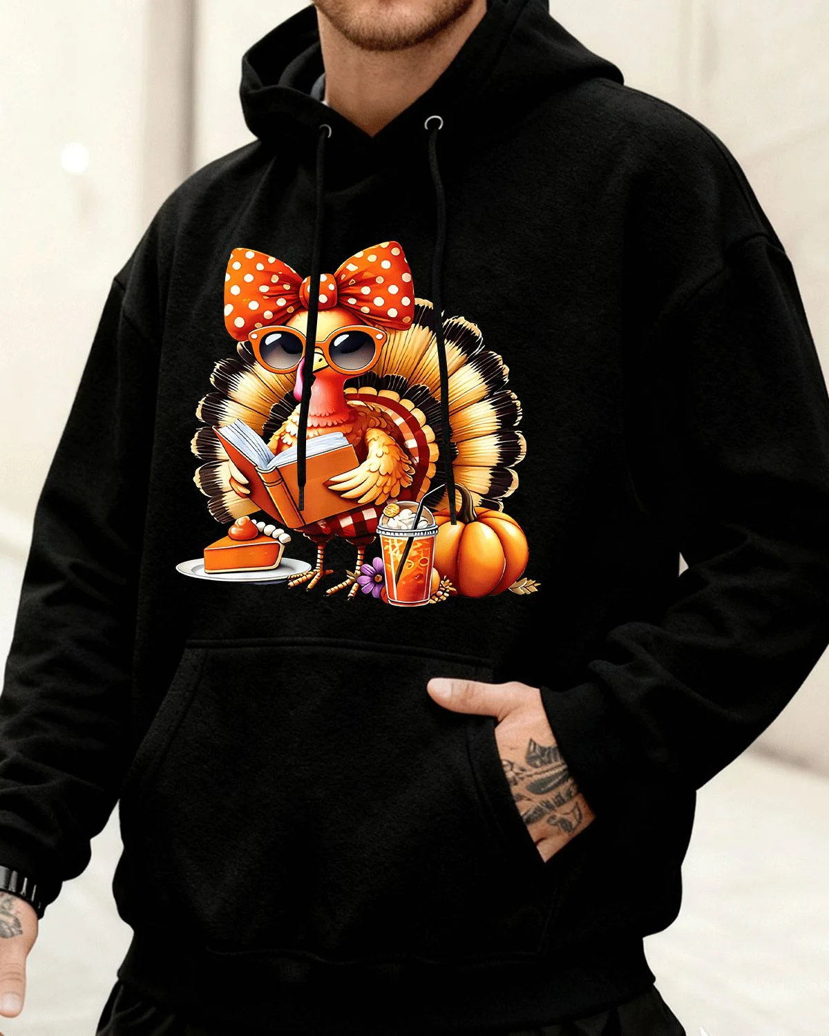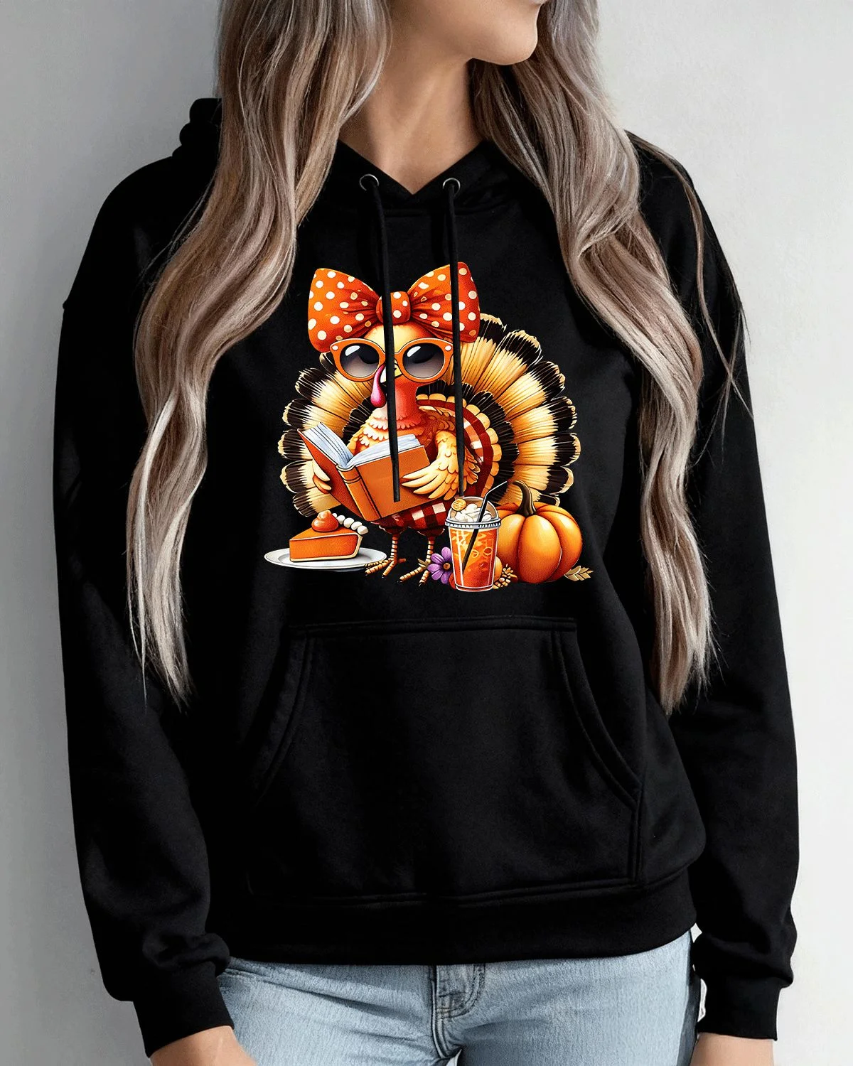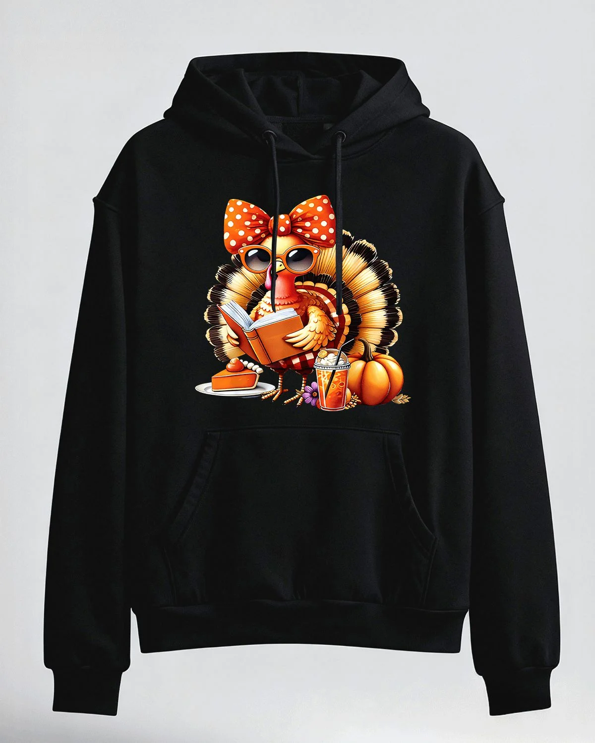Thanksgiving Turkey Reading Book with Pie Summer Cozy Graphic Hoodie-Casual Funny,Long Sleeve,Soft Fabric,Comfortable Fit