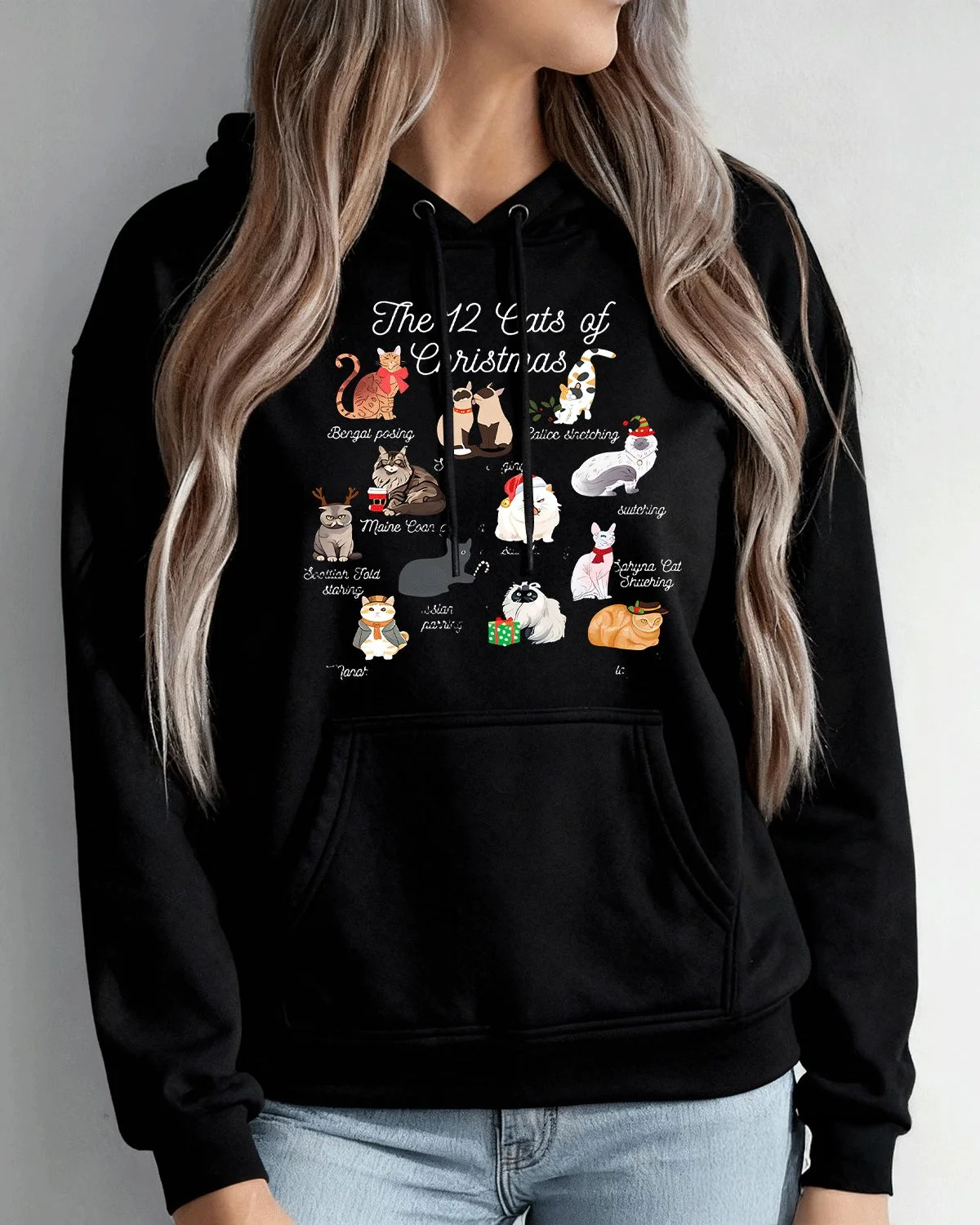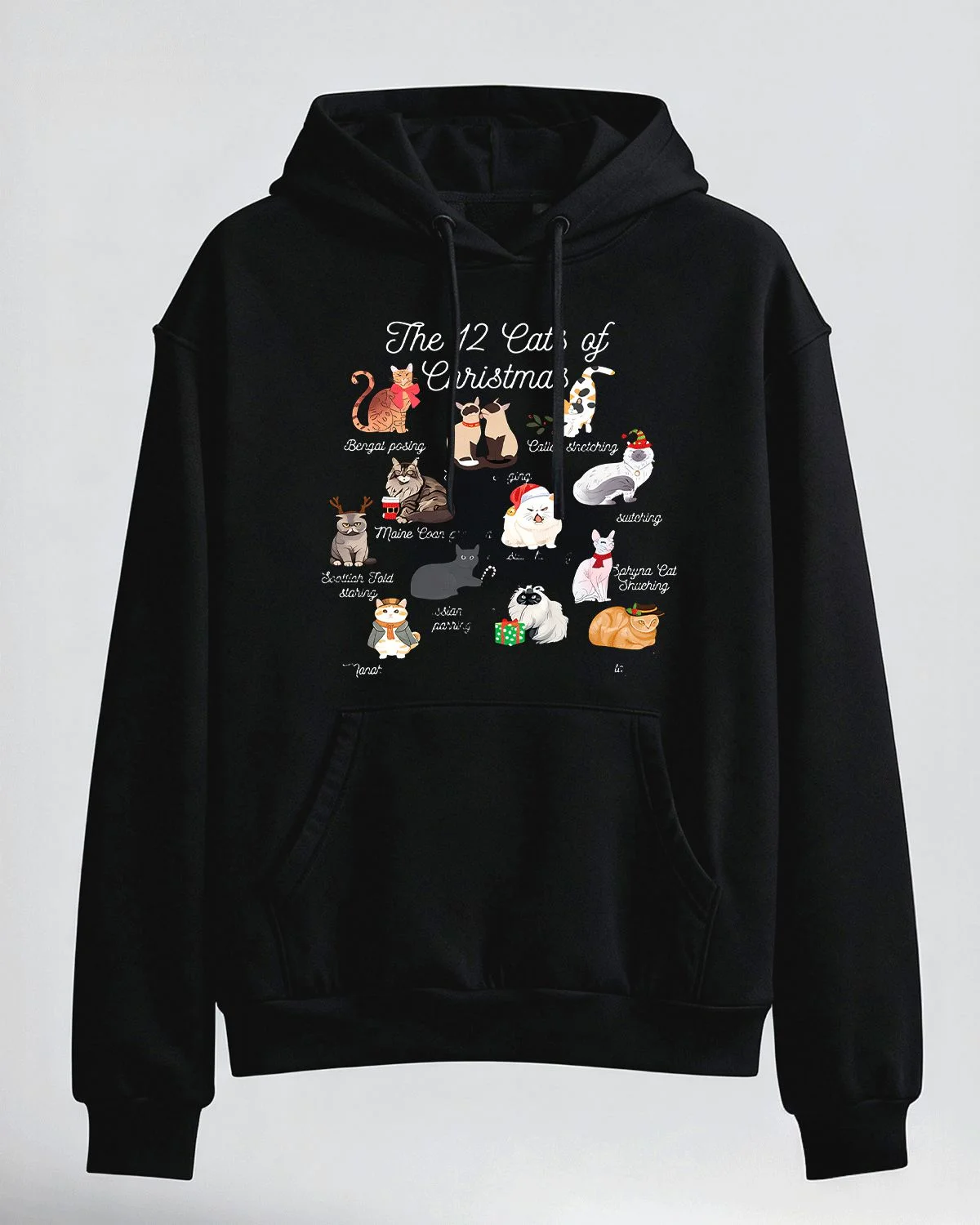 The 12 Cats of Christmas Cozy Graphic Hoodie for Men and Women - Funny Casual, Long Sleeve, Soft Fabric, Comfortable Fit