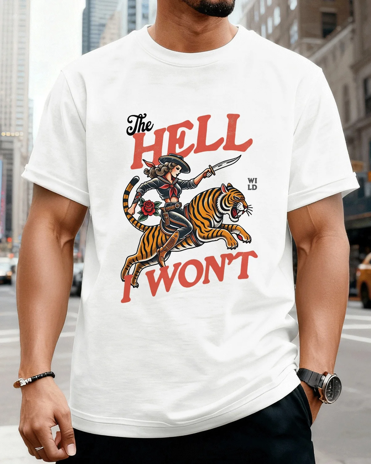 The Hell I Won't Wild Tiger Rider Summer Cotton Graphic T Shirt-Vintage Retro,Short Sleeve,Soft Fabric,Comfortable Fit