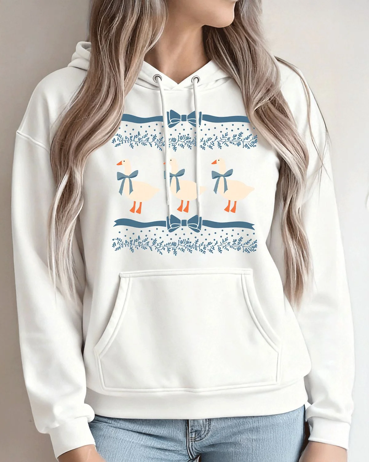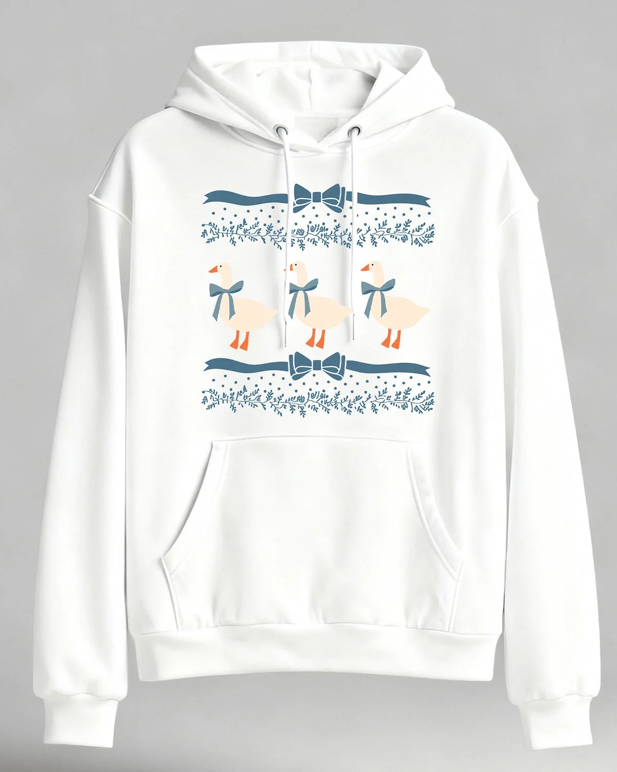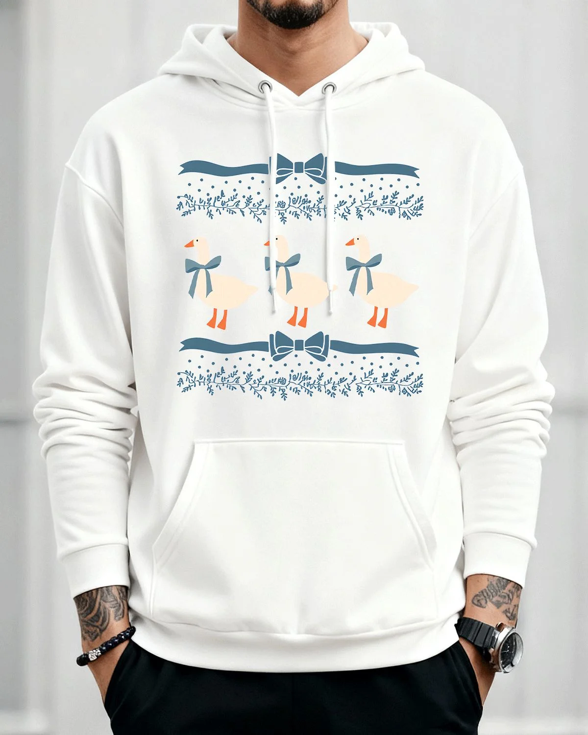 Three Geese with Blue Bows Cozy Graphic Hoodie for Men and Women - Vintage Artistic, Long Sleeve, Soft Fabric, Comfortable Fit