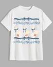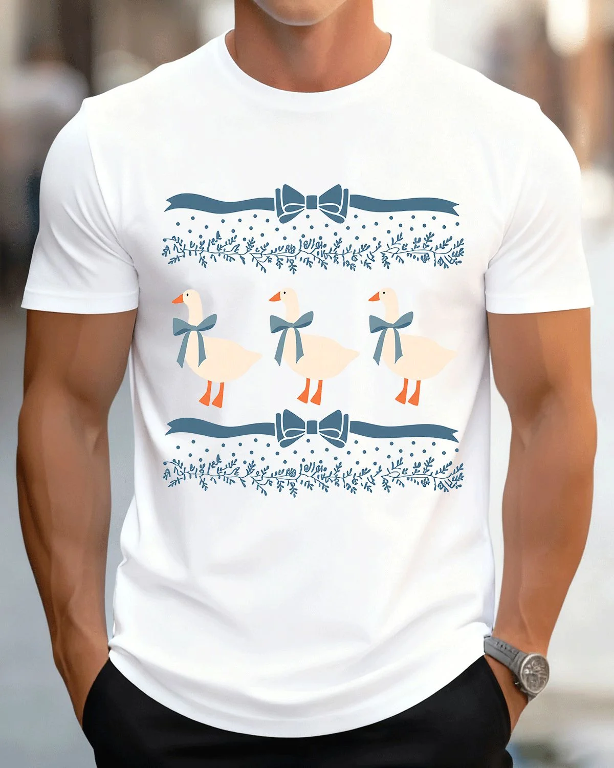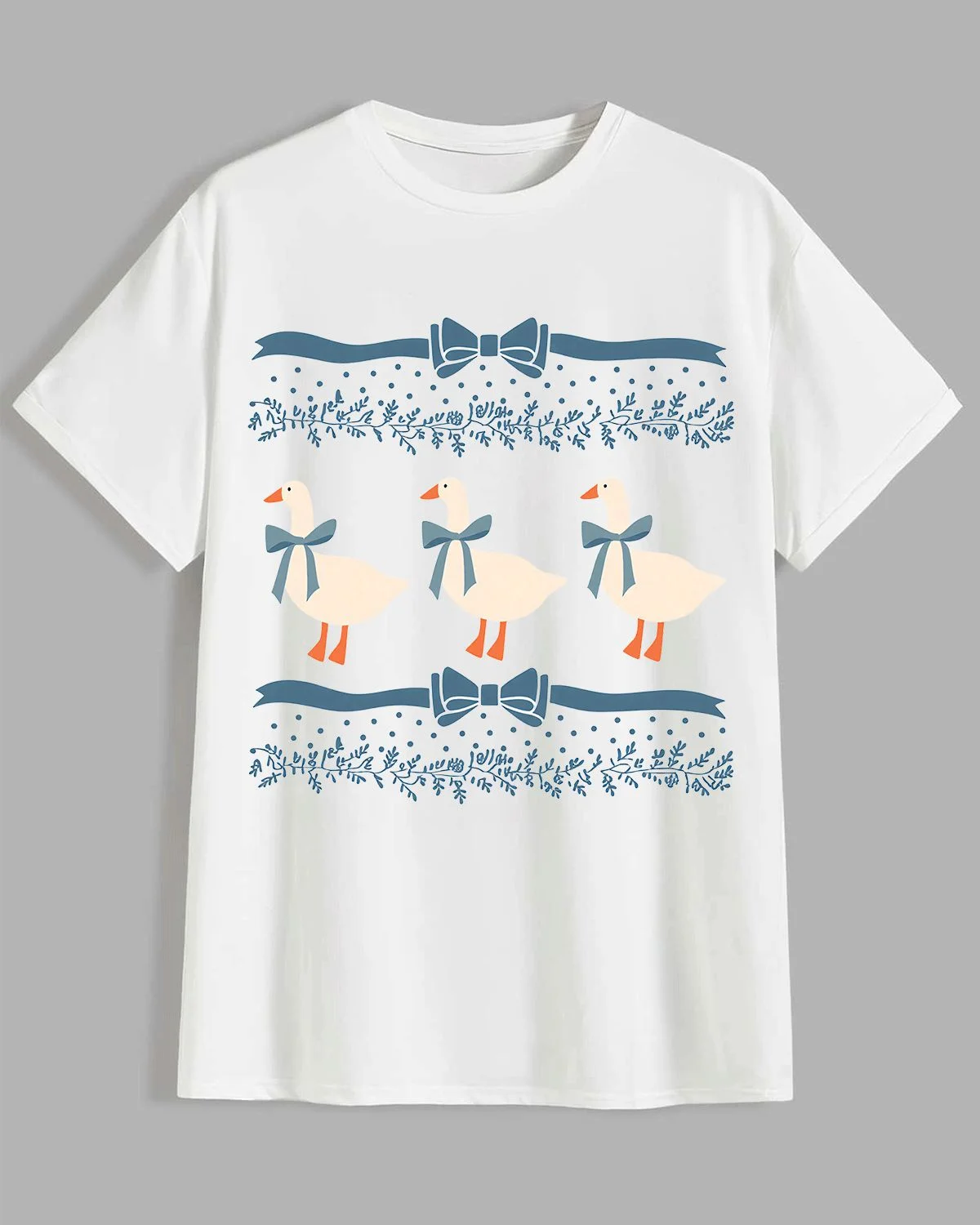 Three Geese with Blue Bows Summer Cotton Graphic T Shirt - Vintage Artistic, Short Sleeve, Soft Fabric, Comfortable Fit