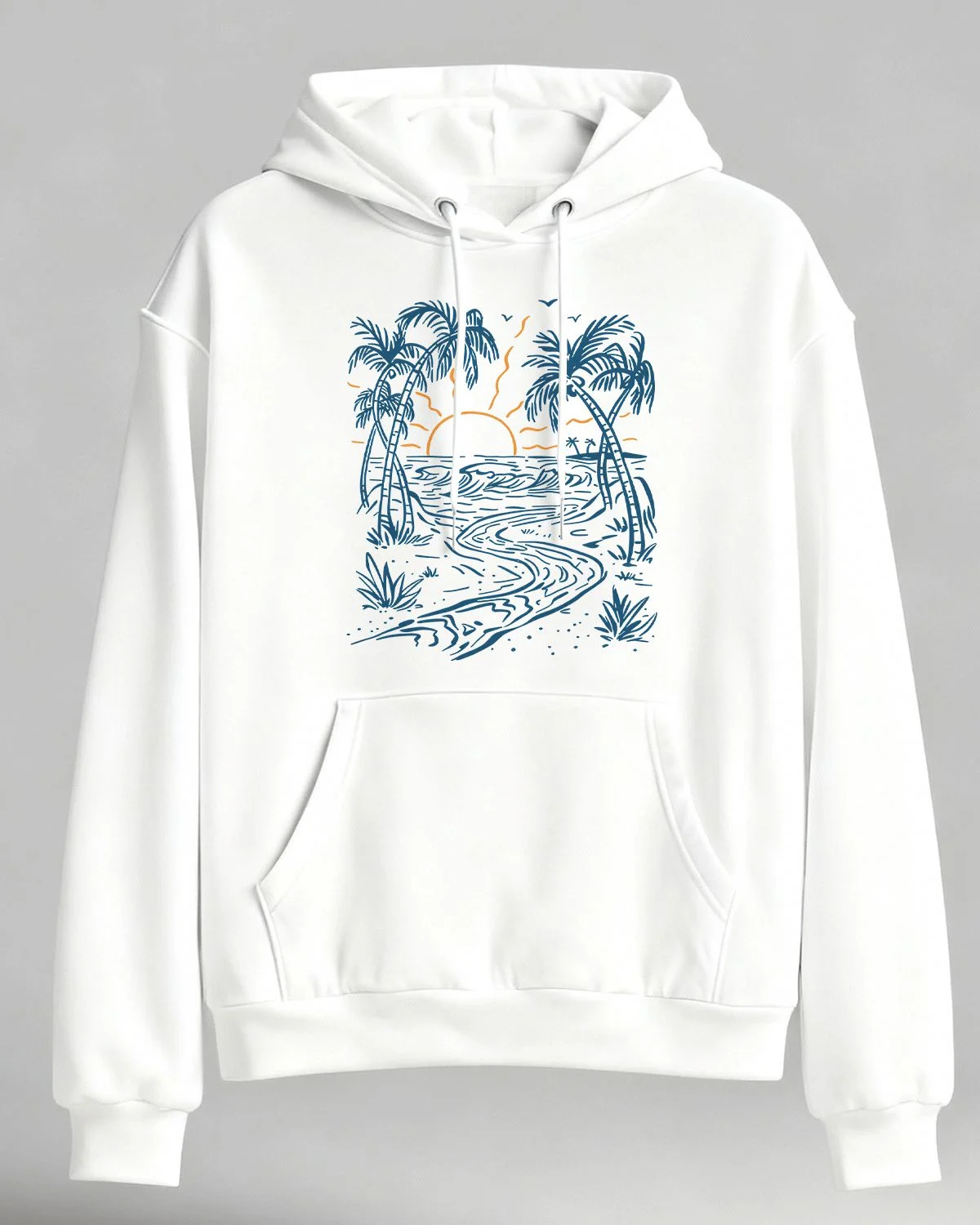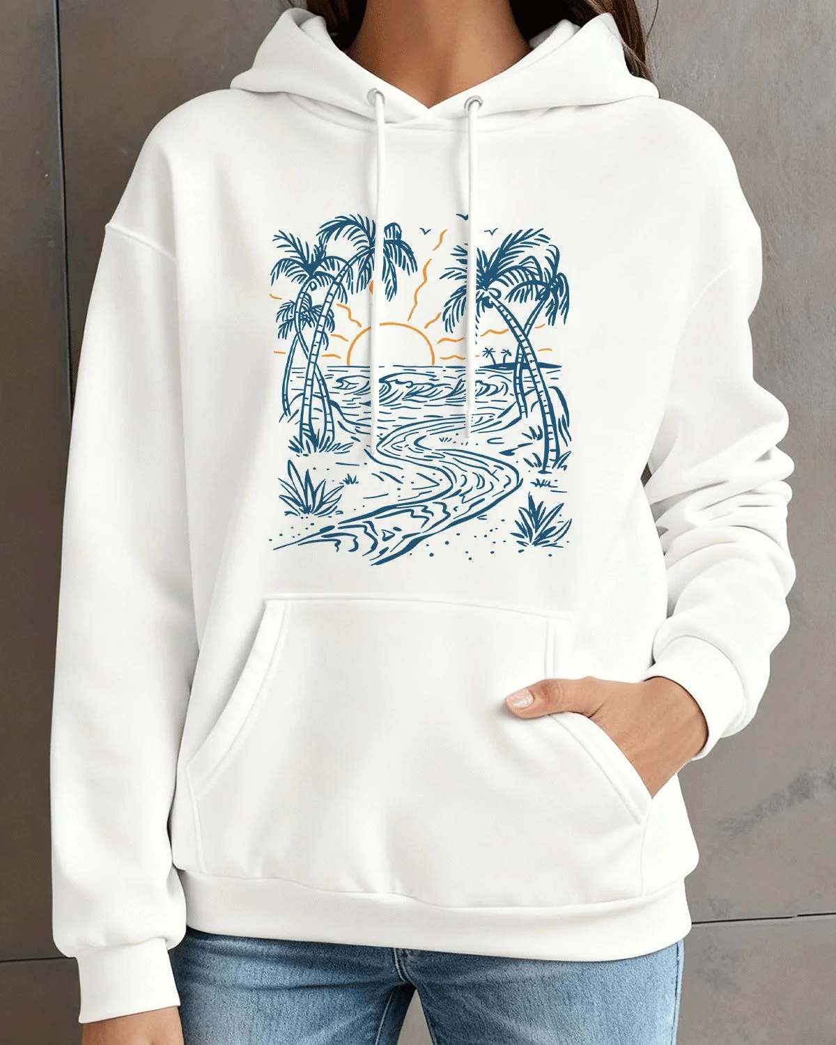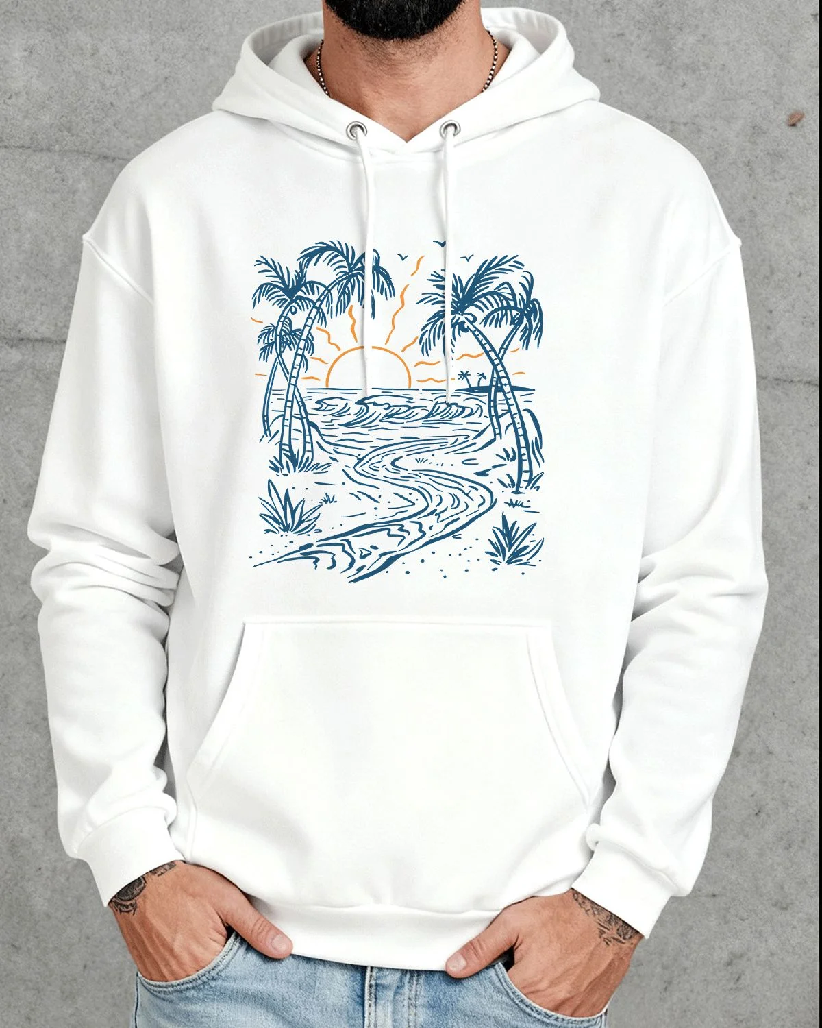 Tropical Beach Sunset Cozy Cotton Graphic Hoodie with Pocket-Casual Vintage,Long Sleeve,Soft Fabric,Comfortable Fit