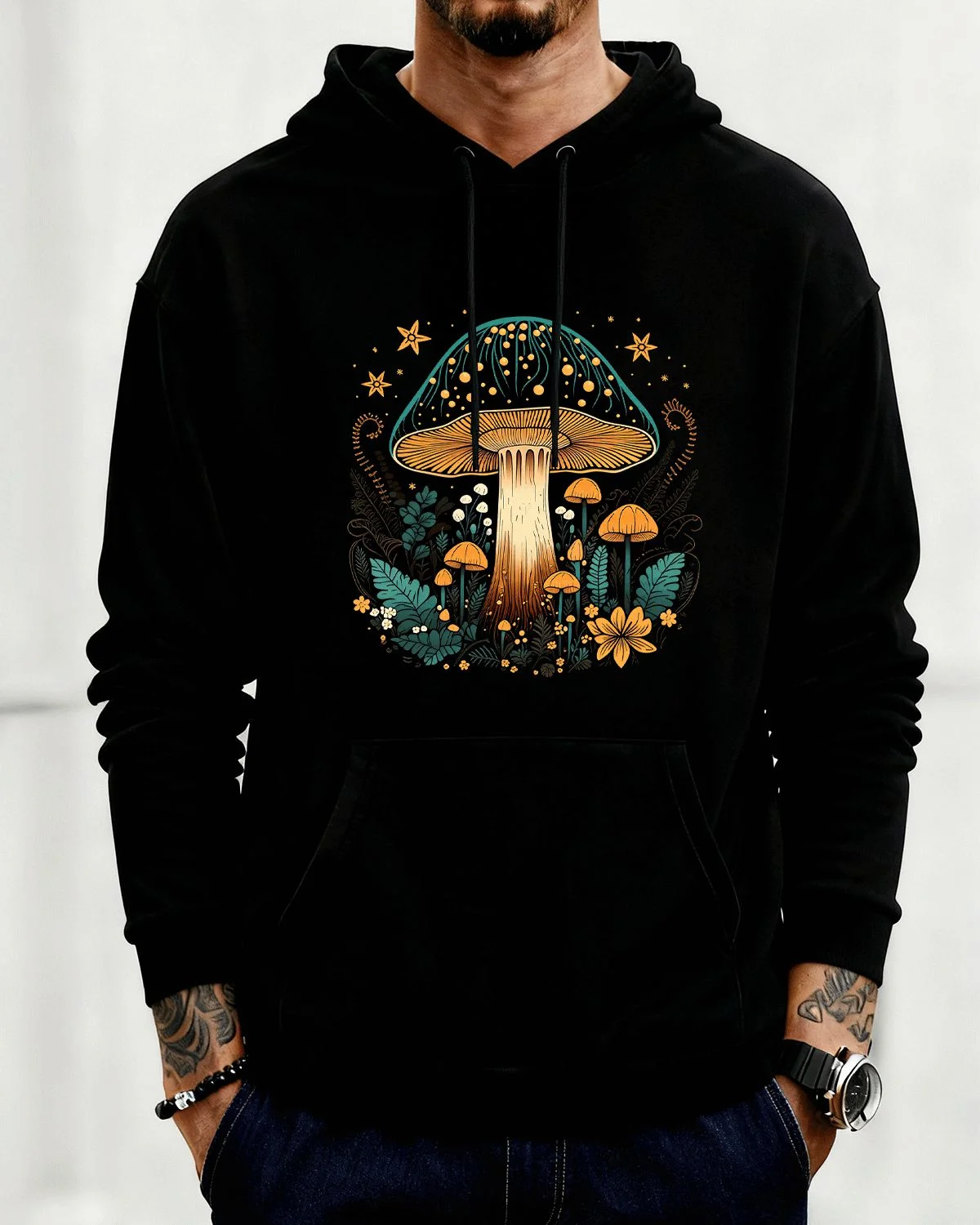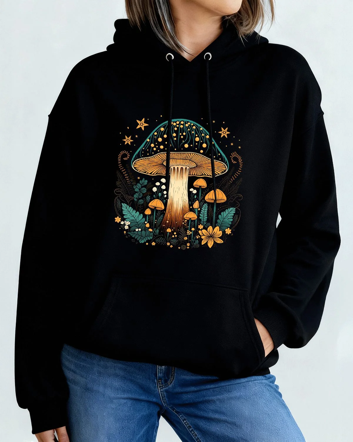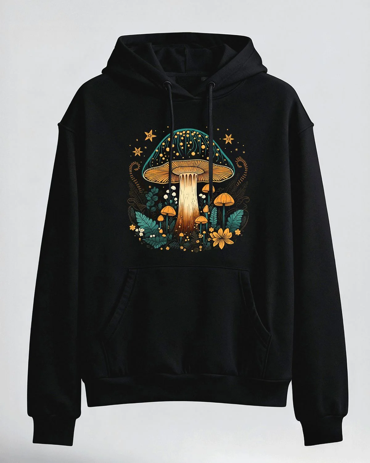 Whimsical Forest Mushroom Art Cozy Cotton Graphic Hoodie with Pocket-Artistic Boho,Long Sleeve,Soft Fabric,Comfortable Fit