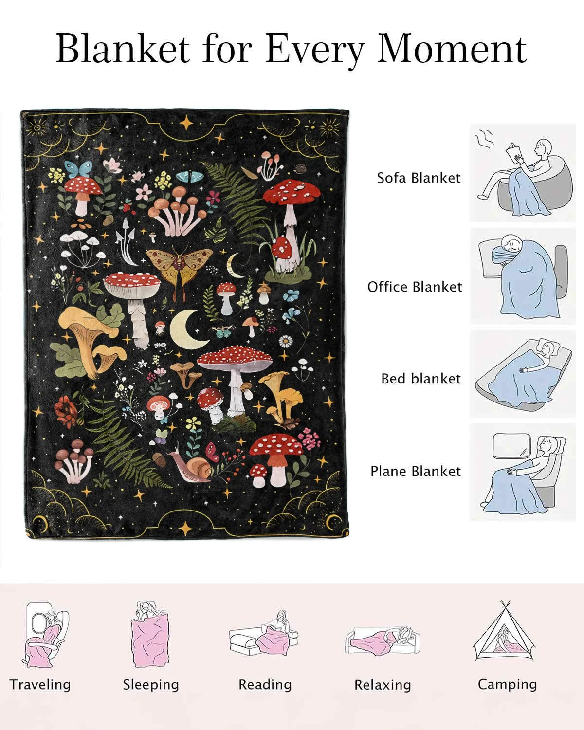 Whimsical Moonlit Mushroom Forest Nature Gift Blanket-Cozy Cute,Plush,Warm,Lightweight,For Couch,Bedroom Use