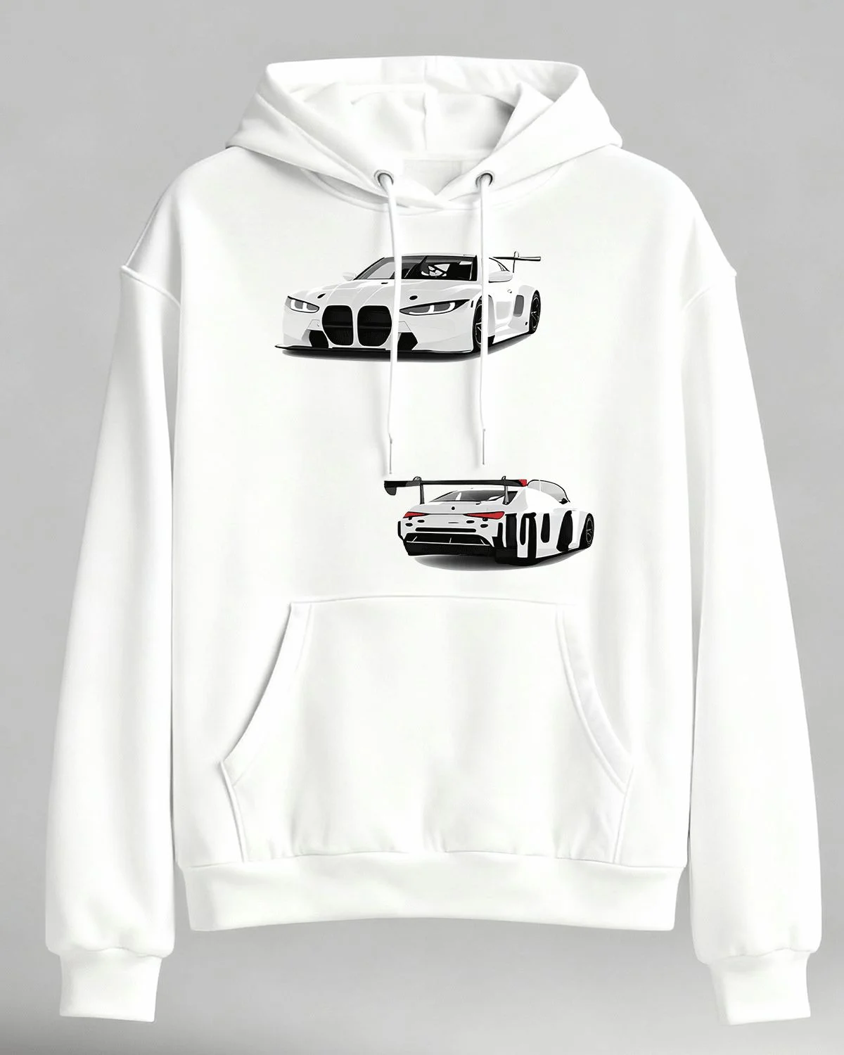 White Sports Car Front and Rear View Cozy Graphic Hoodie for Men and Women - Sporty Modern, Long Sleeve, Soft Fabric, Comfortable Fit