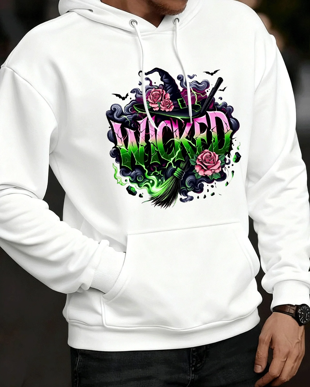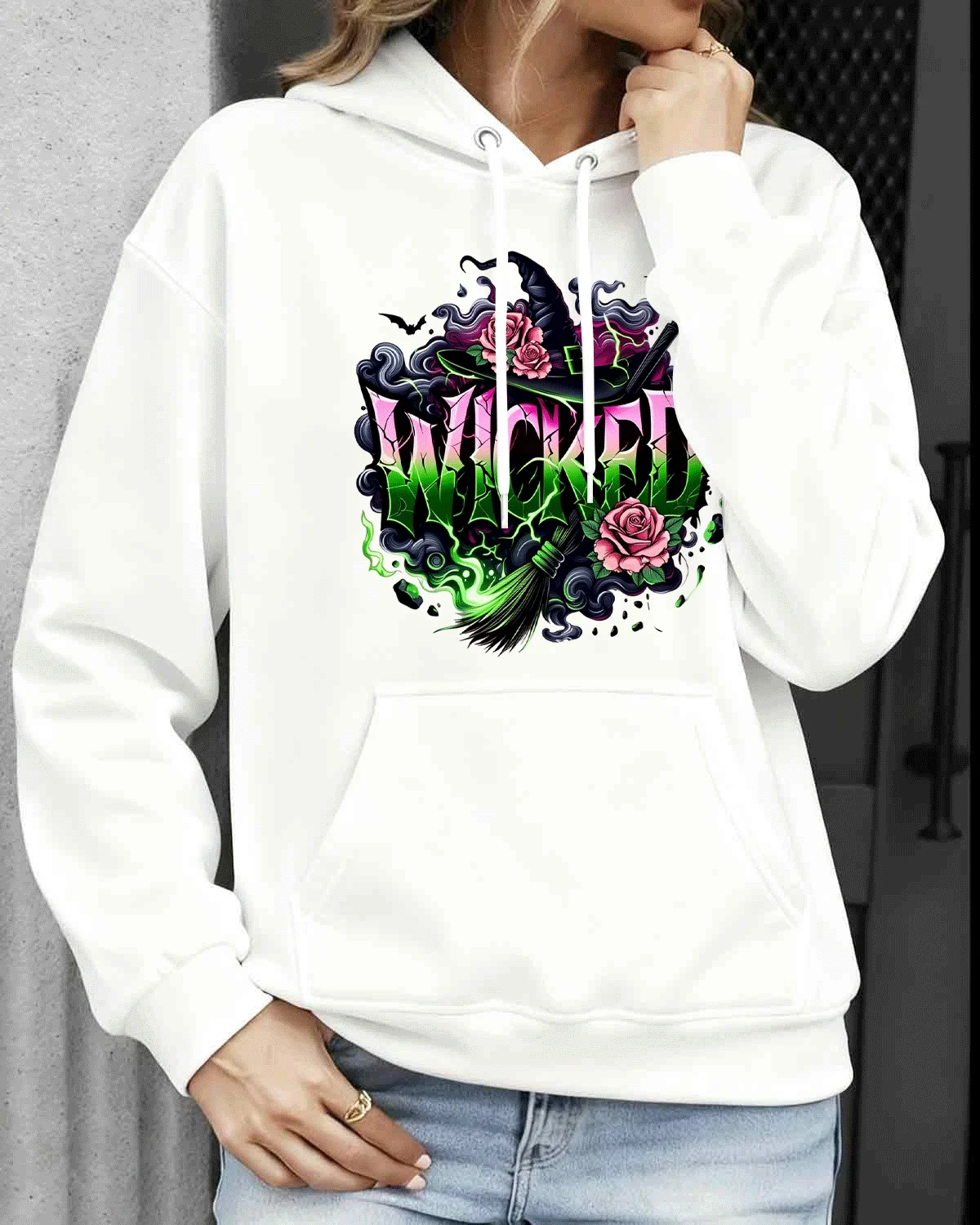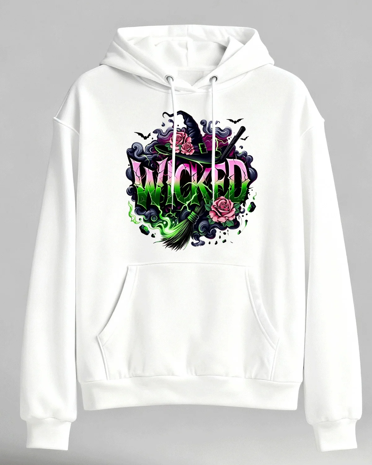 Wicked Witch Hat Roses and Broom Cozy Cotton Graphic Hoodie-Vintage Artistic,Long Sleeves,Soft Fabric,Comfortable Fit