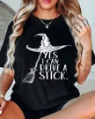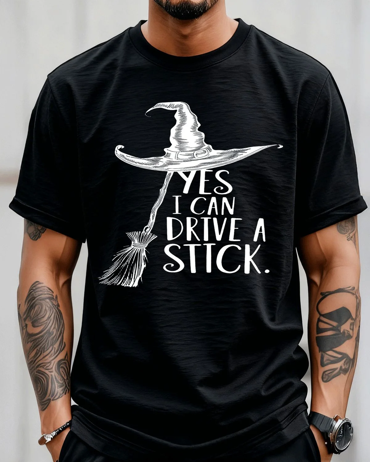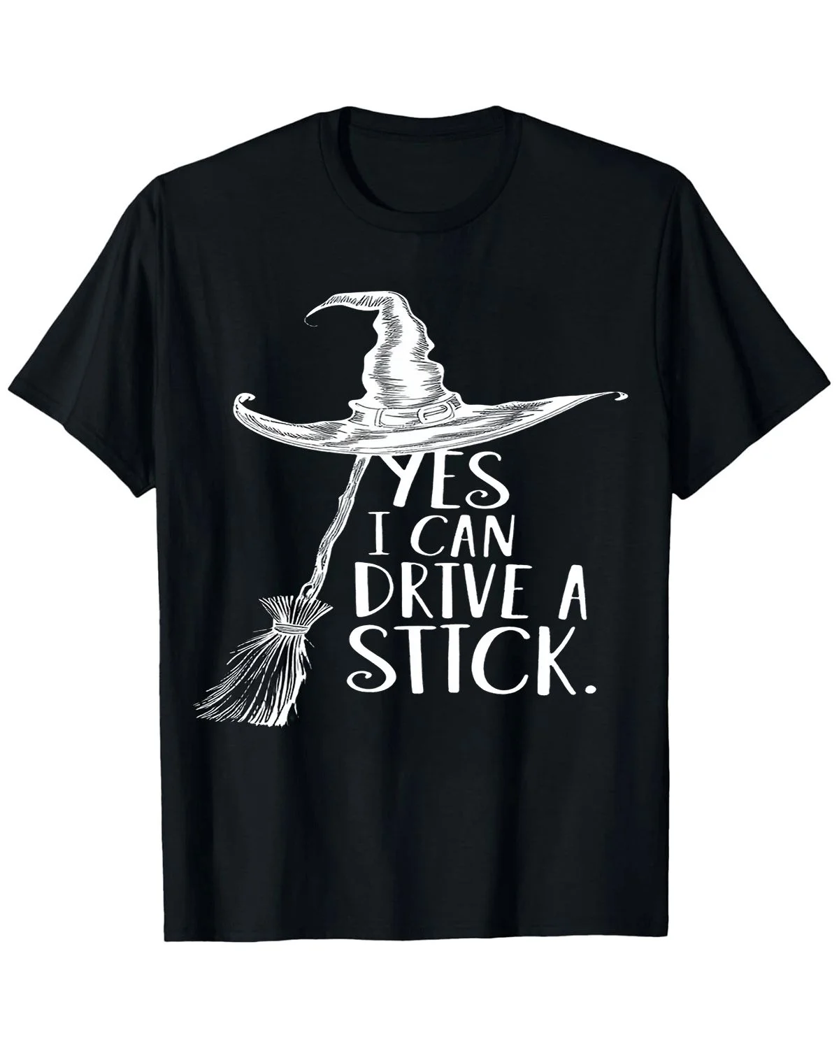 Yes I Can Drive A Stick Witch Hat and Broom Summer Cotton Graphic T Shirt-Casual Funny,Short Sleeve,Soft Fabric,Comfortable Fit